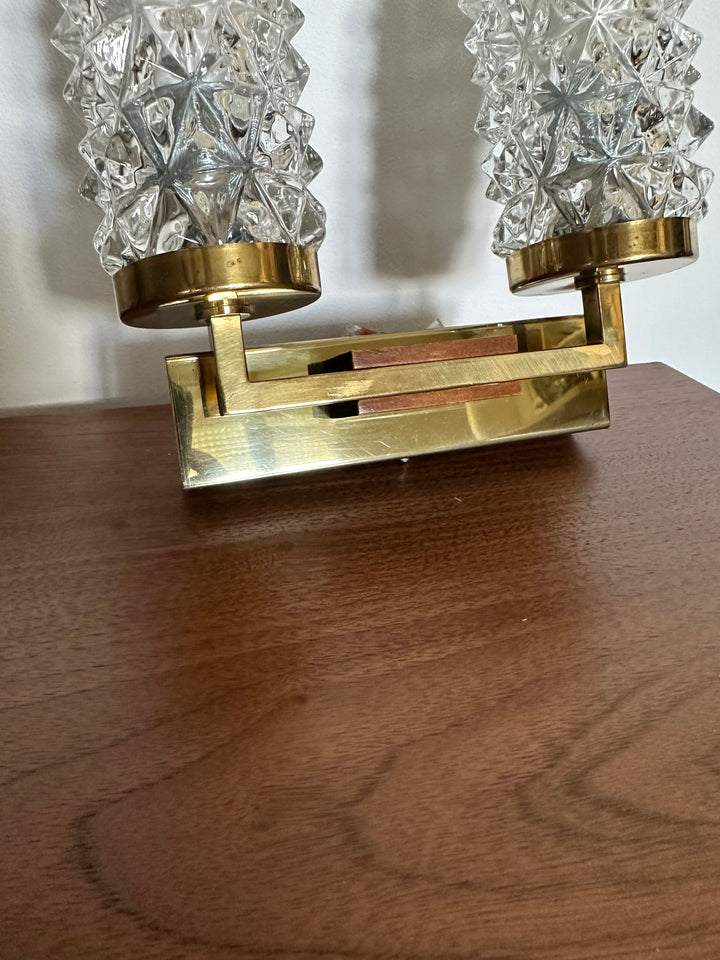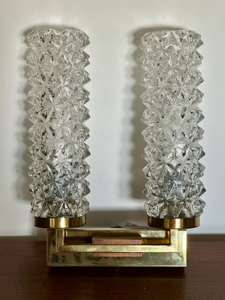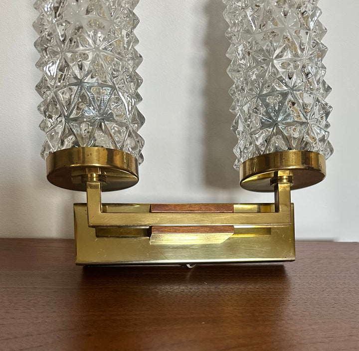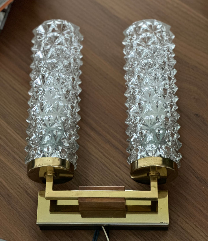 - Applique des années 70 composée de 2 tubes en verre ciselé, montés sur un socle en laiton doré qui est lui même décoré d'une petite plaque en bois