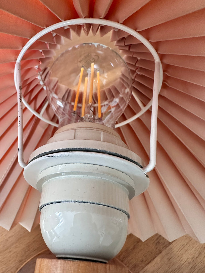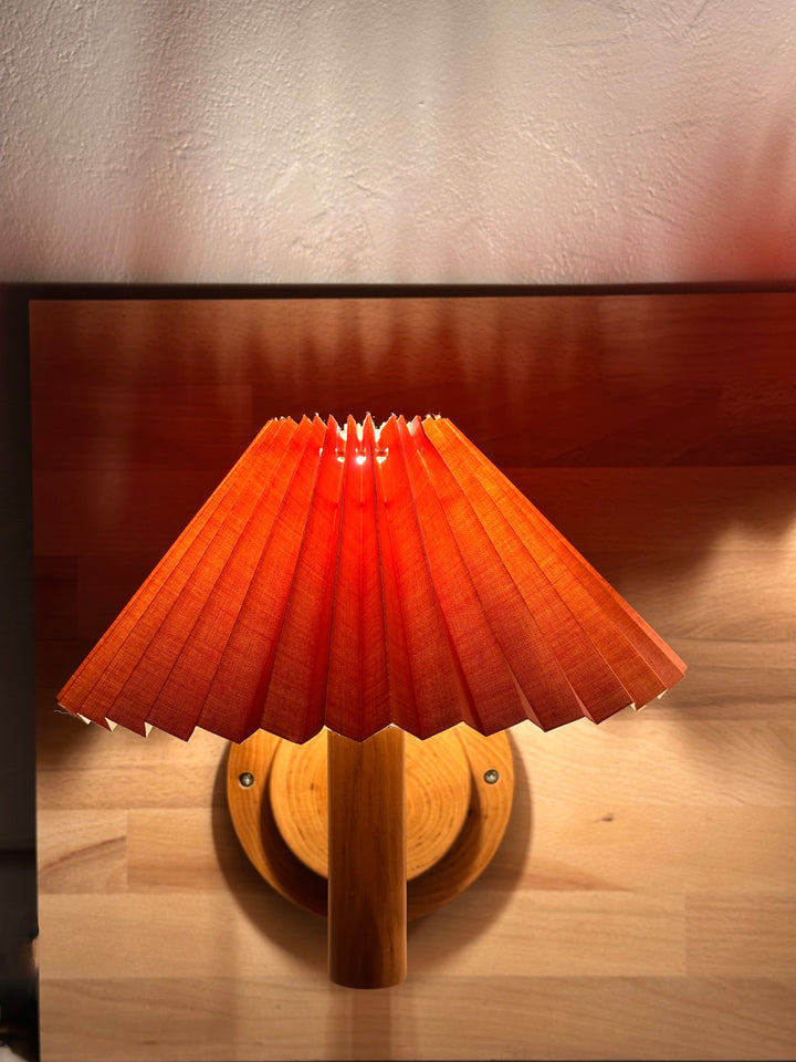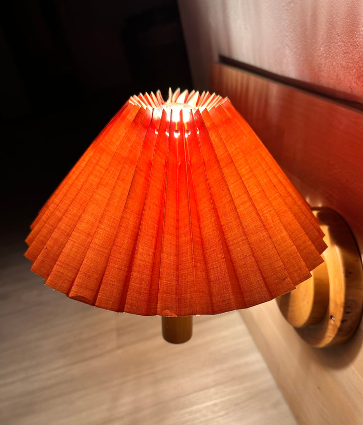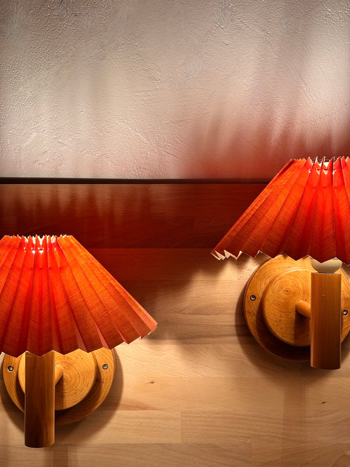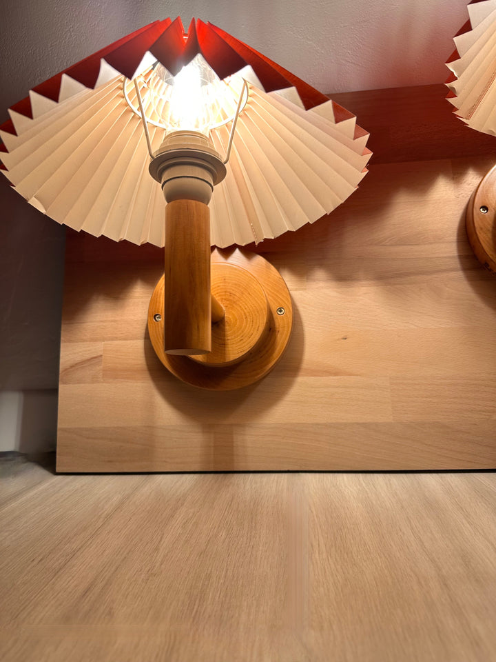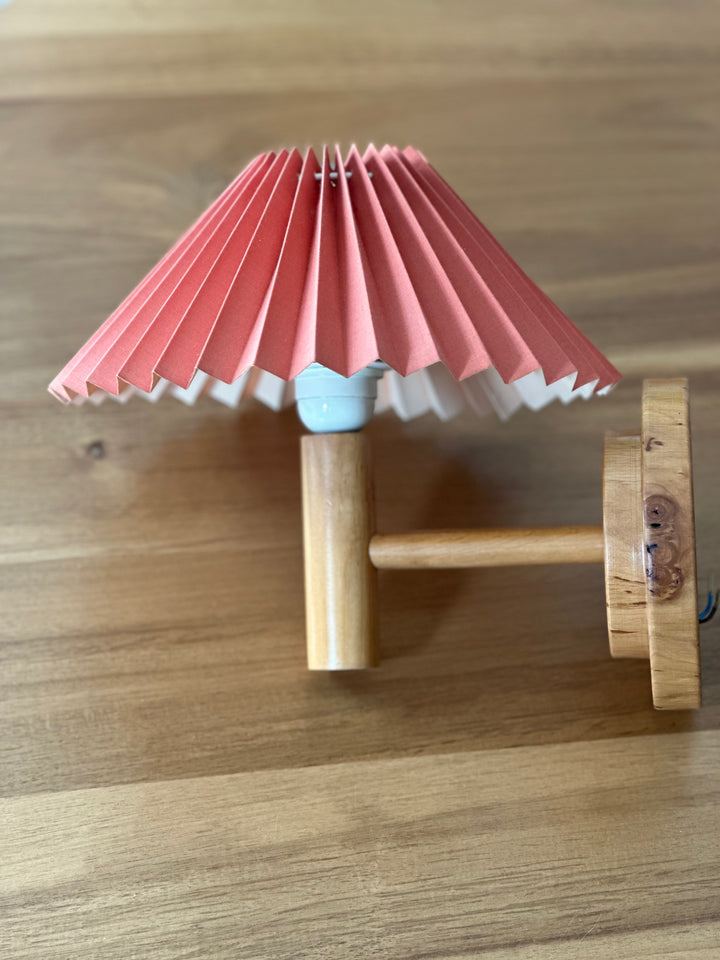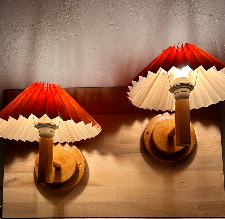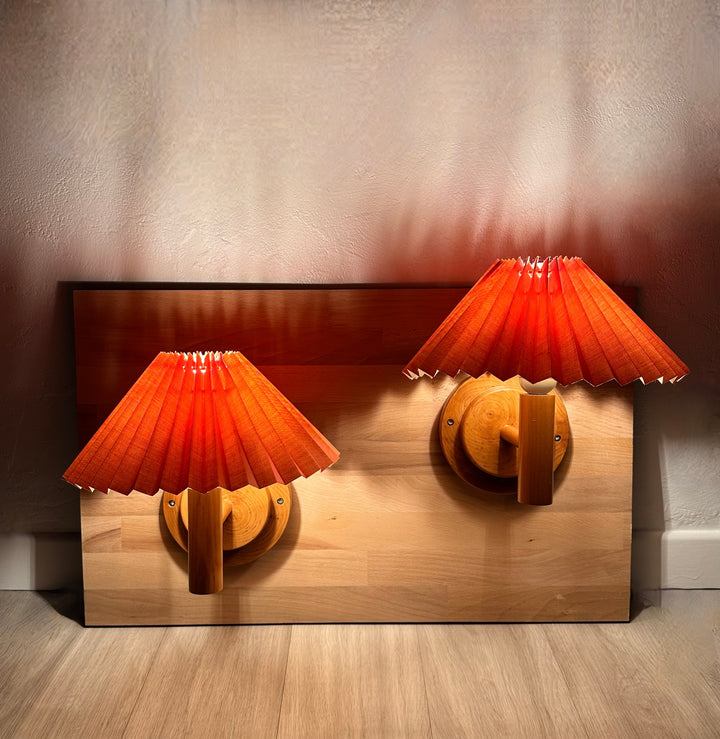 - Ensemble de 2 appliques en bois, abats-jour plissé de couleur saumon, intérieurs blancs