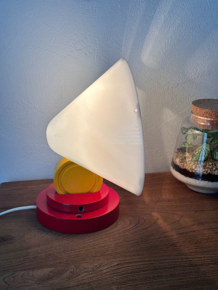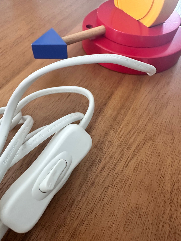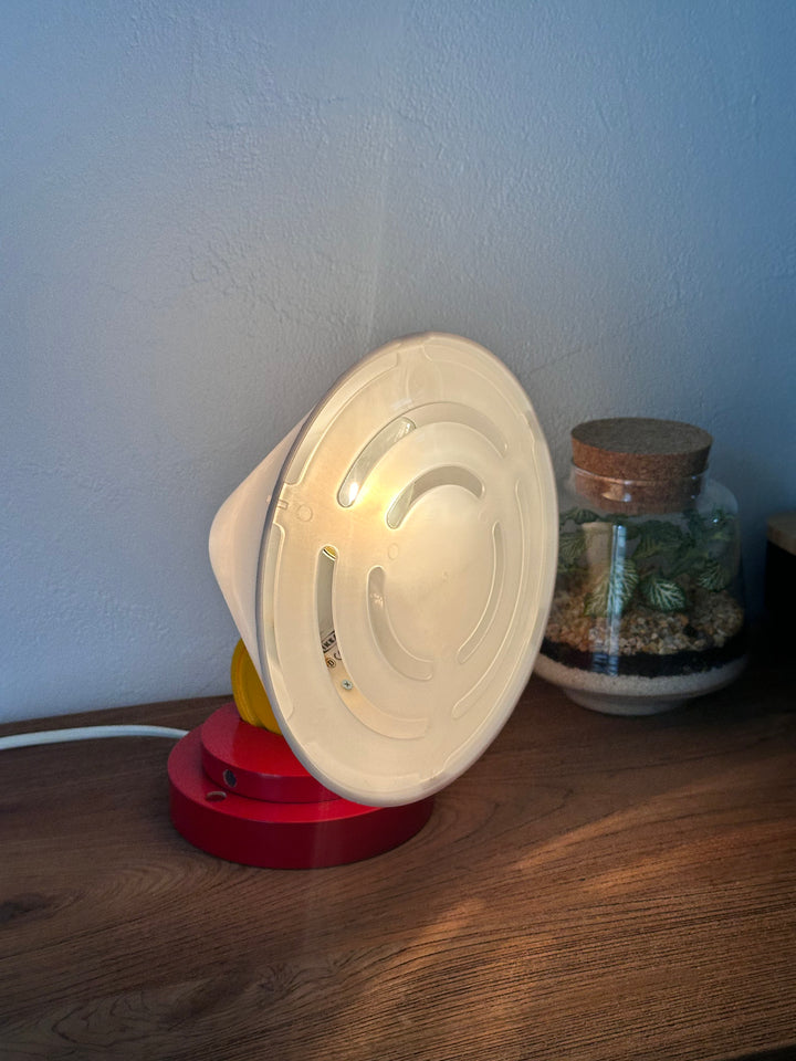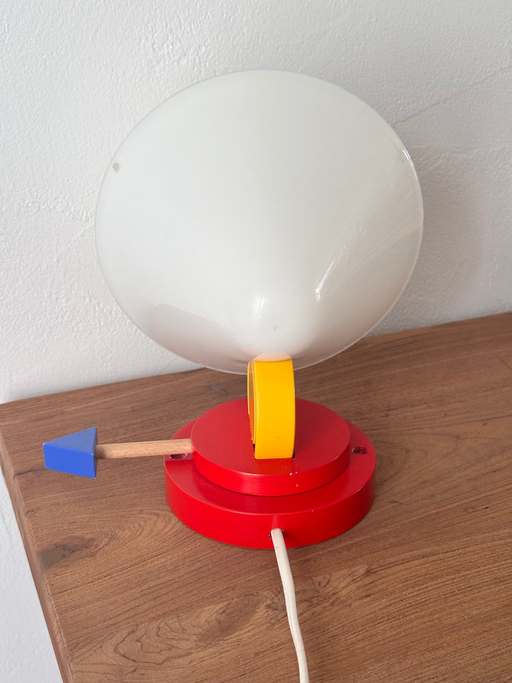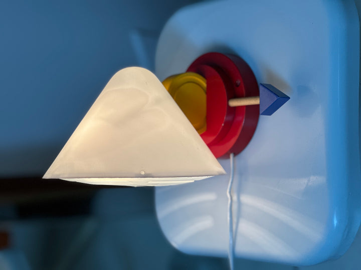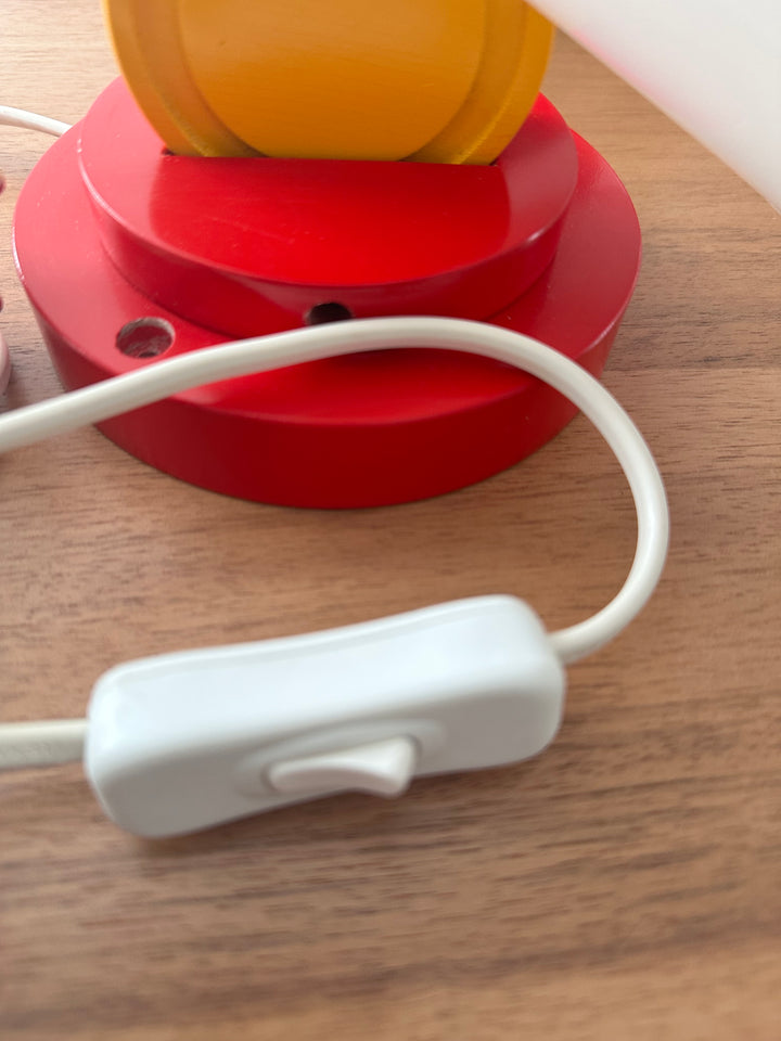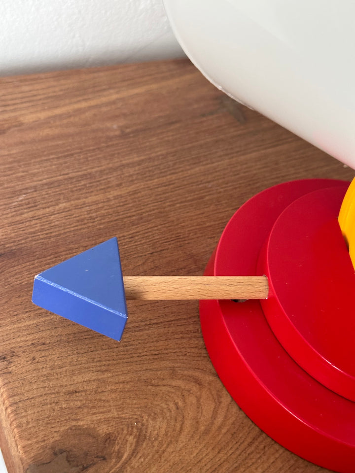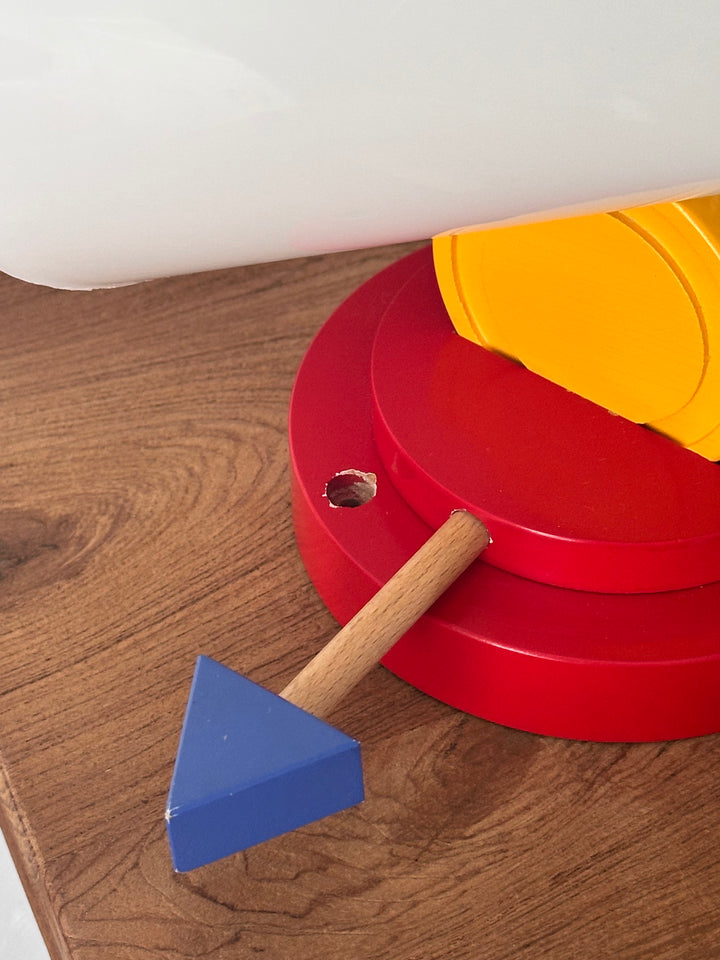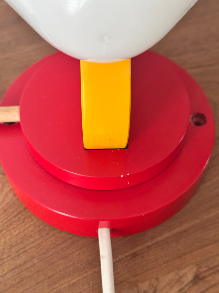 - Le socle est en bois de couleur rouge, la flèche est bleue et l'abat jour est en acrylique blanc