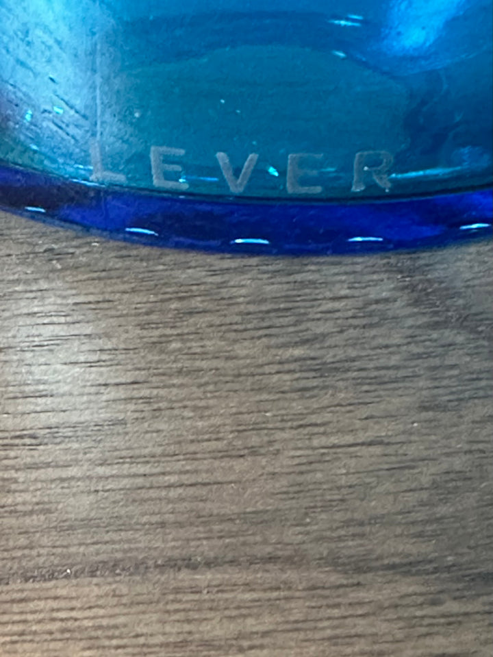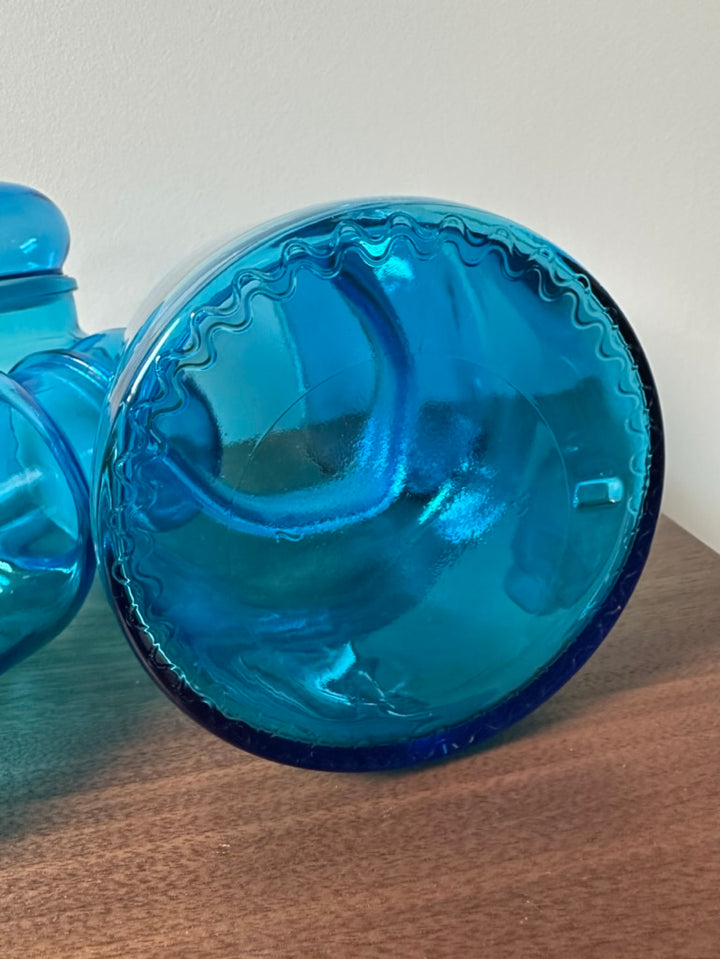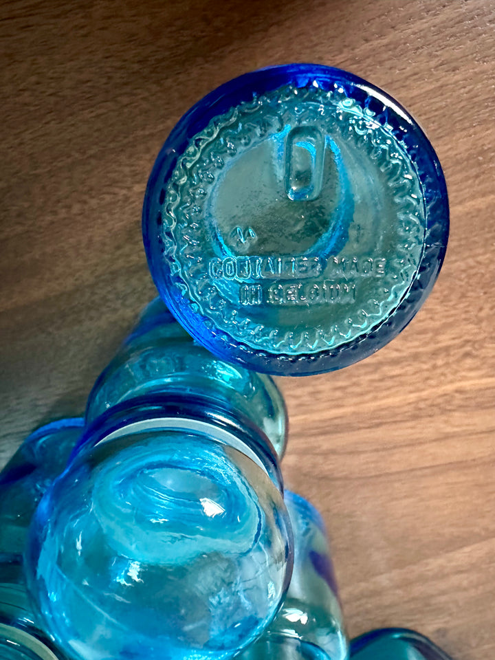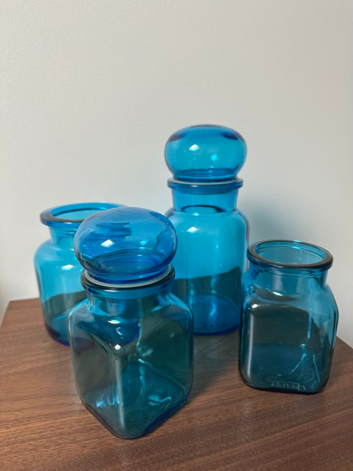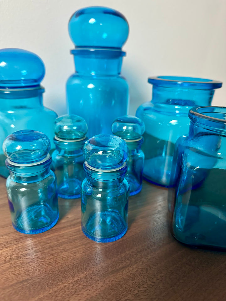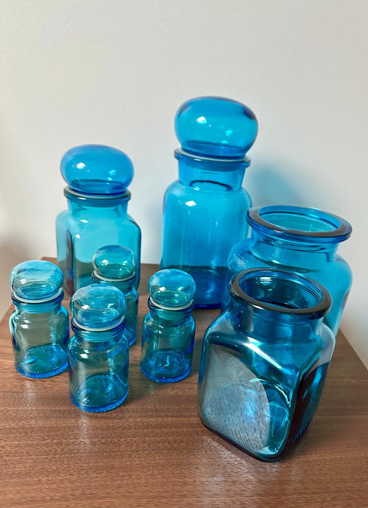 - Ensemble de 8 bocaux bleus vintage de fabrication Belge, en verre, des années 70/80, de différentes tailles, deux d'entre eux sont sans bouchon