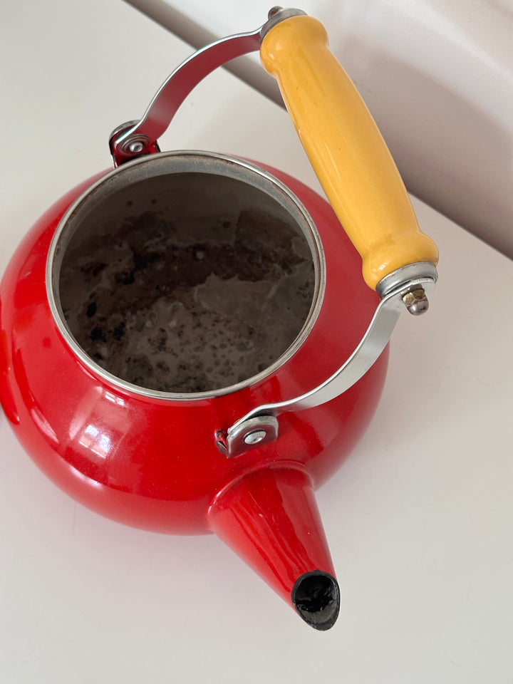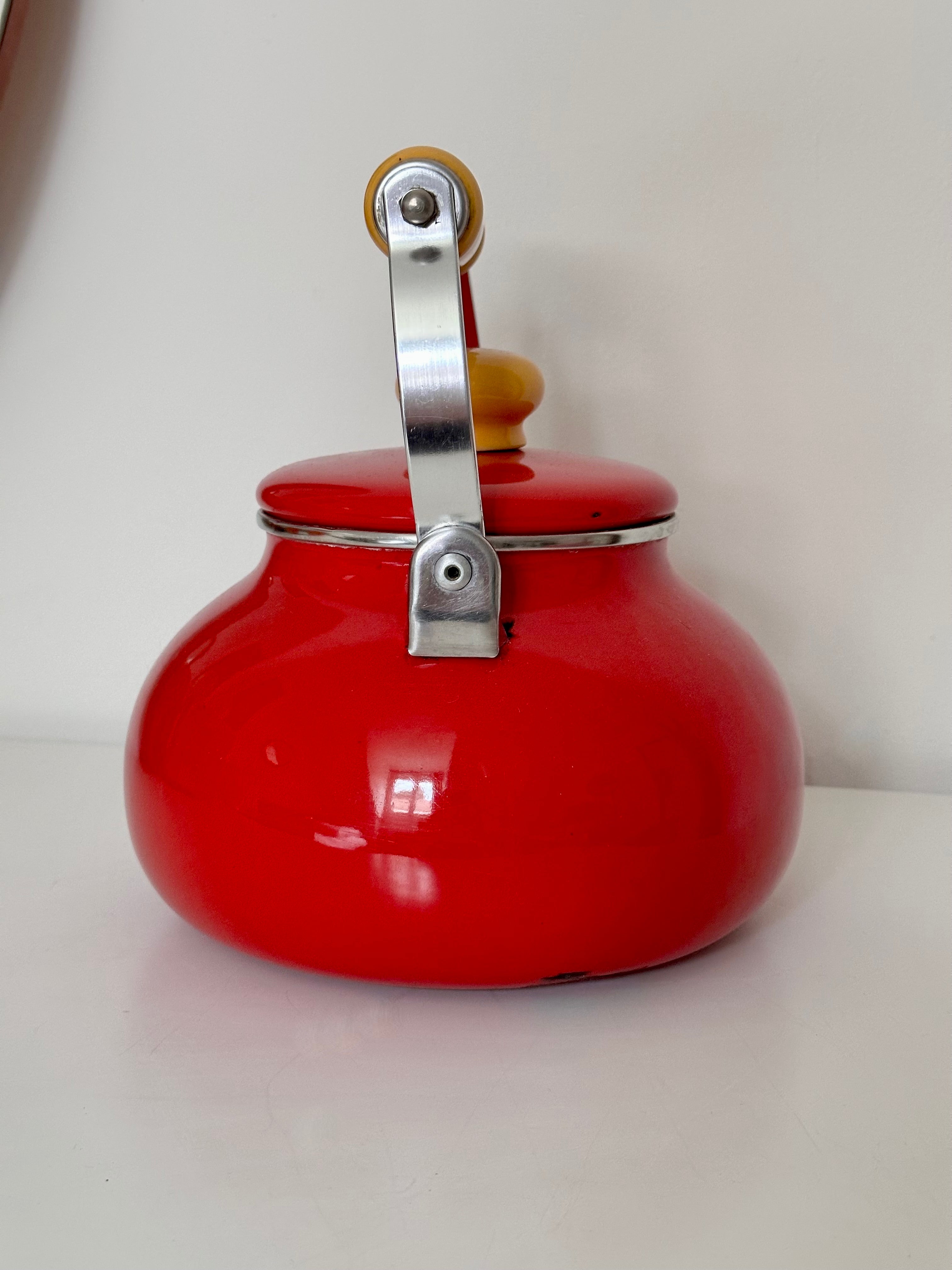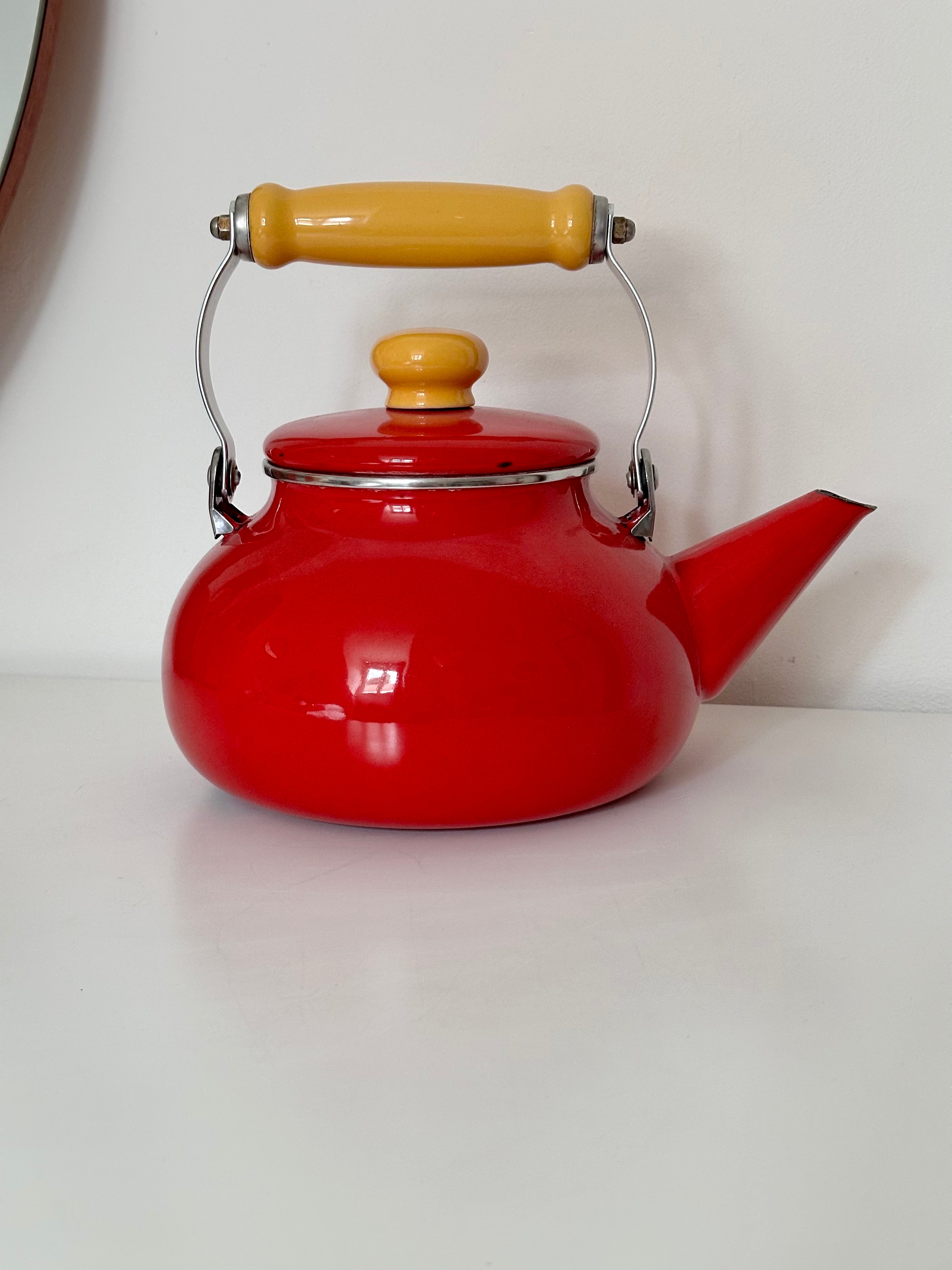 - Jolie bouilloire émaillée rouge et jaune, des années 60, un coup de coeur sur une brocante, elle faisait partie d'une collection d'un Papy qui souhaitait faire de la place