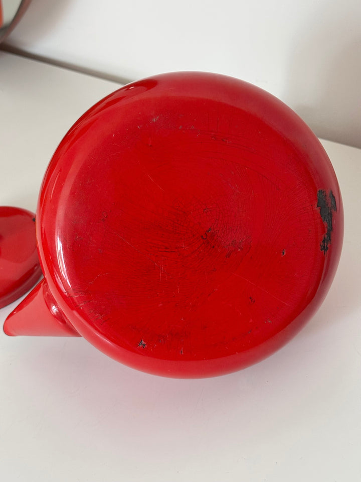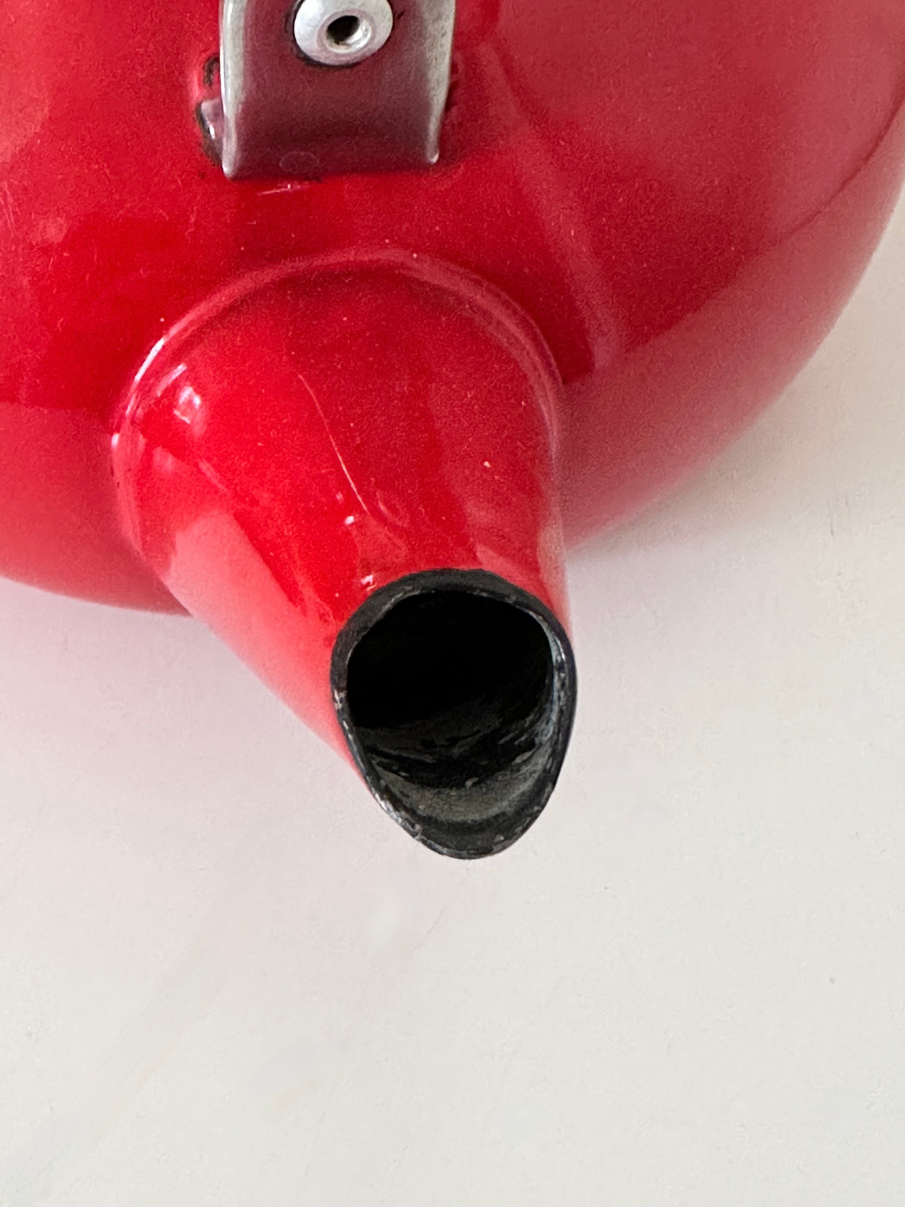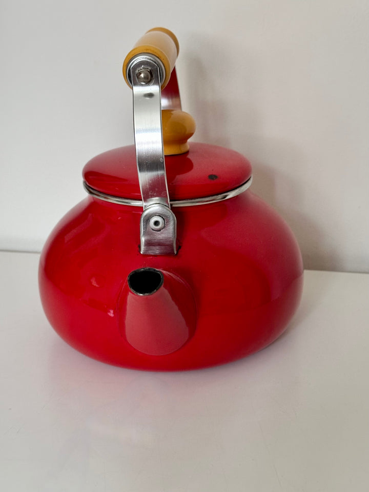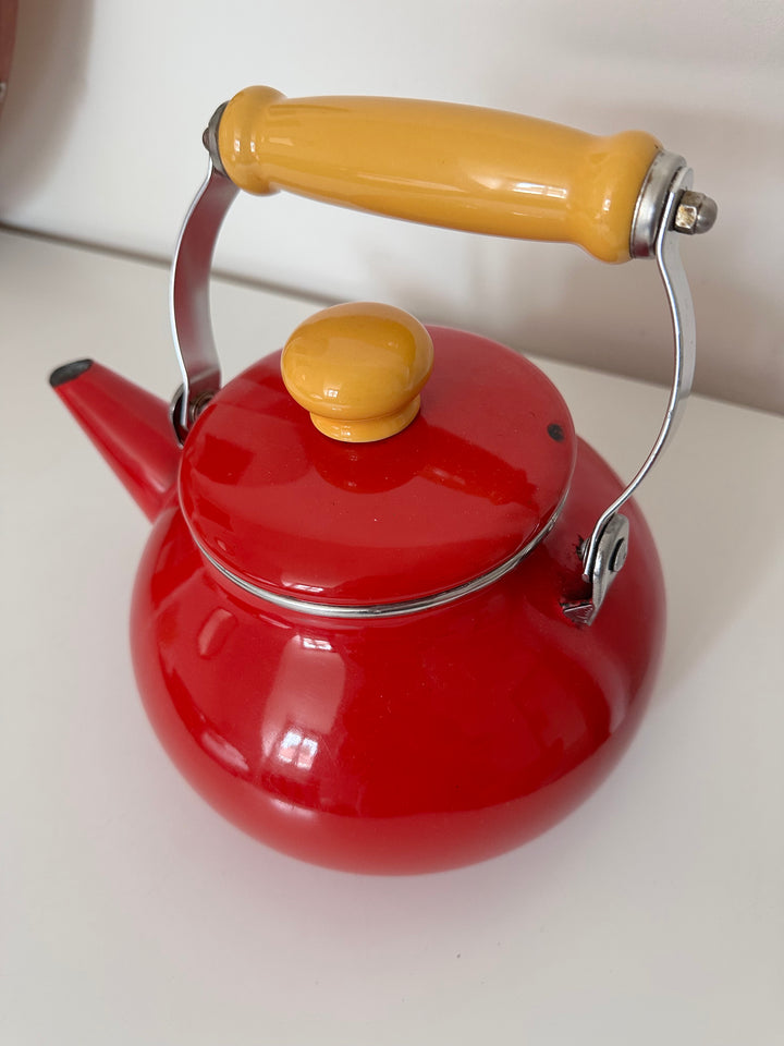- Jolie bouilloire émaillée rouge et jaune, des années 60, un coup de coeur sur une brocante, elle faisait partie d'une collection d'un Papy qui souhaitait faire de la place