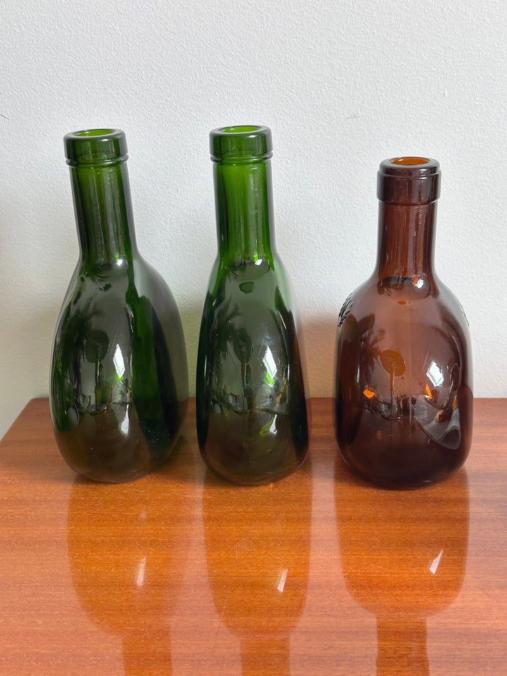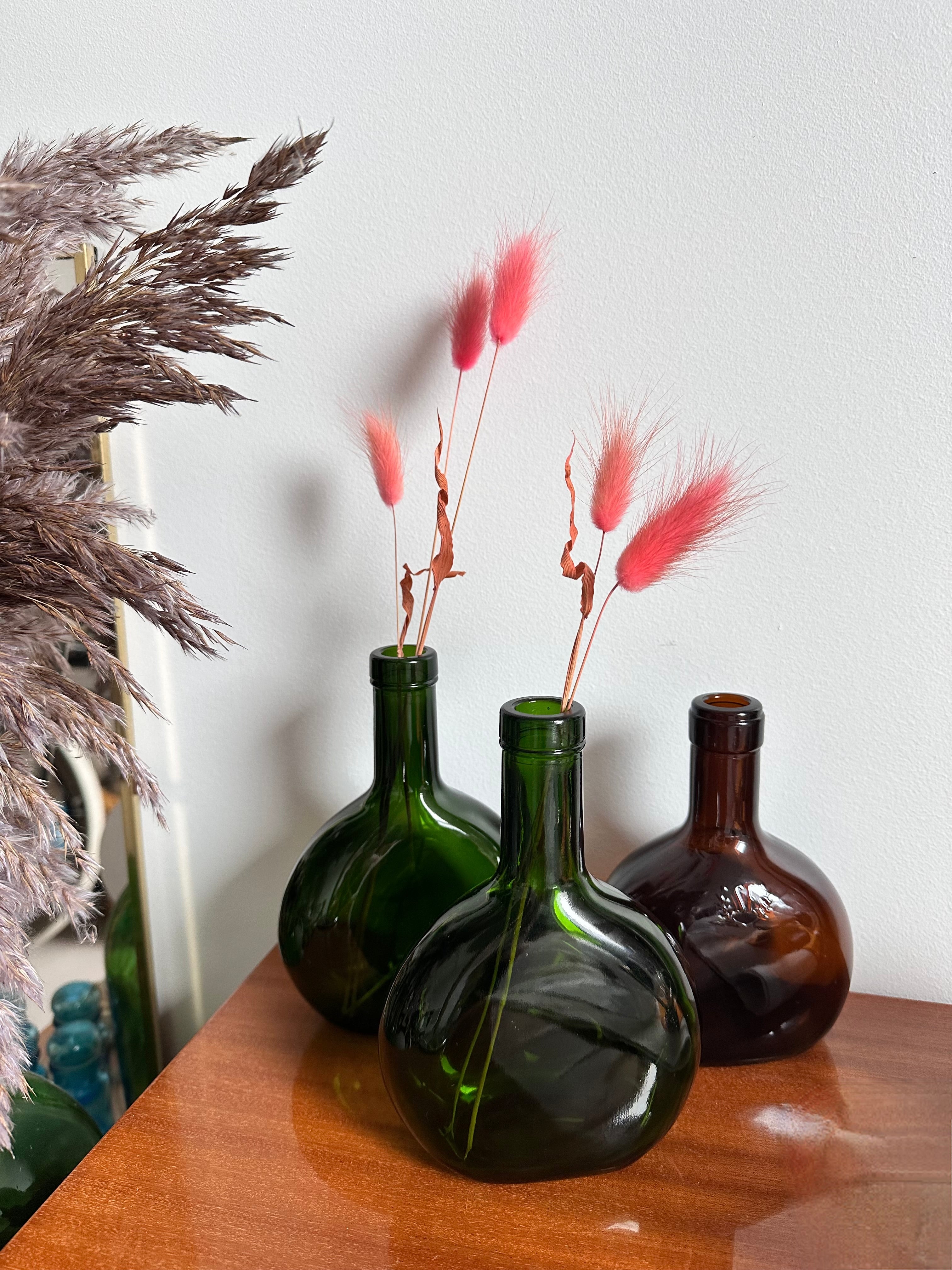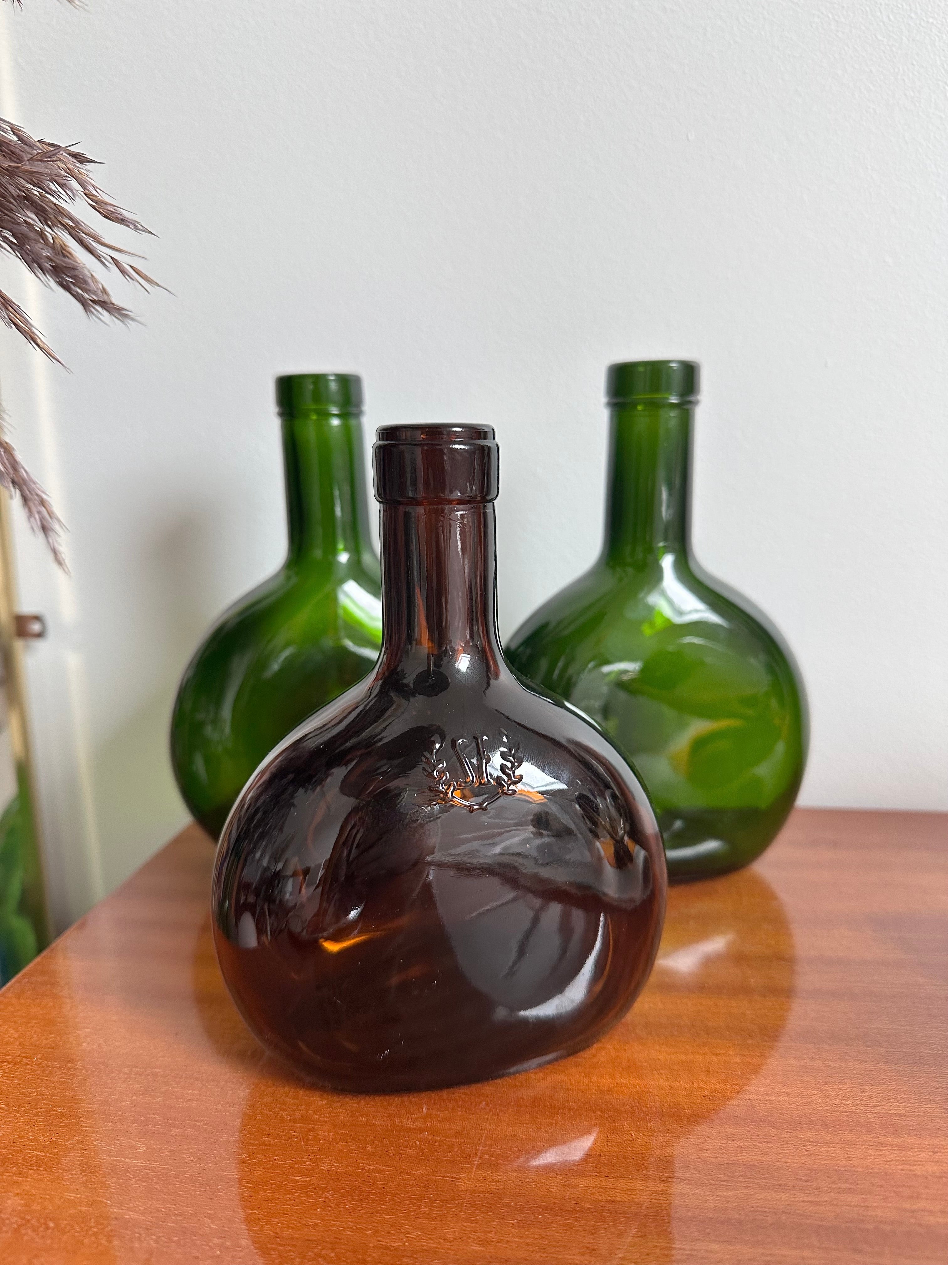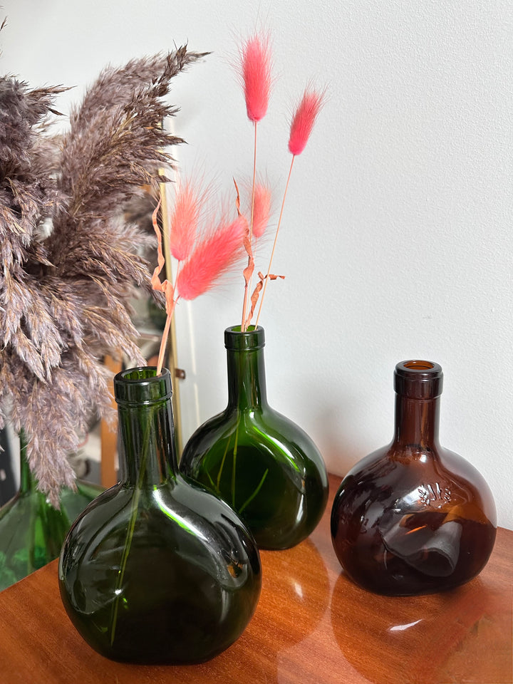 - Ensemble de 3 petites bouteilles vintage aux couleurs chaudes qui pourront servir de soliflore ou simplement de déco parmi d'autres à côté d'un miroir par exemple, le papi chez qui nous les avons chinées s'en servait pour ses liqueurs d'époque...
