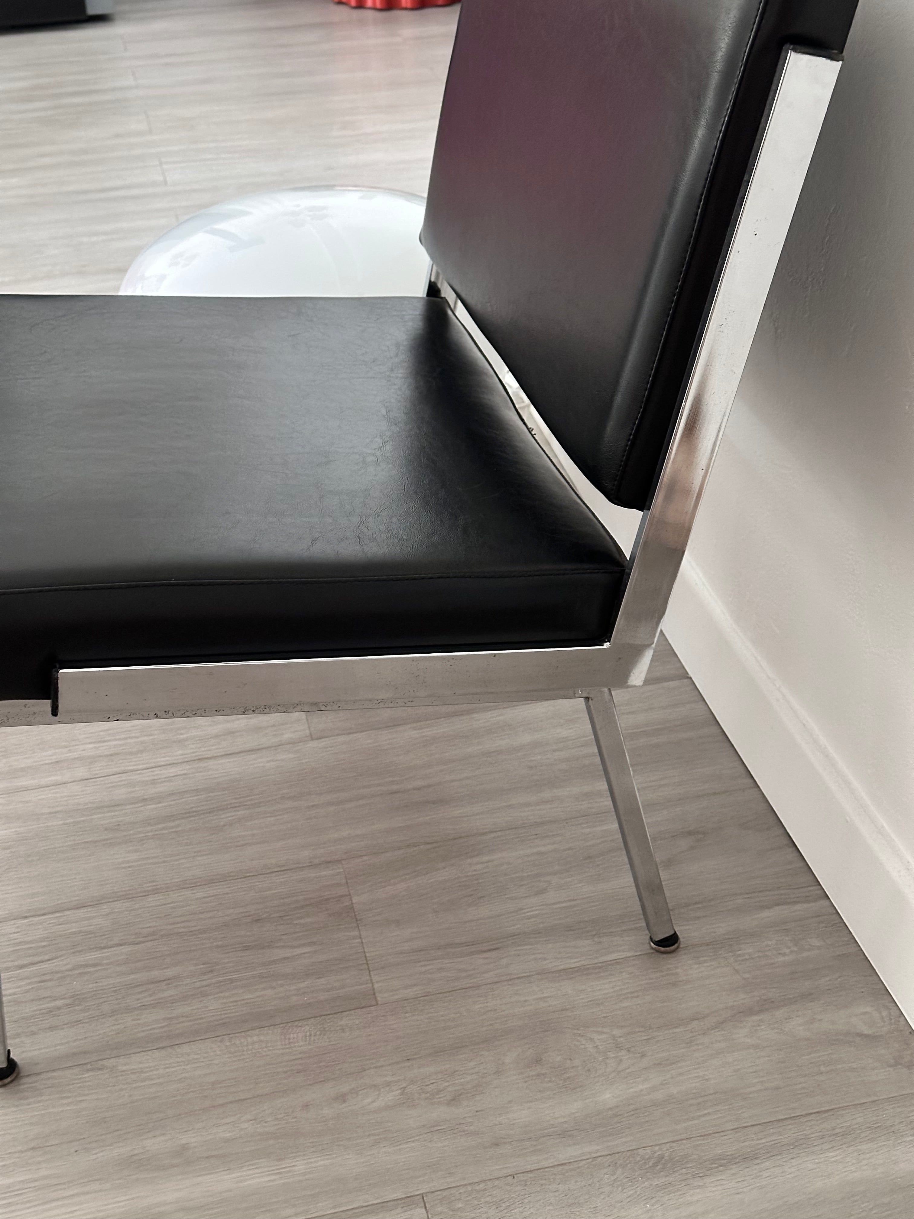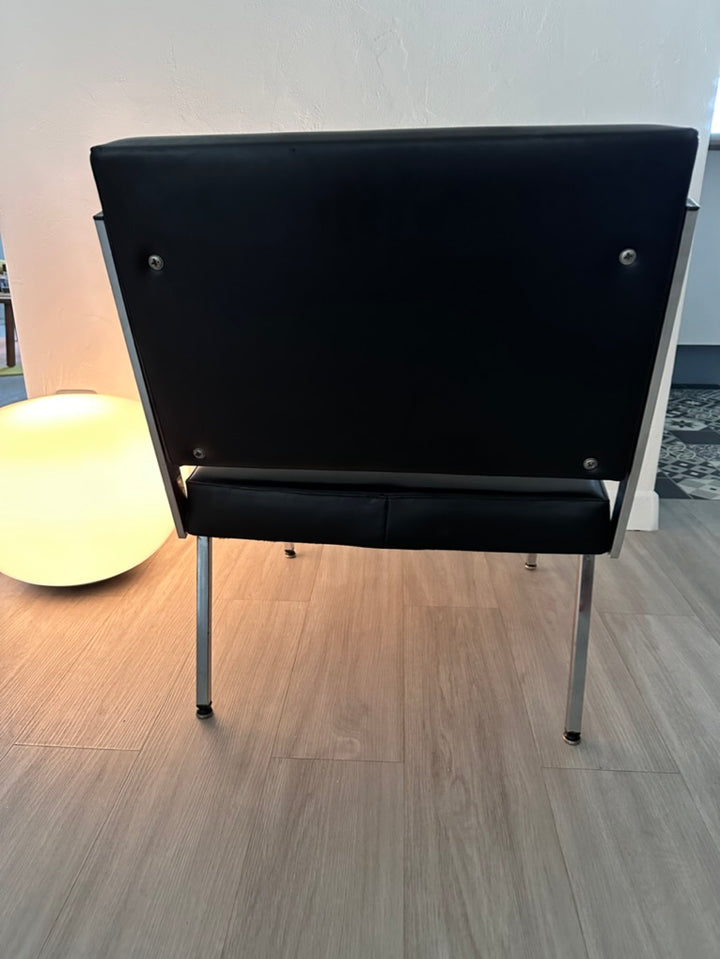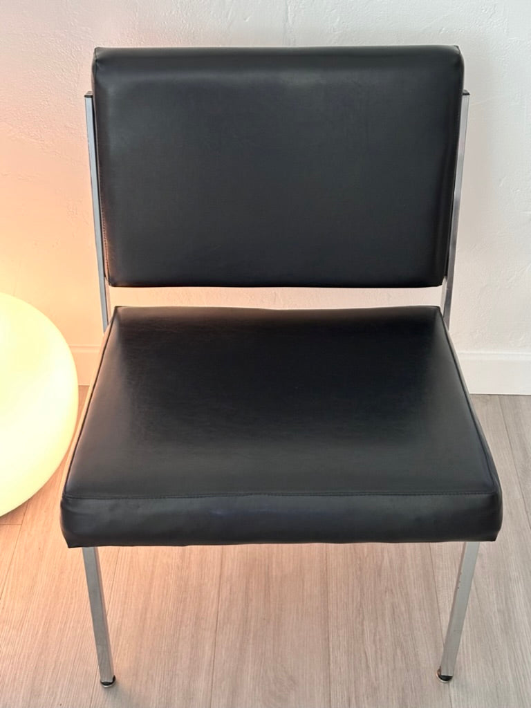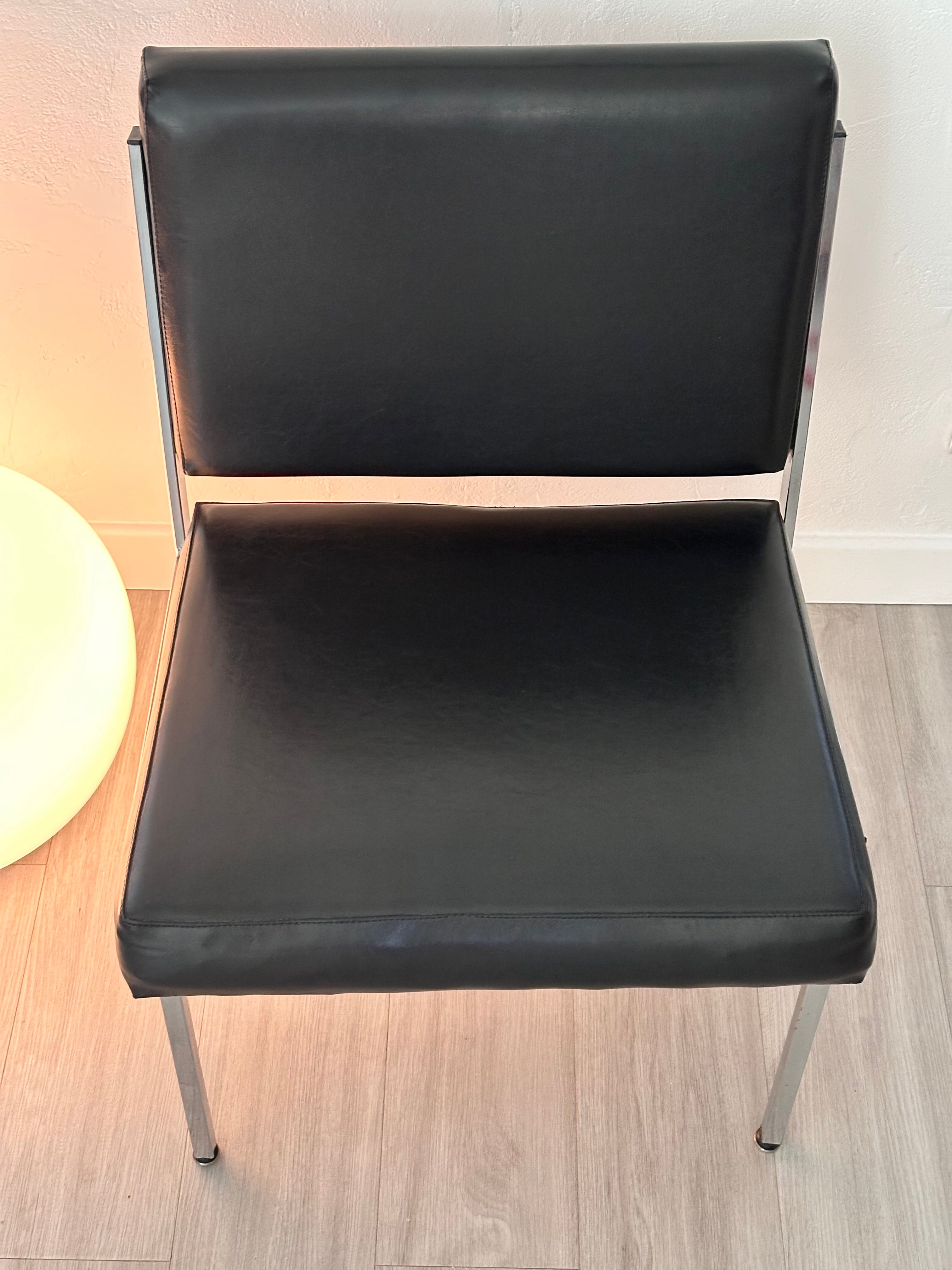 - Chauffeuse des années 60/70 en simili cuir noir, les pieds et les côtés de l'assise et du dossier sont en métal argenté, idéal pour une déco rétro