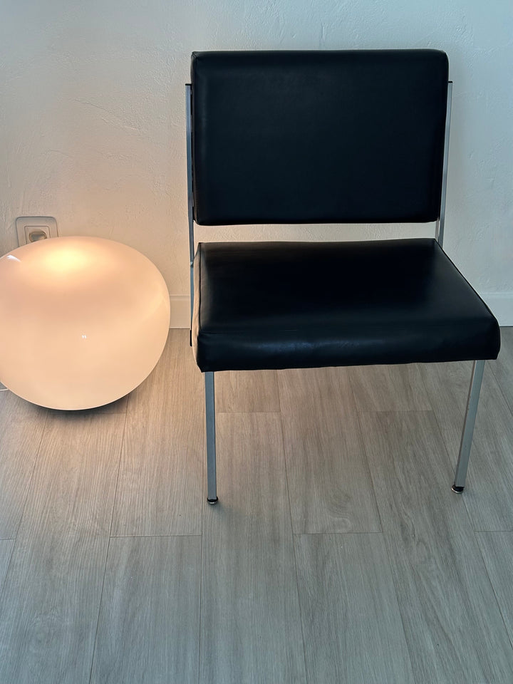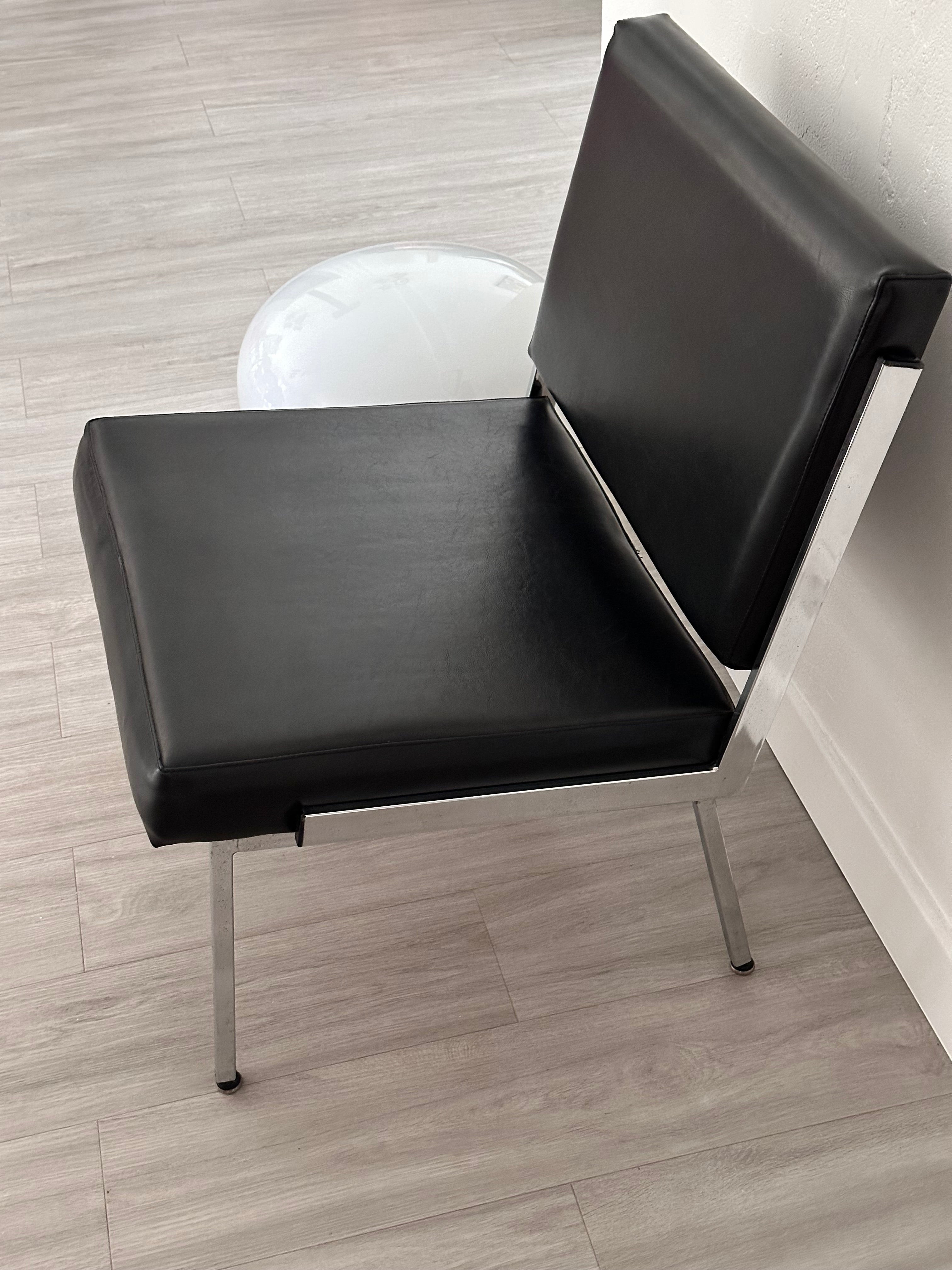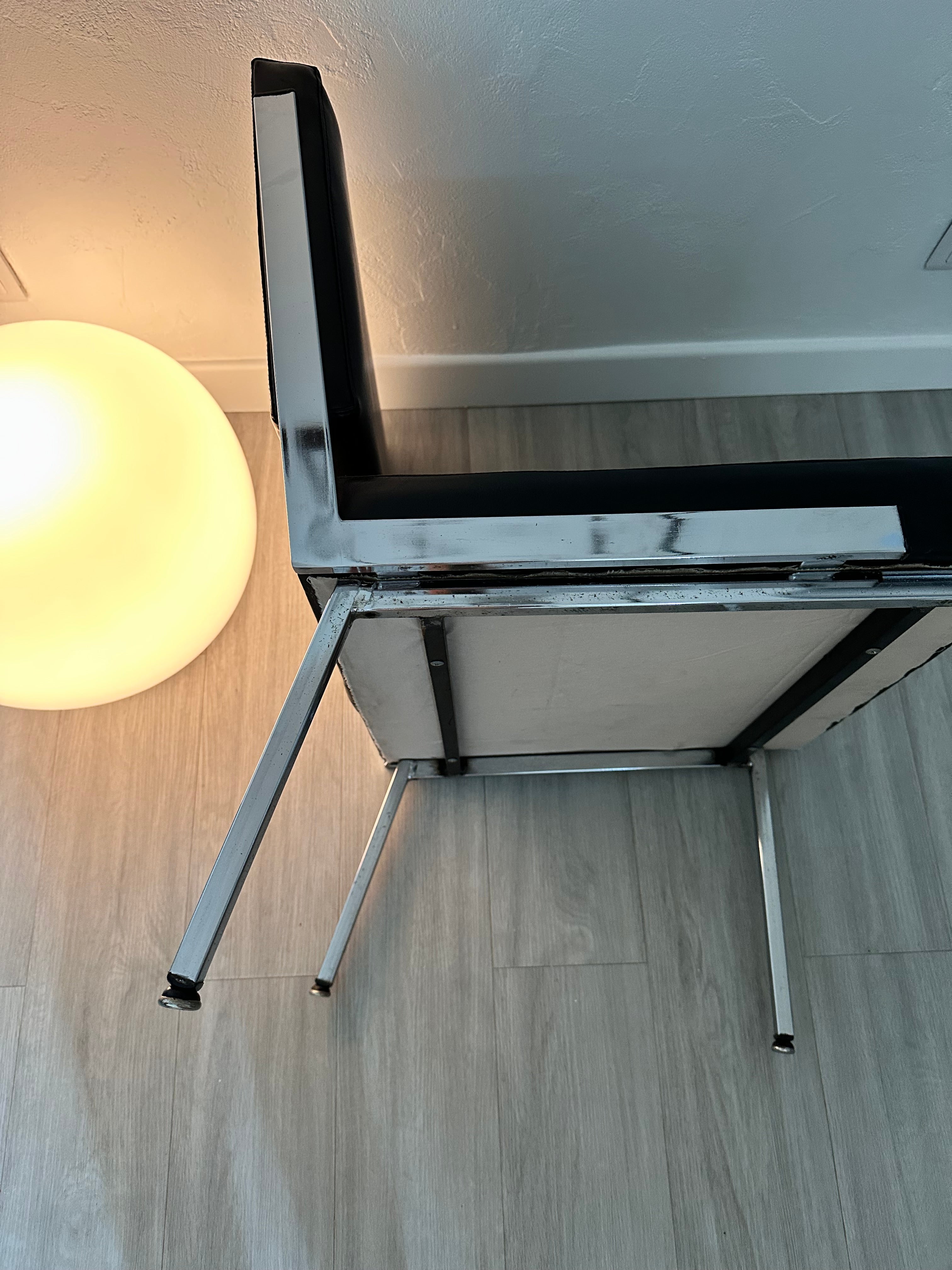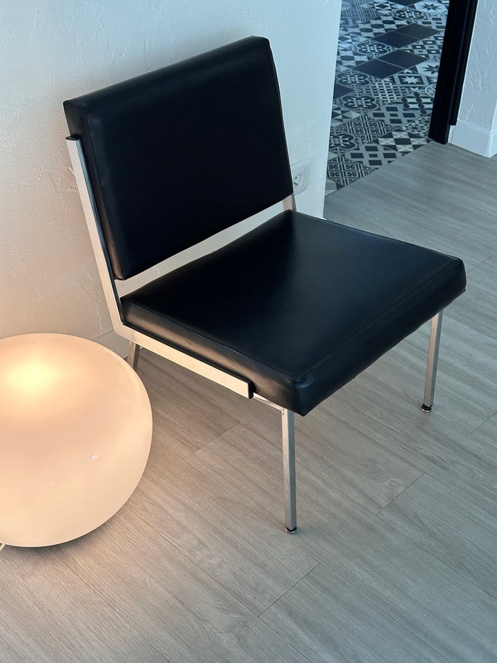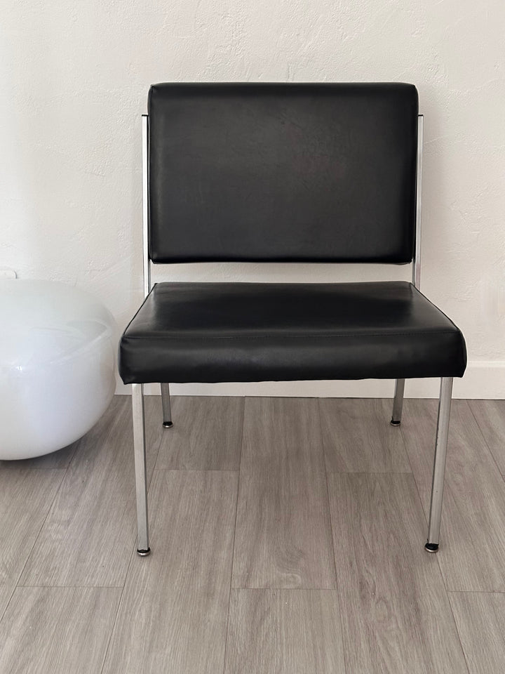 - Chauffeuse des années 60/70 en simili cuir noir, les pieds et les côtés de l'assise et du dossier sont en métal argenté, idéal pour une déco rétro