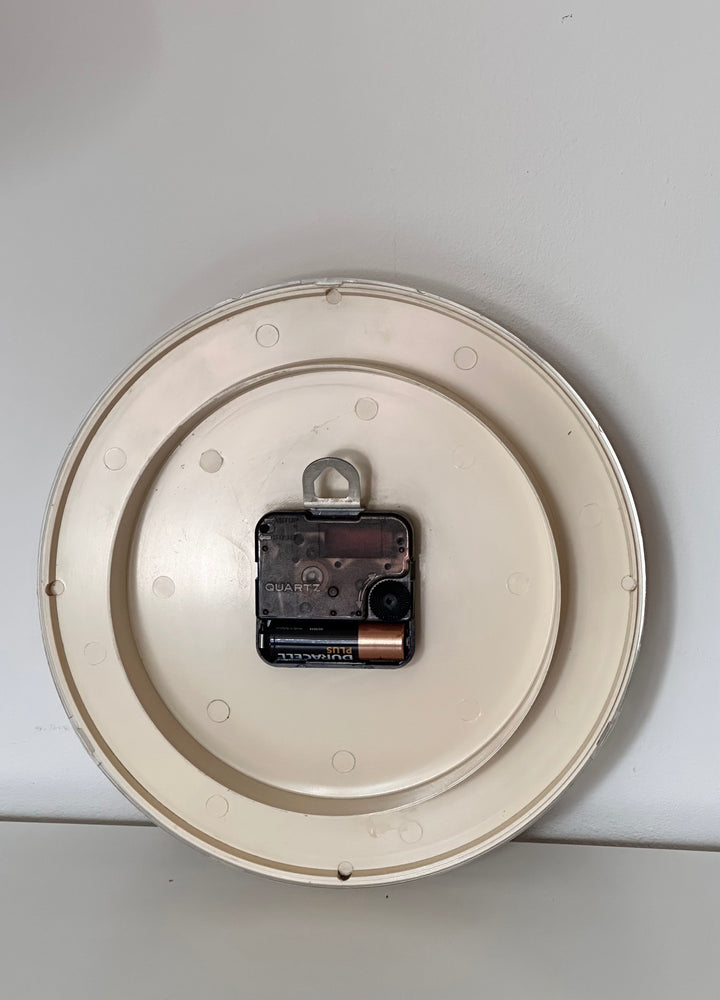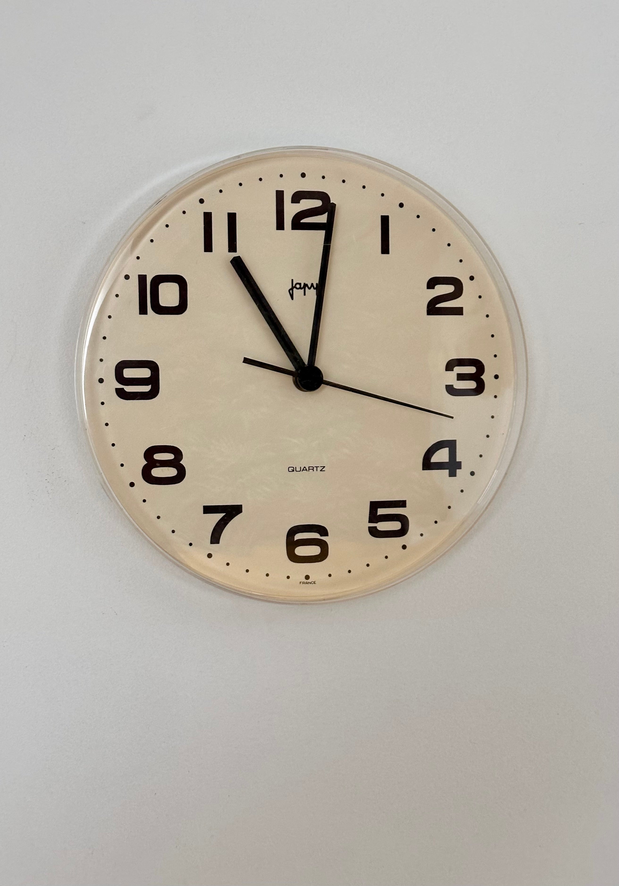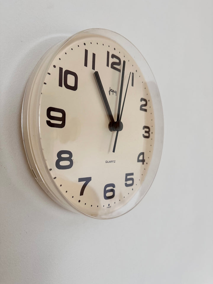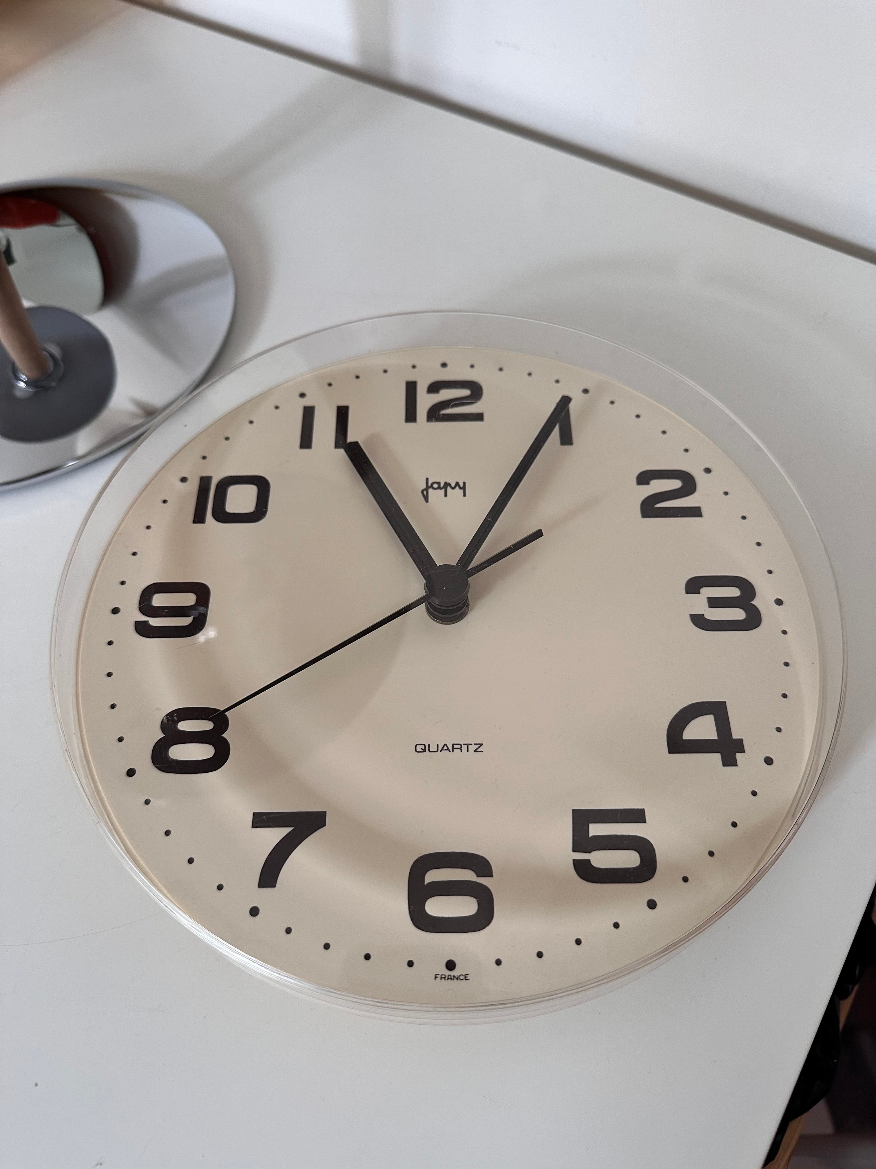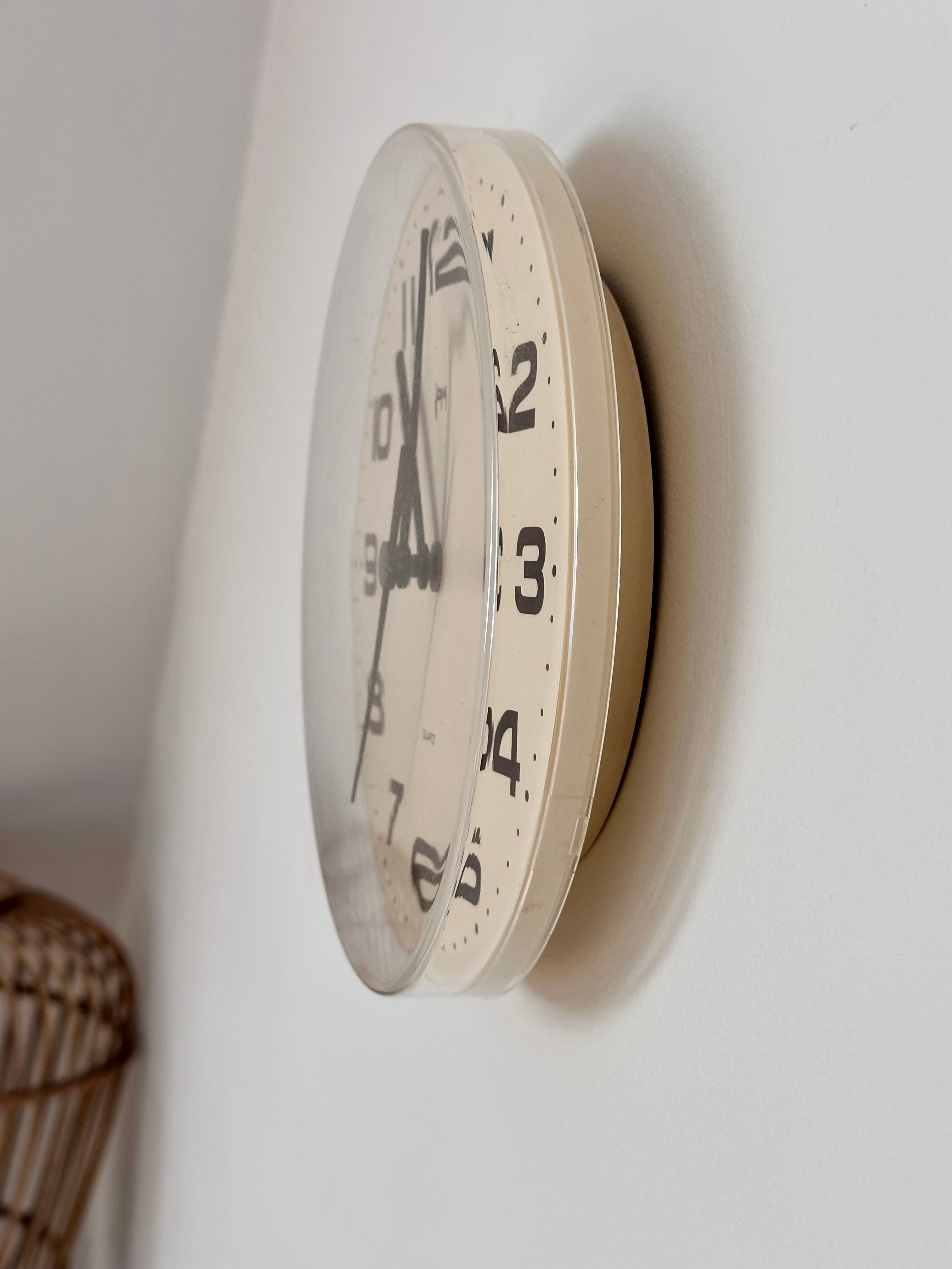 - Coup de coeur pour cette horloge murale en plastique des années 80, simple mais efficace, sa couleur discrète entre blanc et blanc cassé s'adaptera à n'importe quel style de décoration