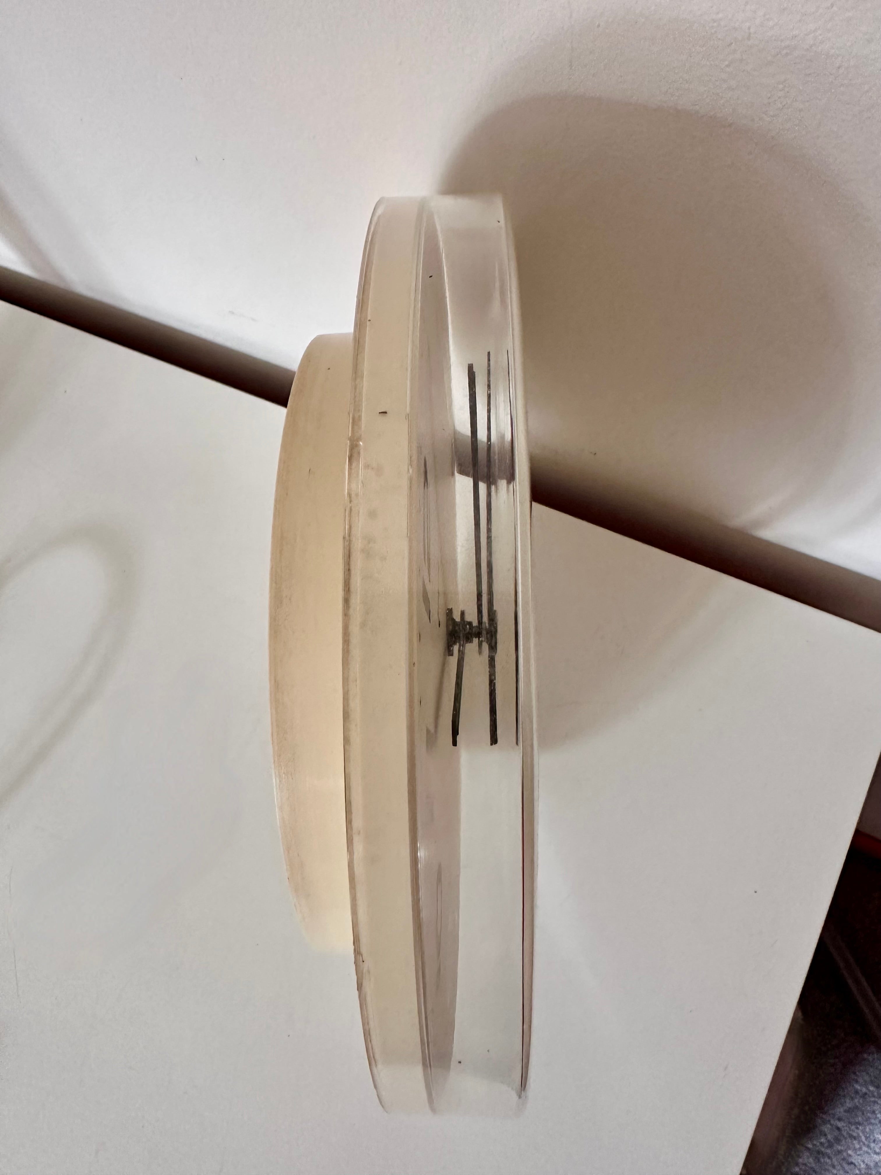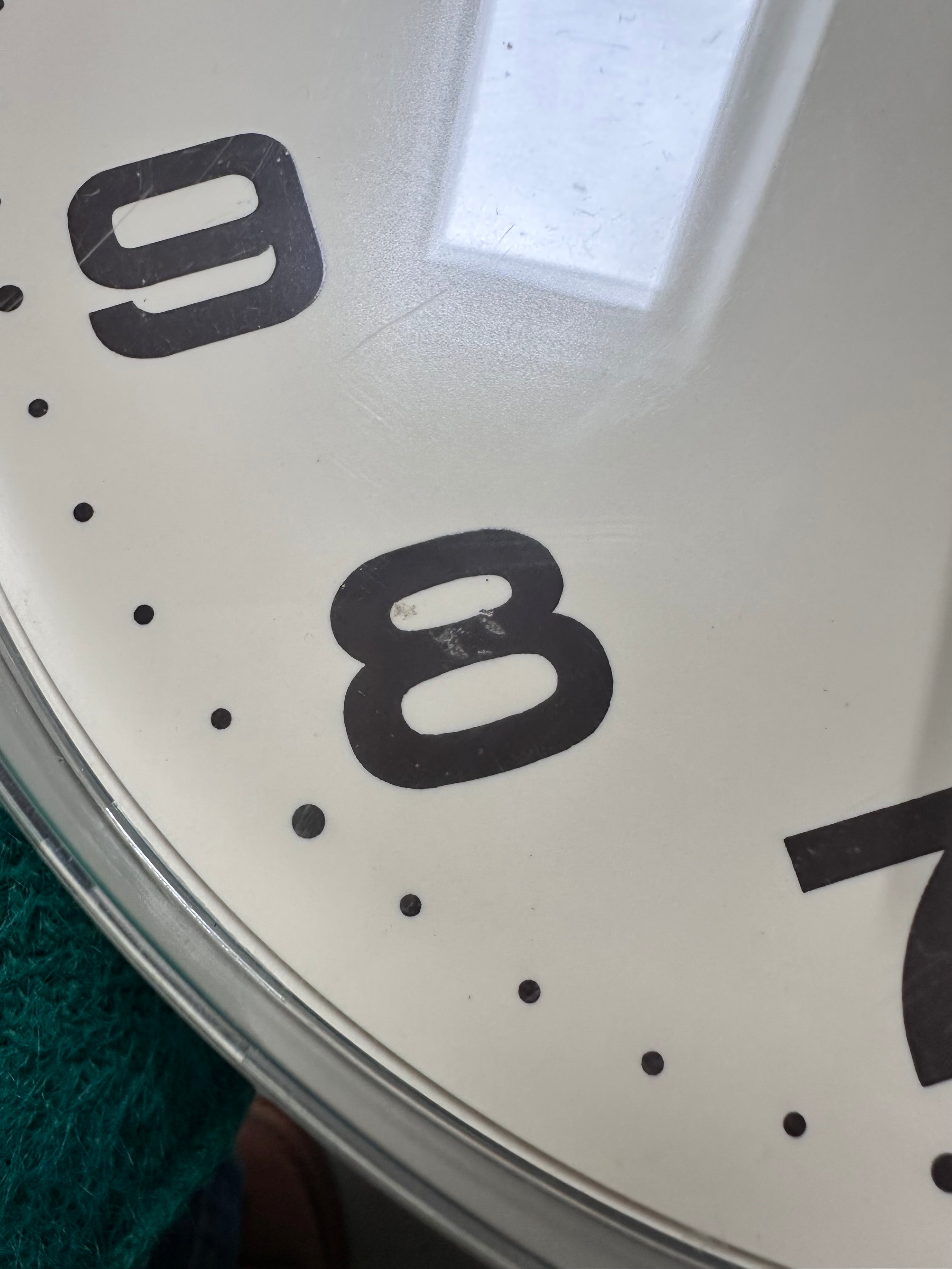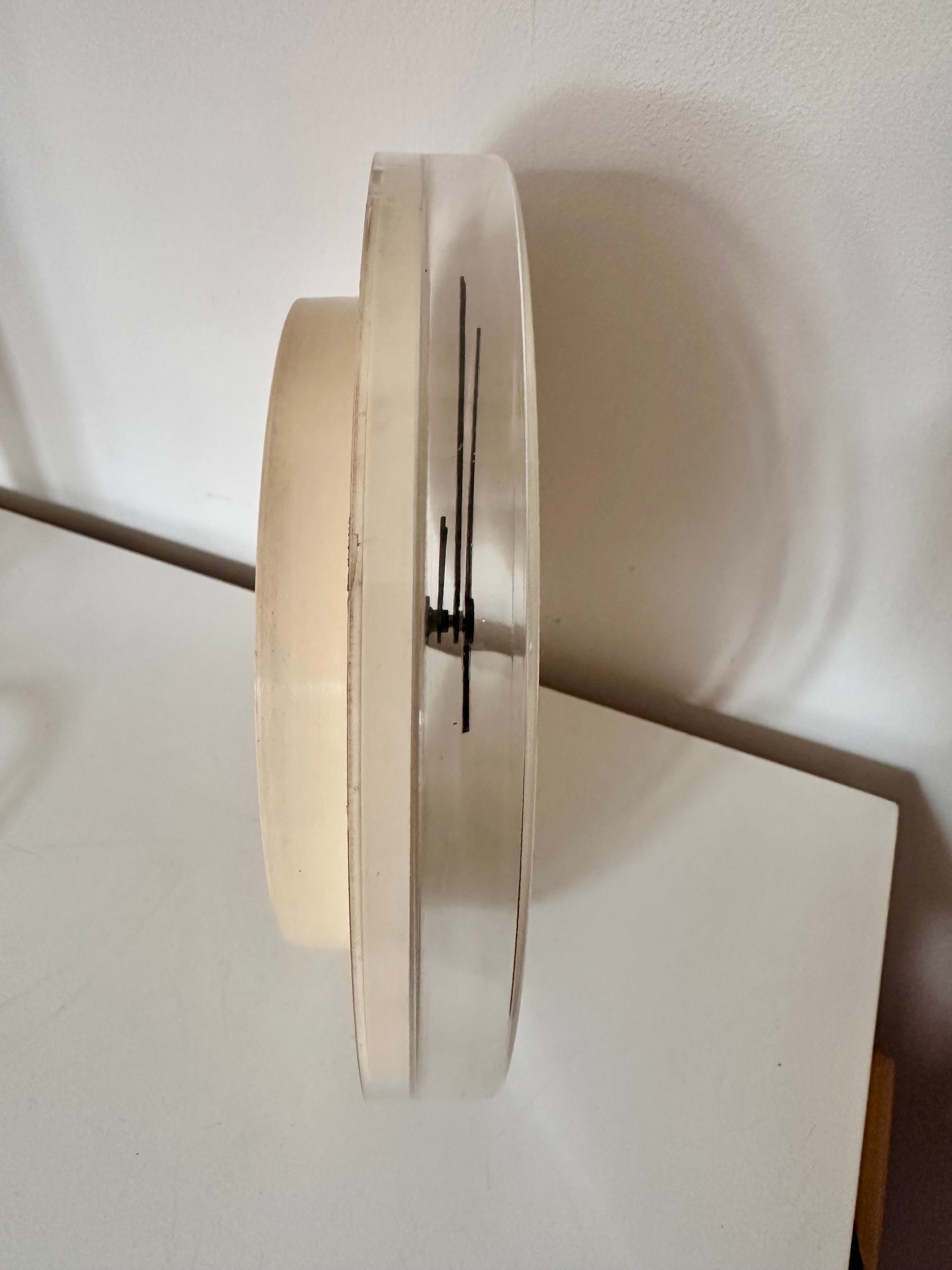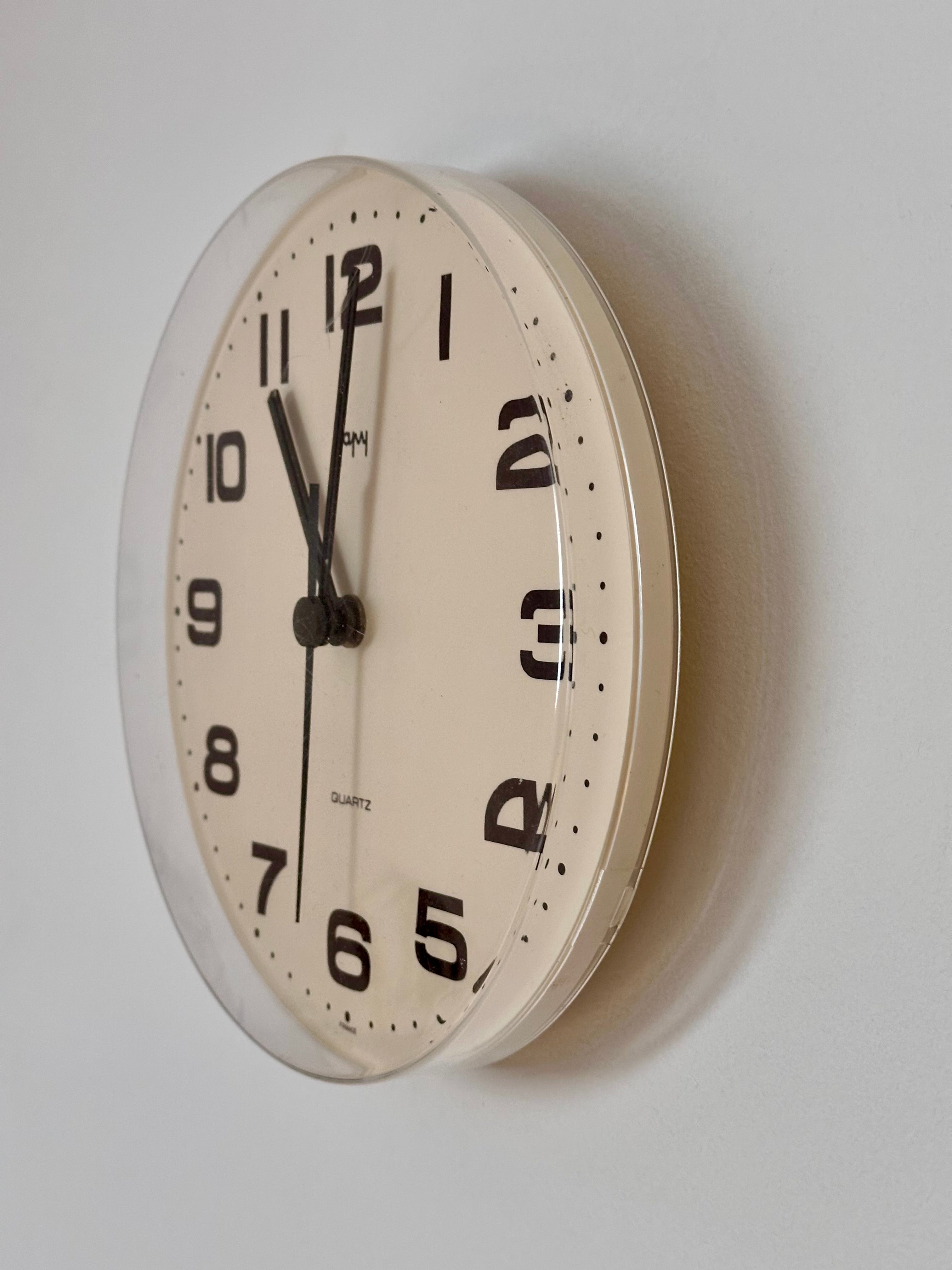 - Coup de coeur pour cette horloge murale en plastique des années 80, simple mais efficace, sa couleur discrète entre blanc et blanc cassé s'adaptera à n'importe quel style de décoration