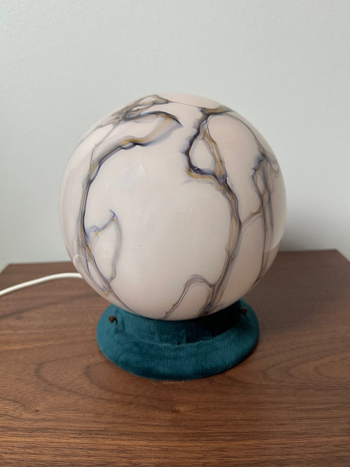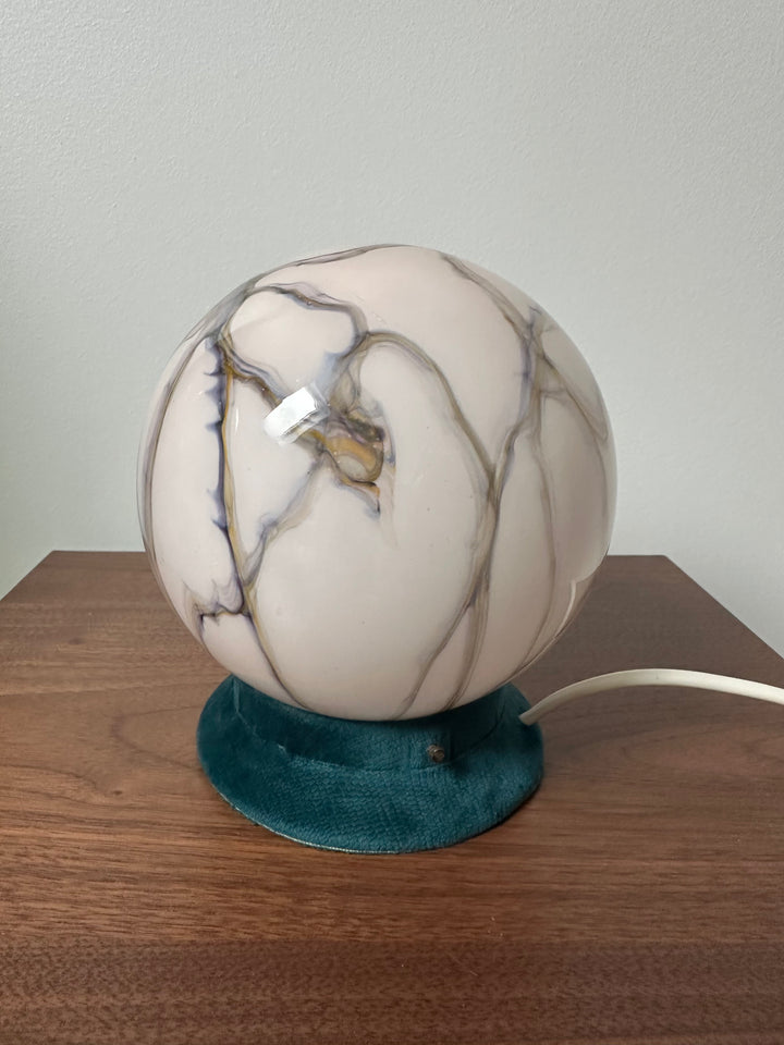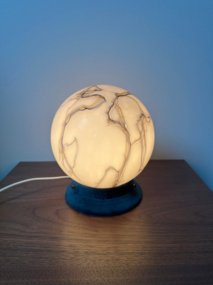 - Petite lampe de table née d'un croisement du vintage avec de l'actuel, le globe date des années 80, le pied gainé de velours ras d'aujourd'hui