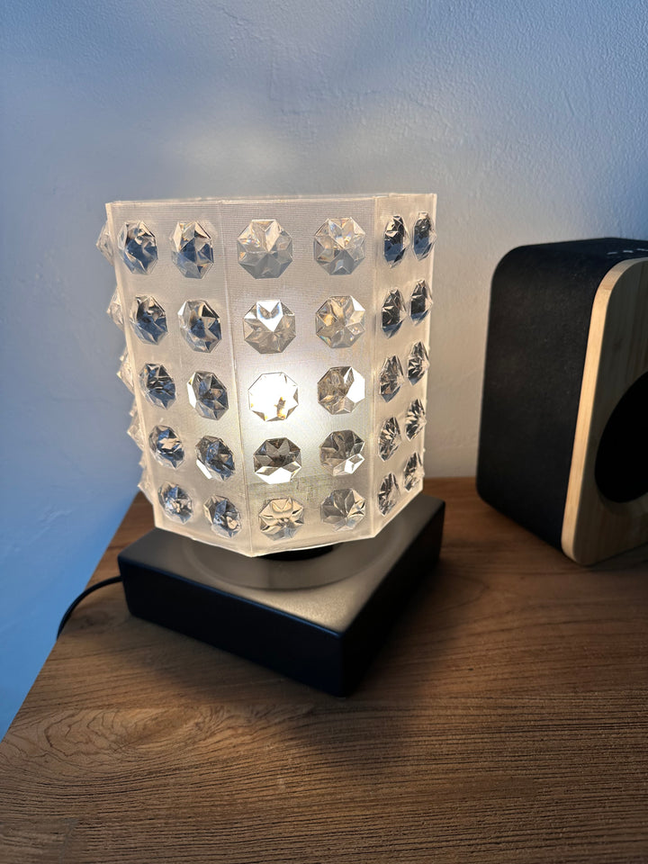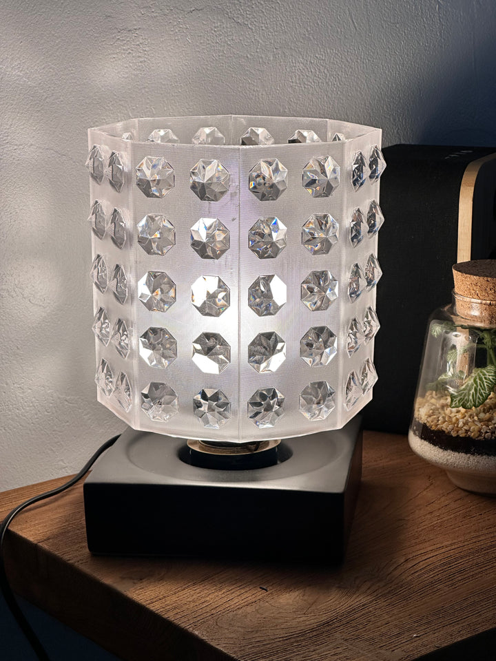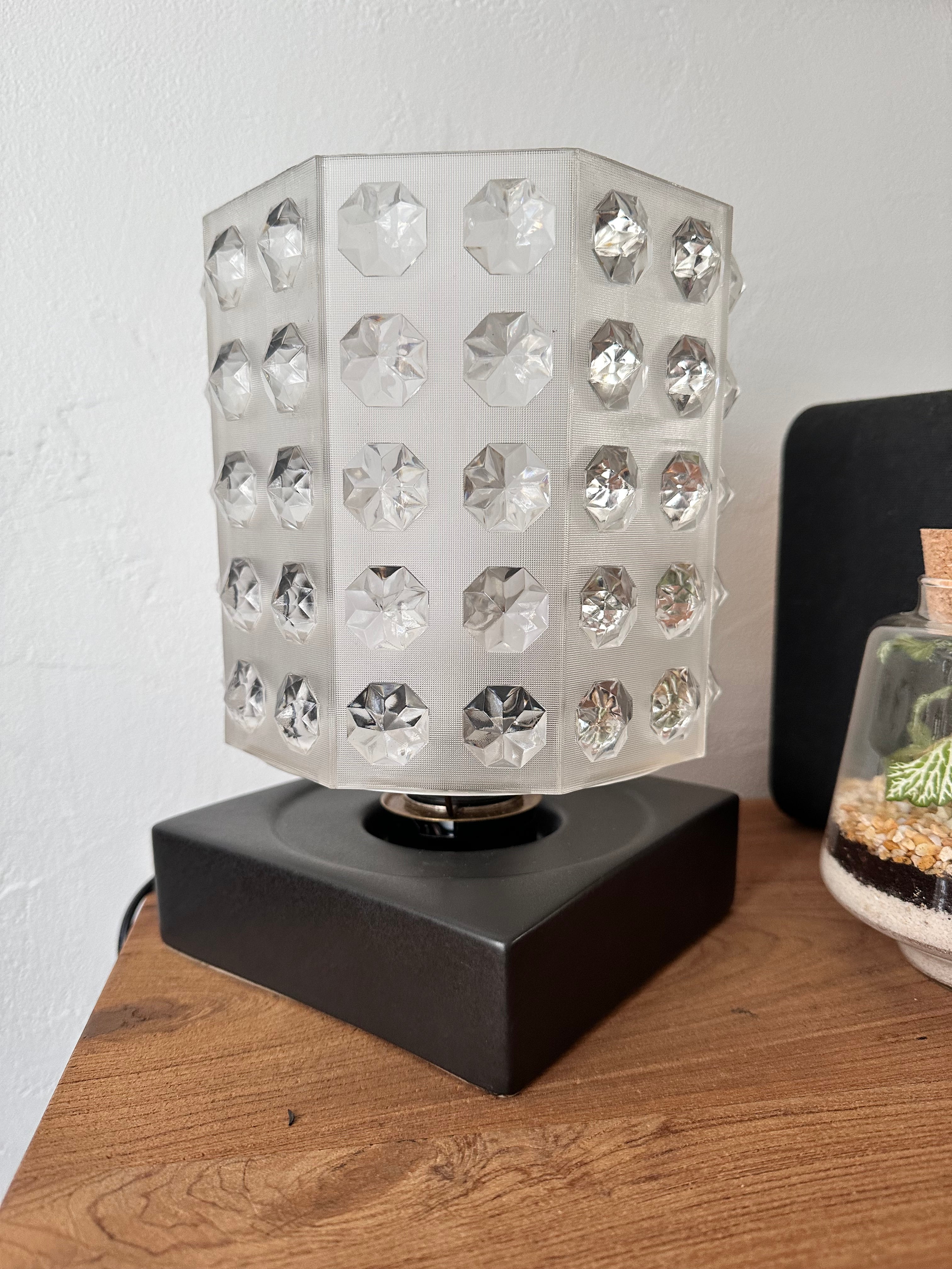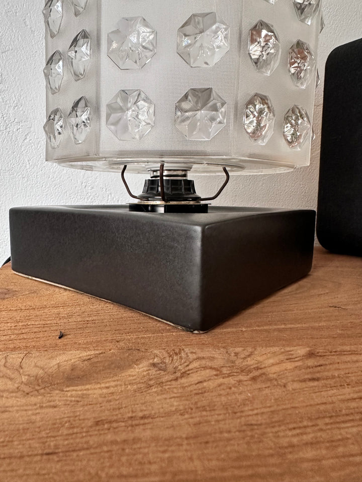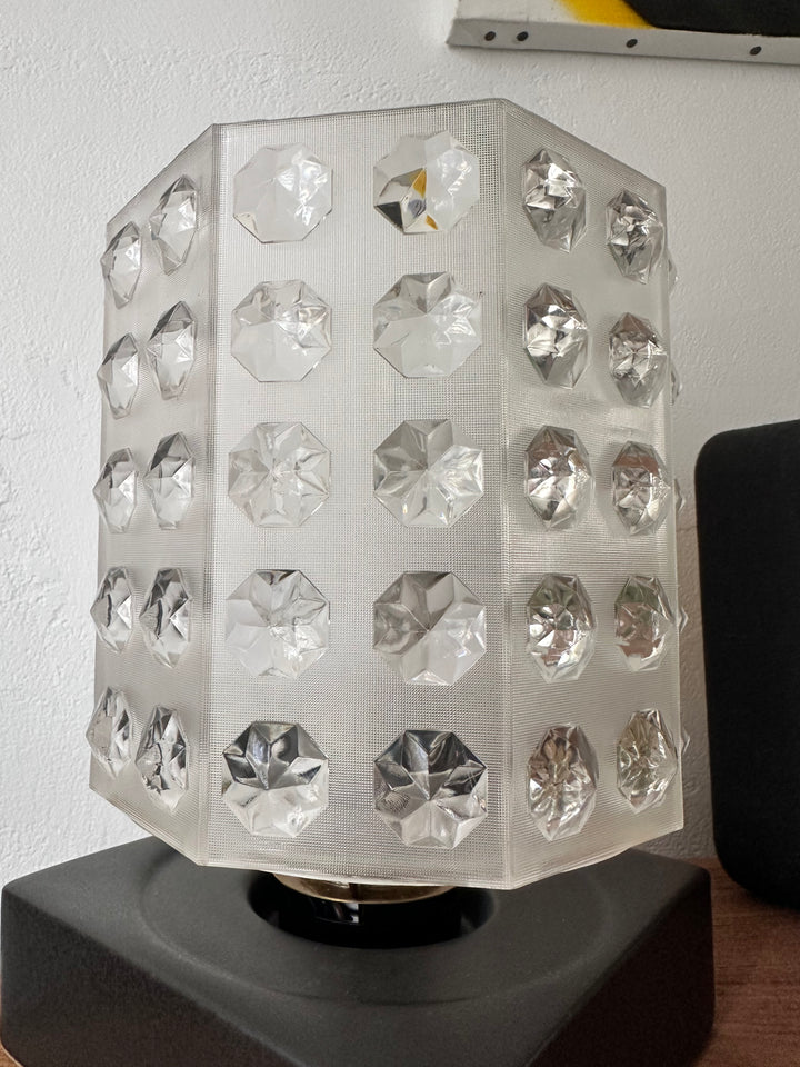 - Abat-jour octogonal en plastique dur translucide, avec en relief des formes rappelant celle des diamants, le pied de lampe est en céramique marron