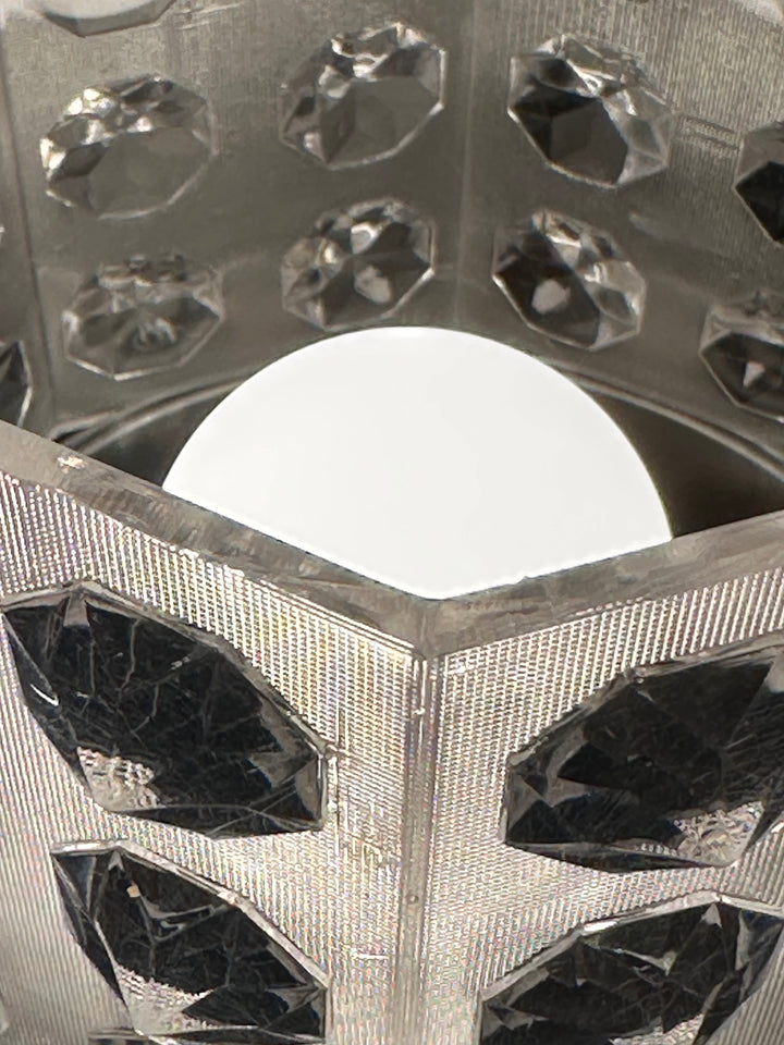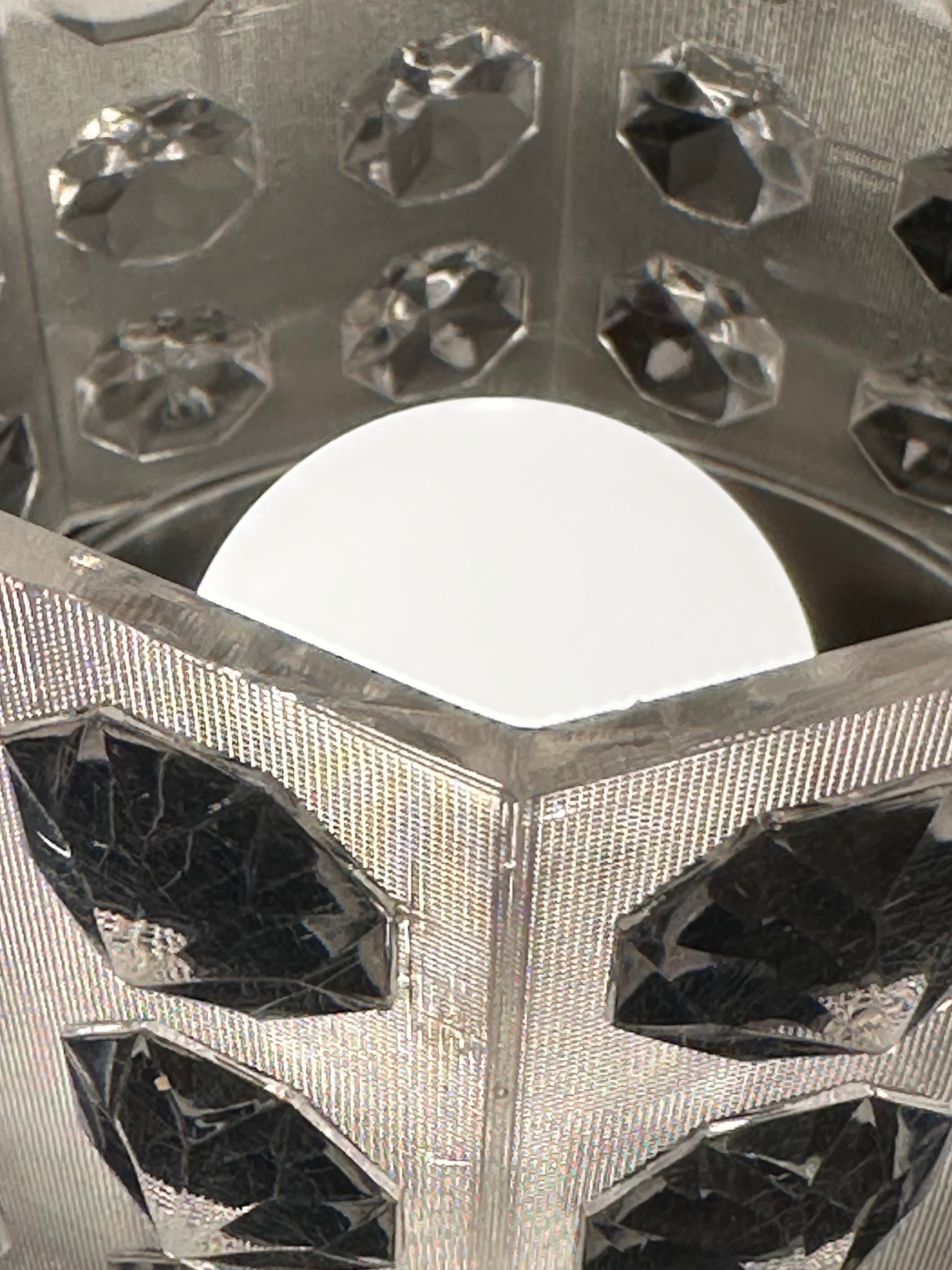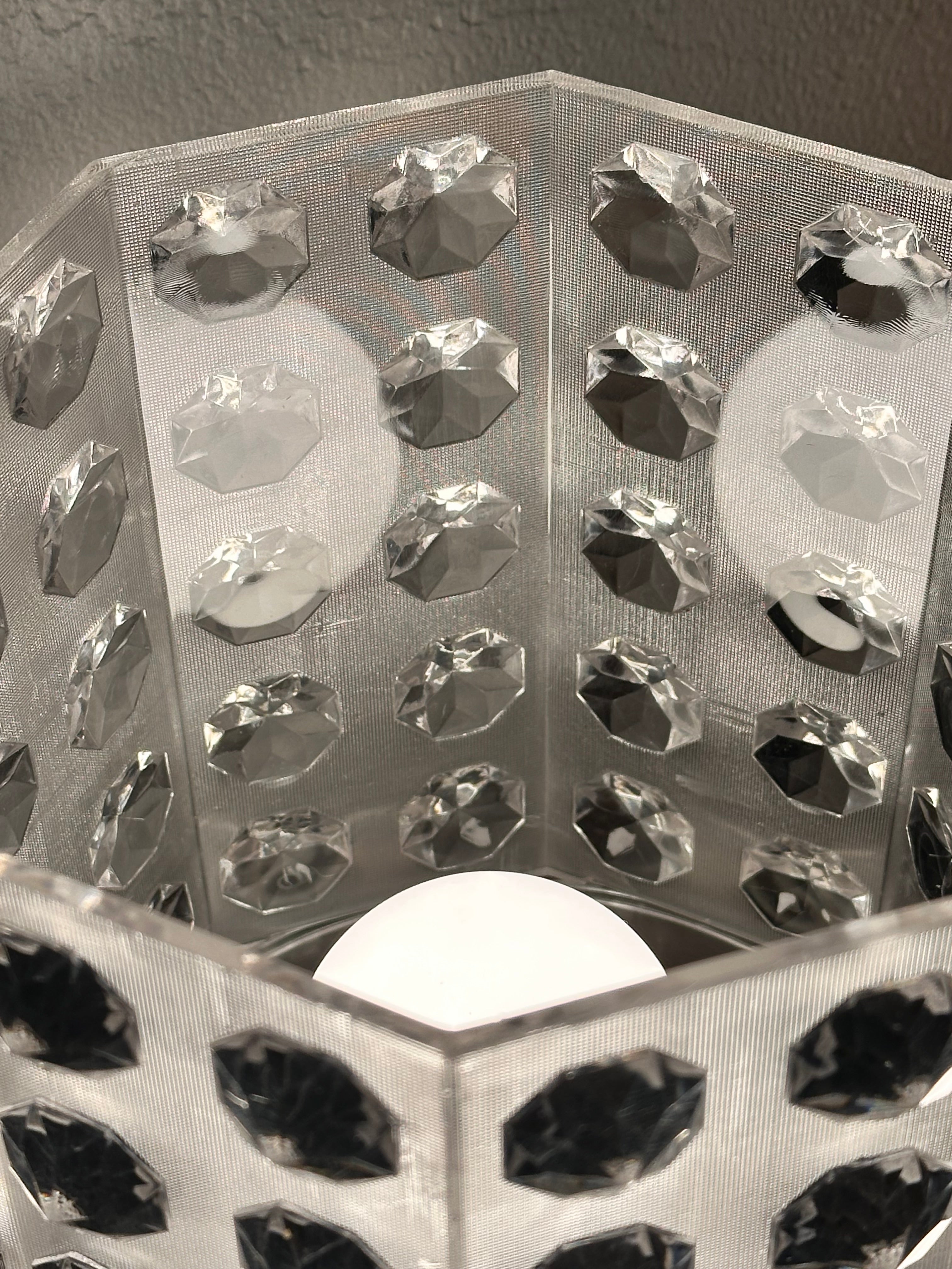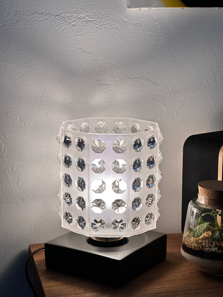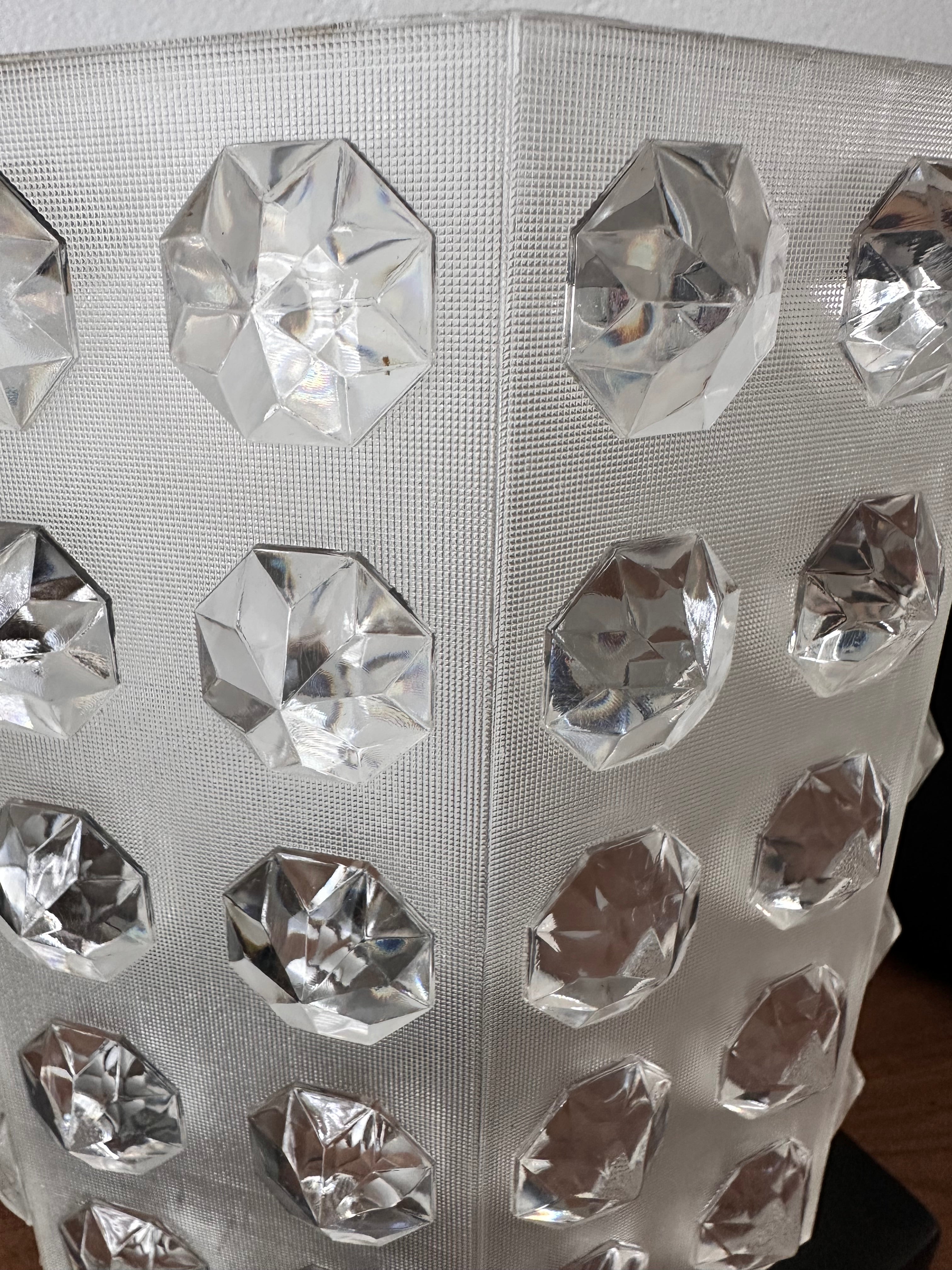 - Abat-jour octogonal en plastique dur translucide, avec en relief des formes rappelant celle des diamants, le pied de lampe est en céramique marron