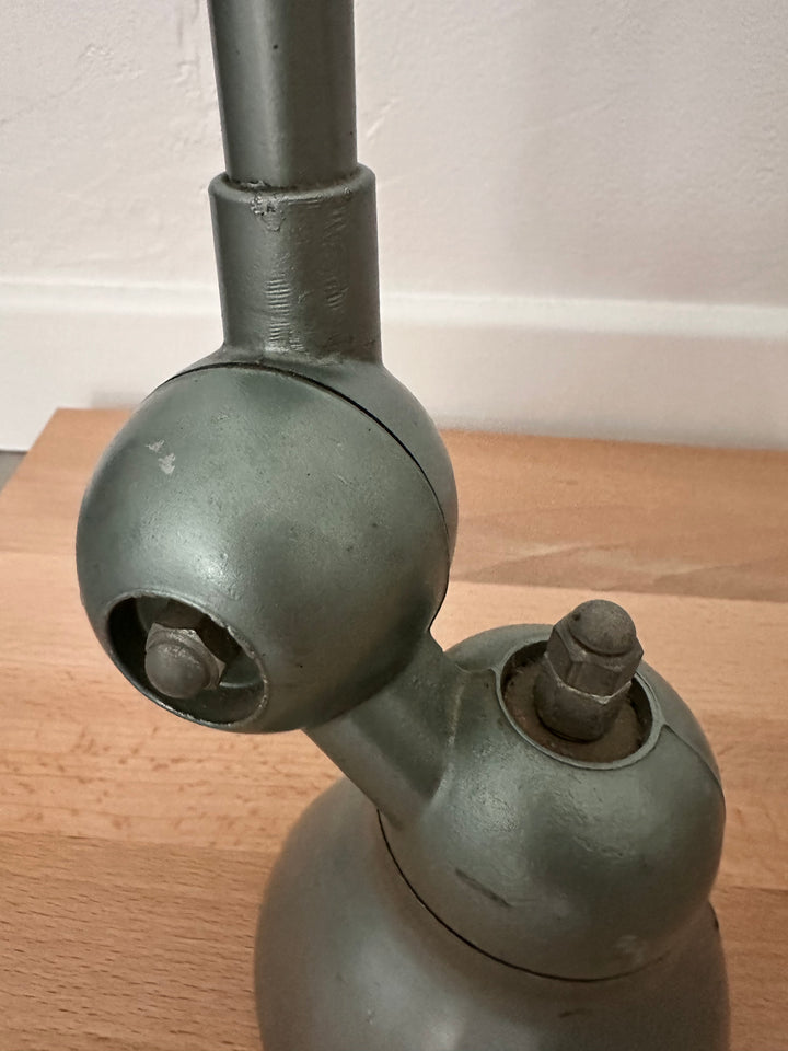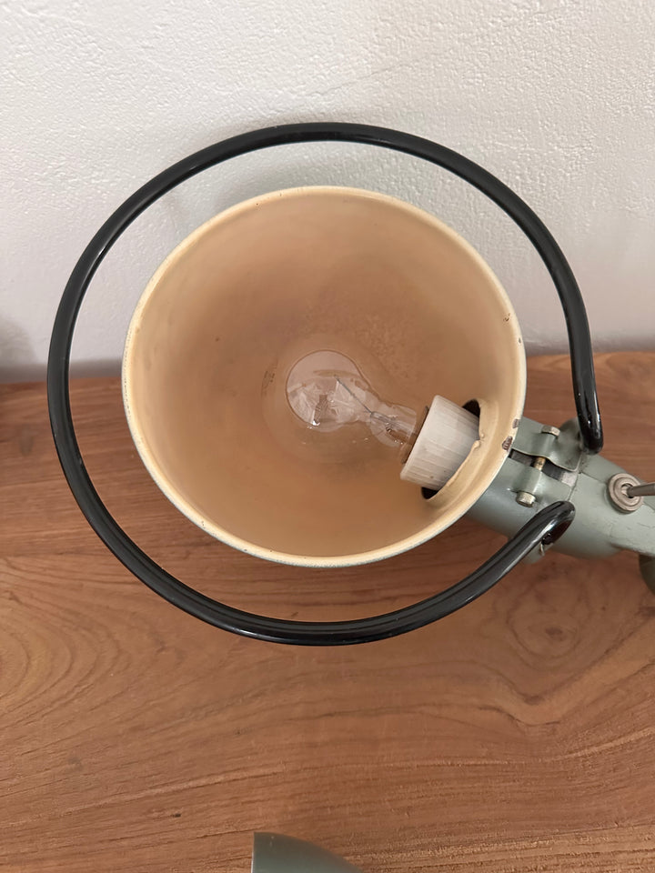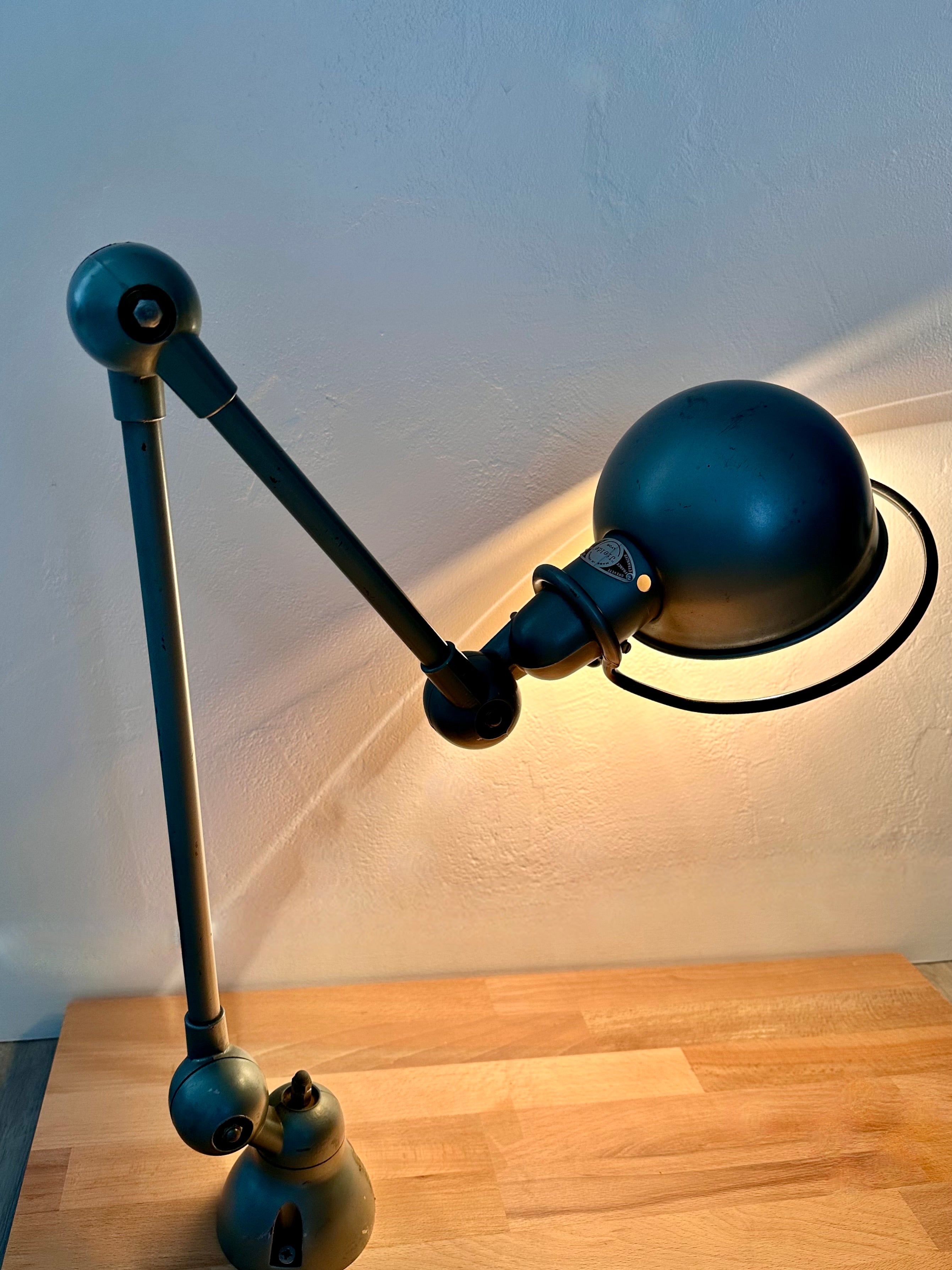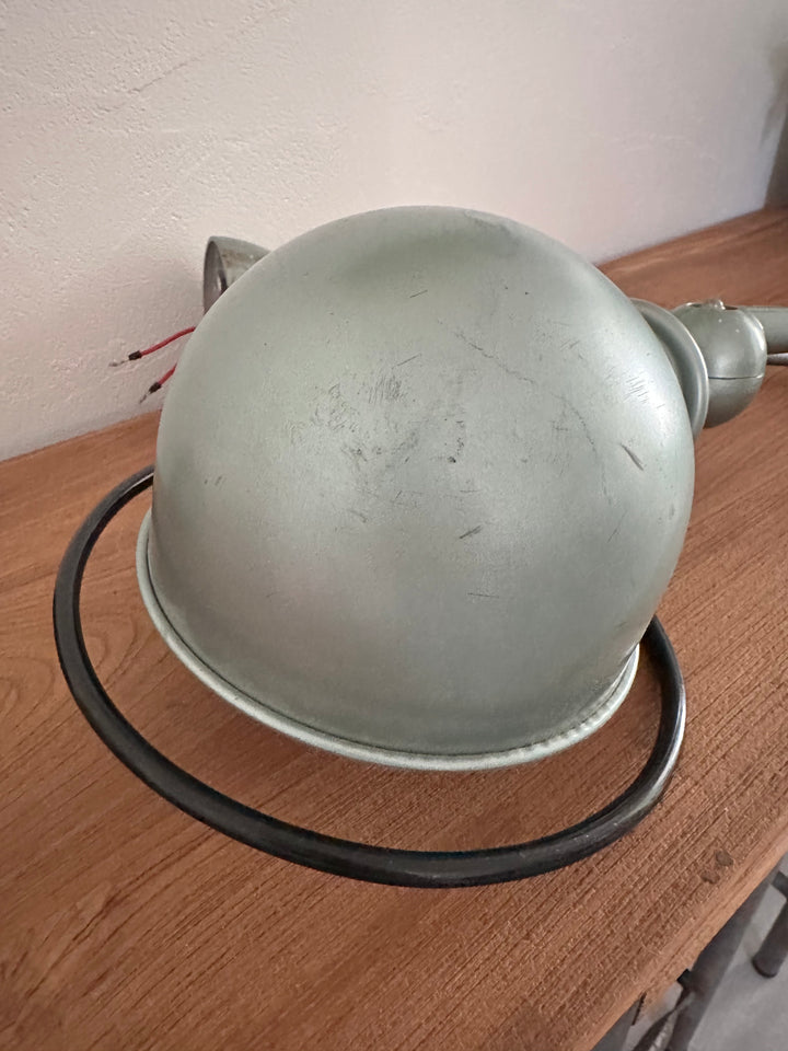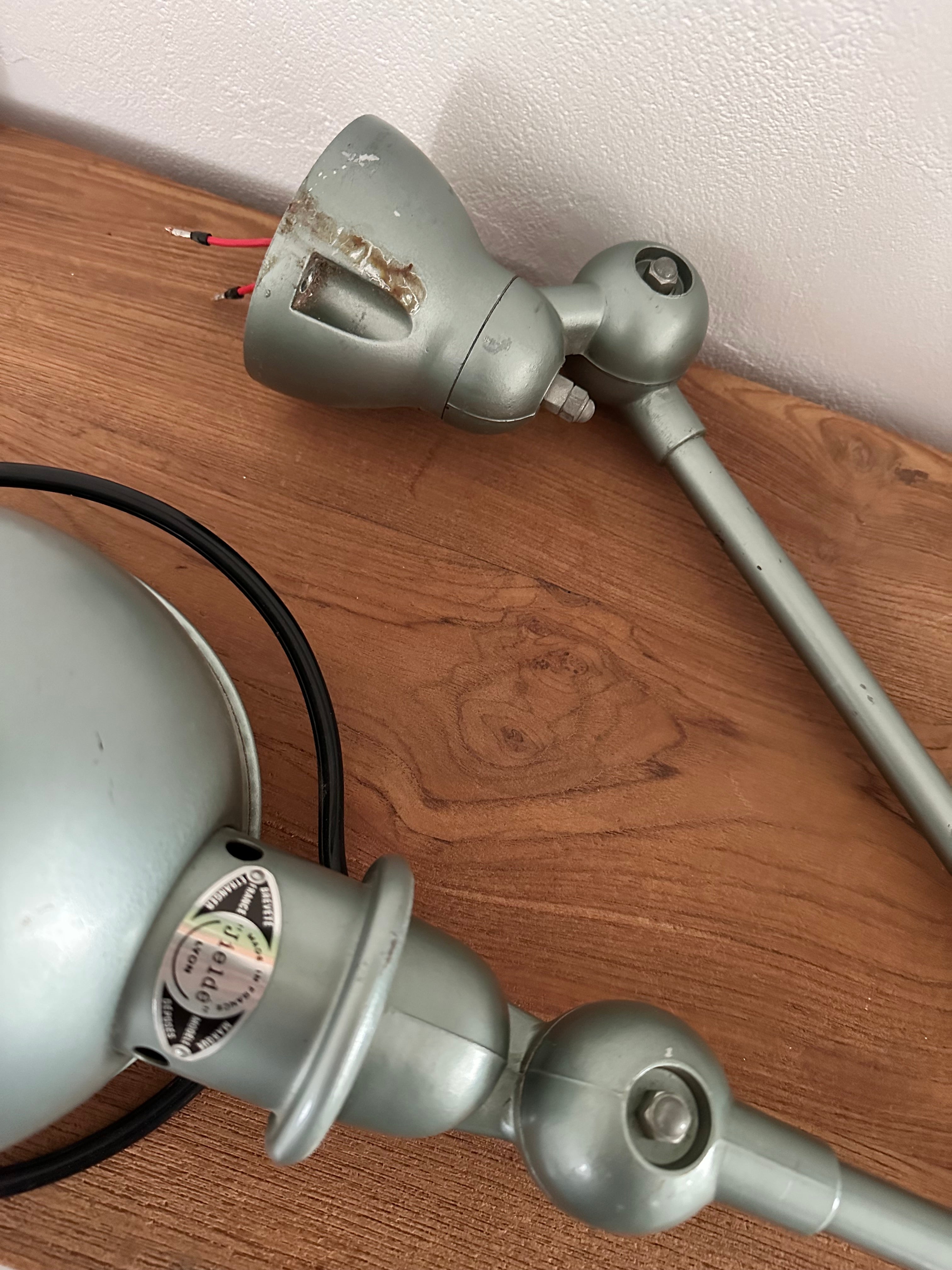 - Magnifique lampe Jieldé, 2 bras, datant d'avant les années 80 selon sa plaque rivetée d'origine, elle a passé sa vie dans l'atelier d'un Papy qui en a pris soin, aujourd'hui elle mérite une seconde vie pour décorer un établi, un bureau ou un mur par exemple grâce à sa modulabilité, sa couleur gris vert s'adaptera à tous styles d'intérieur