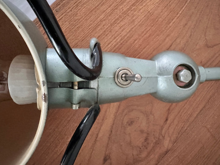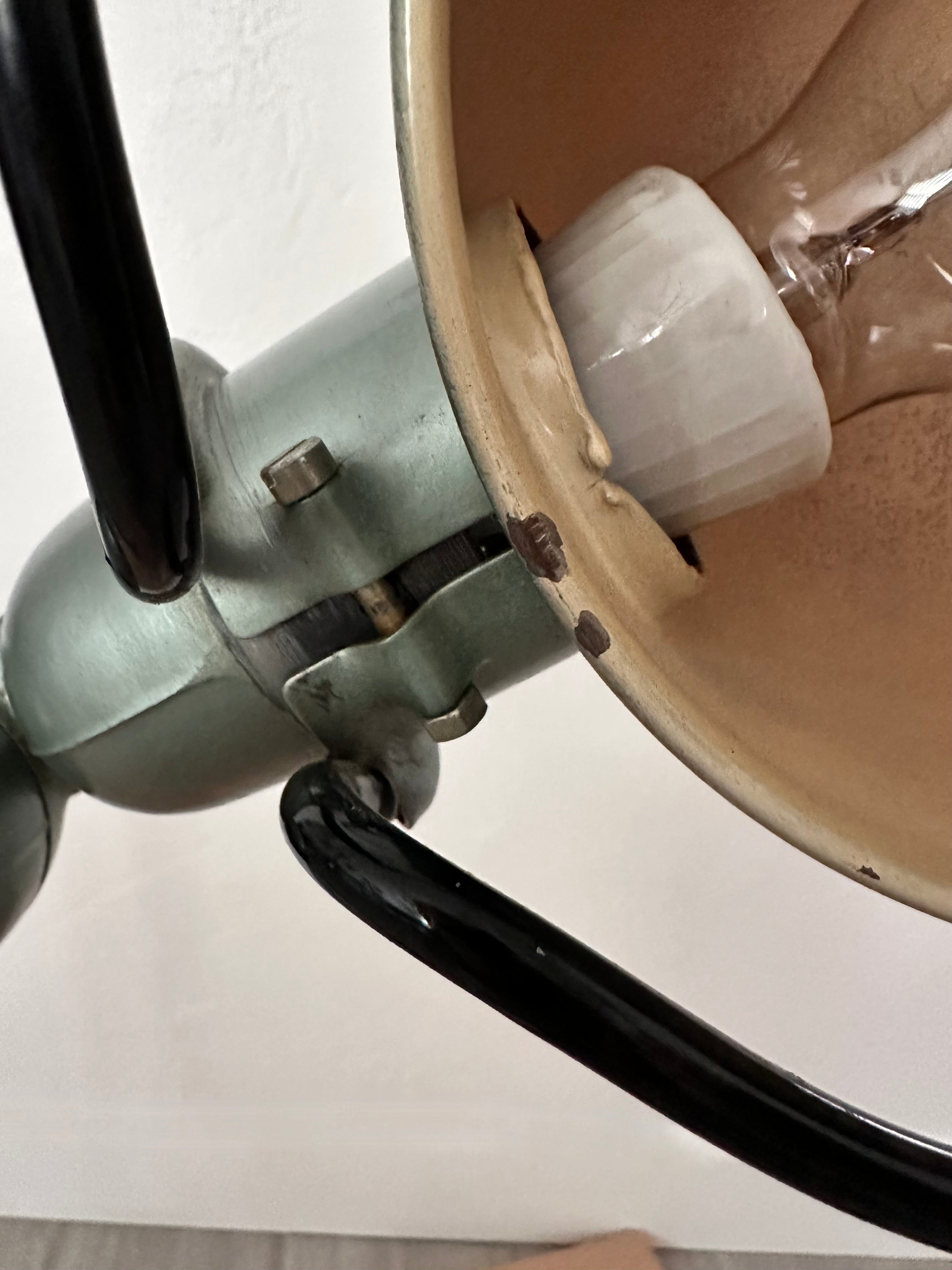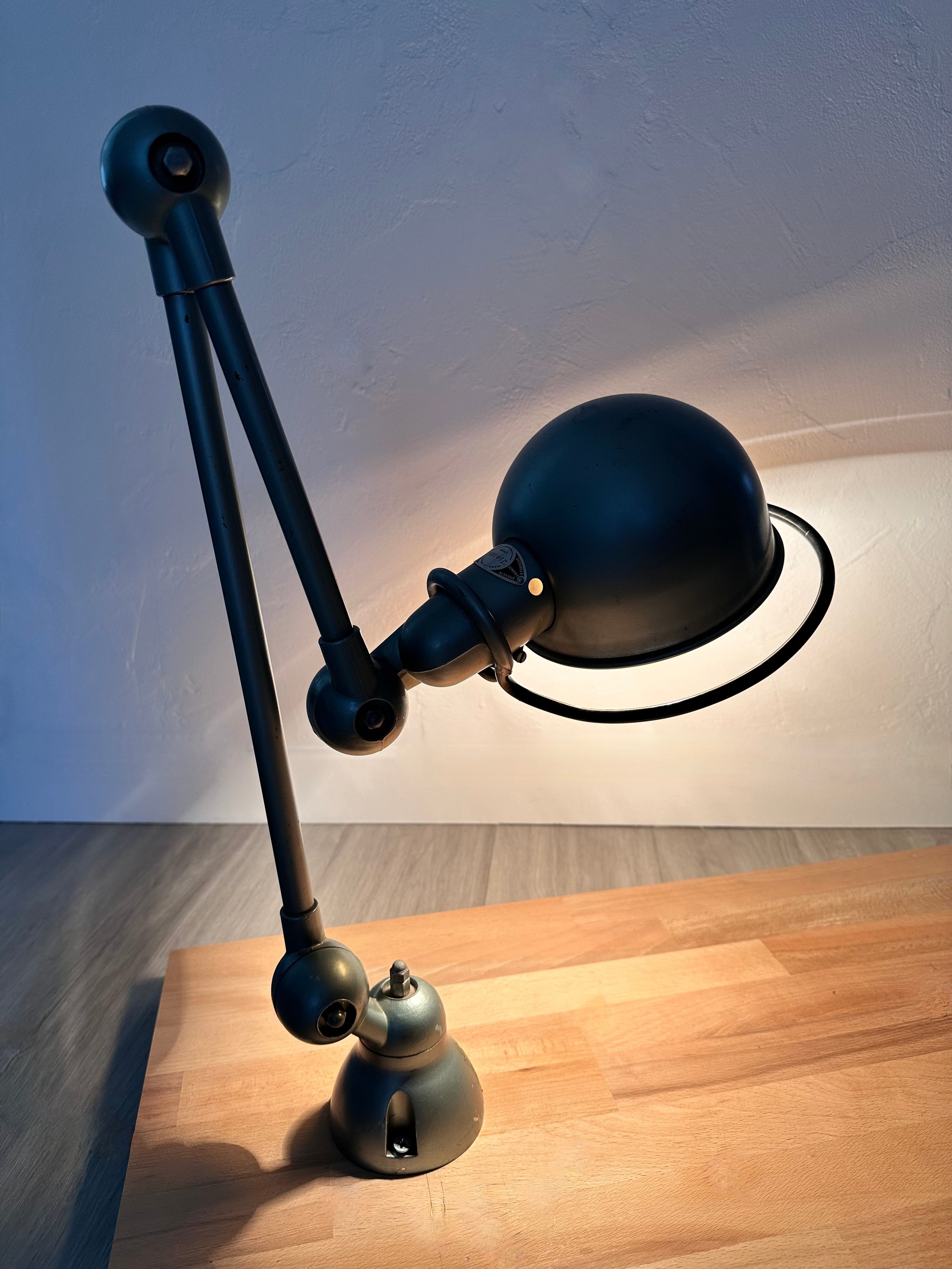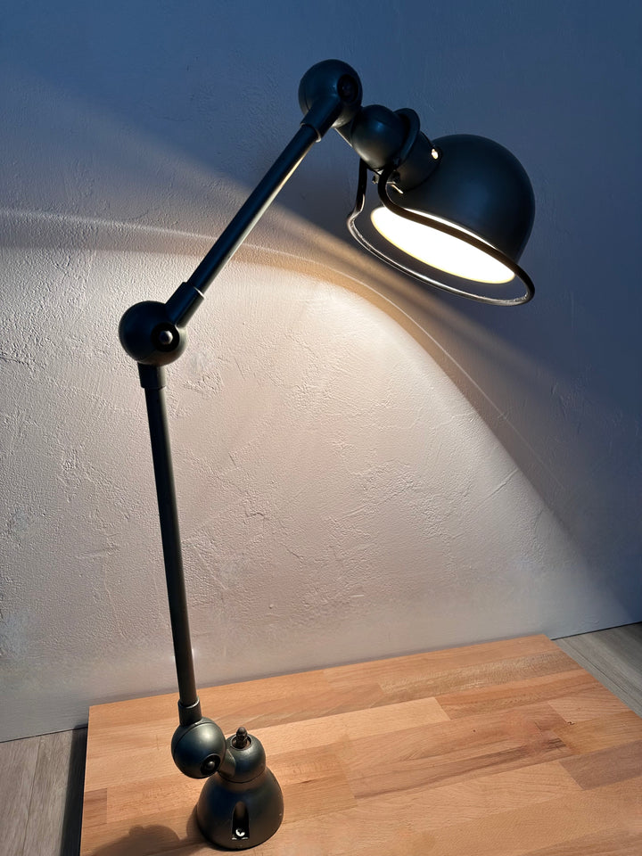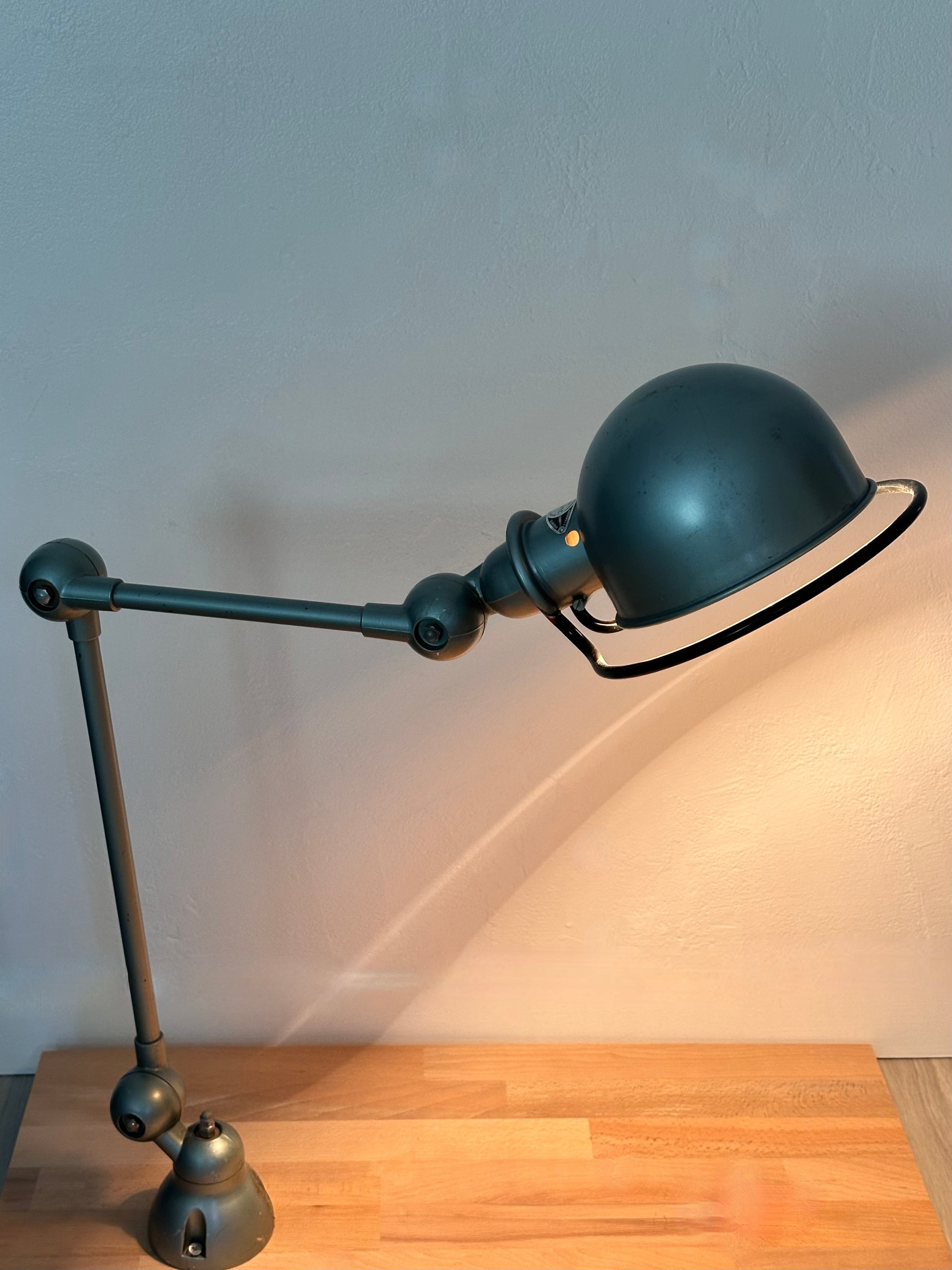 - Magnifique lampe Jieldé, 2 bras, datant d'avant les années 80 selon sa plaque rivetée d'origine, elle a passé sa vie dans l'atelier d'un Papy qui en a pris soin, aujourd'hui elle mérite une seconde vie pour décorer un établi, un bureau ou un mur par exemple grâce à sa modulabilité, sa couleur gris vert s'adaptera à tous styles d'intérieur
