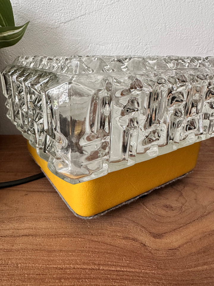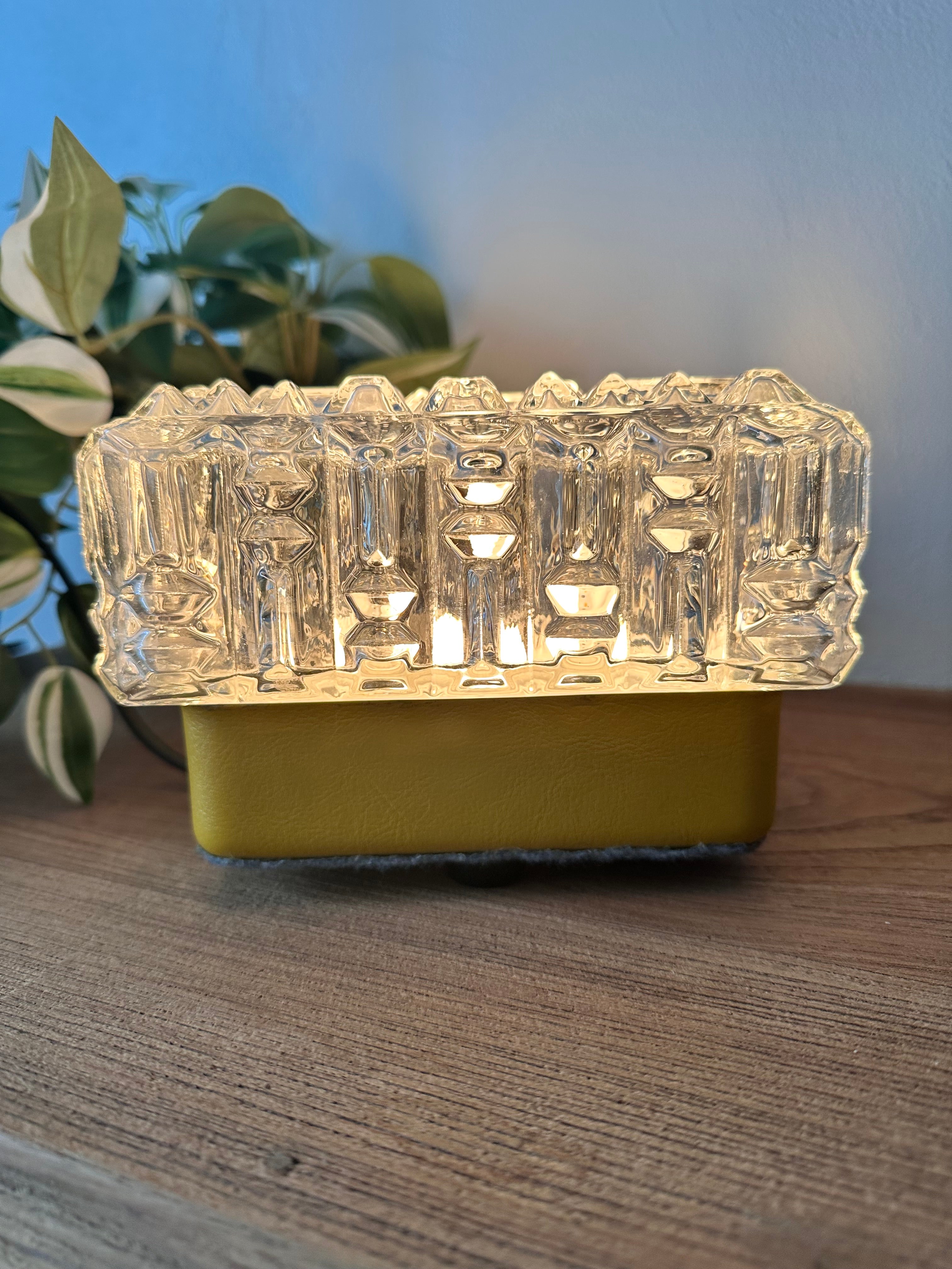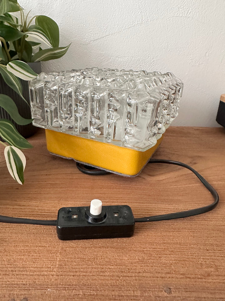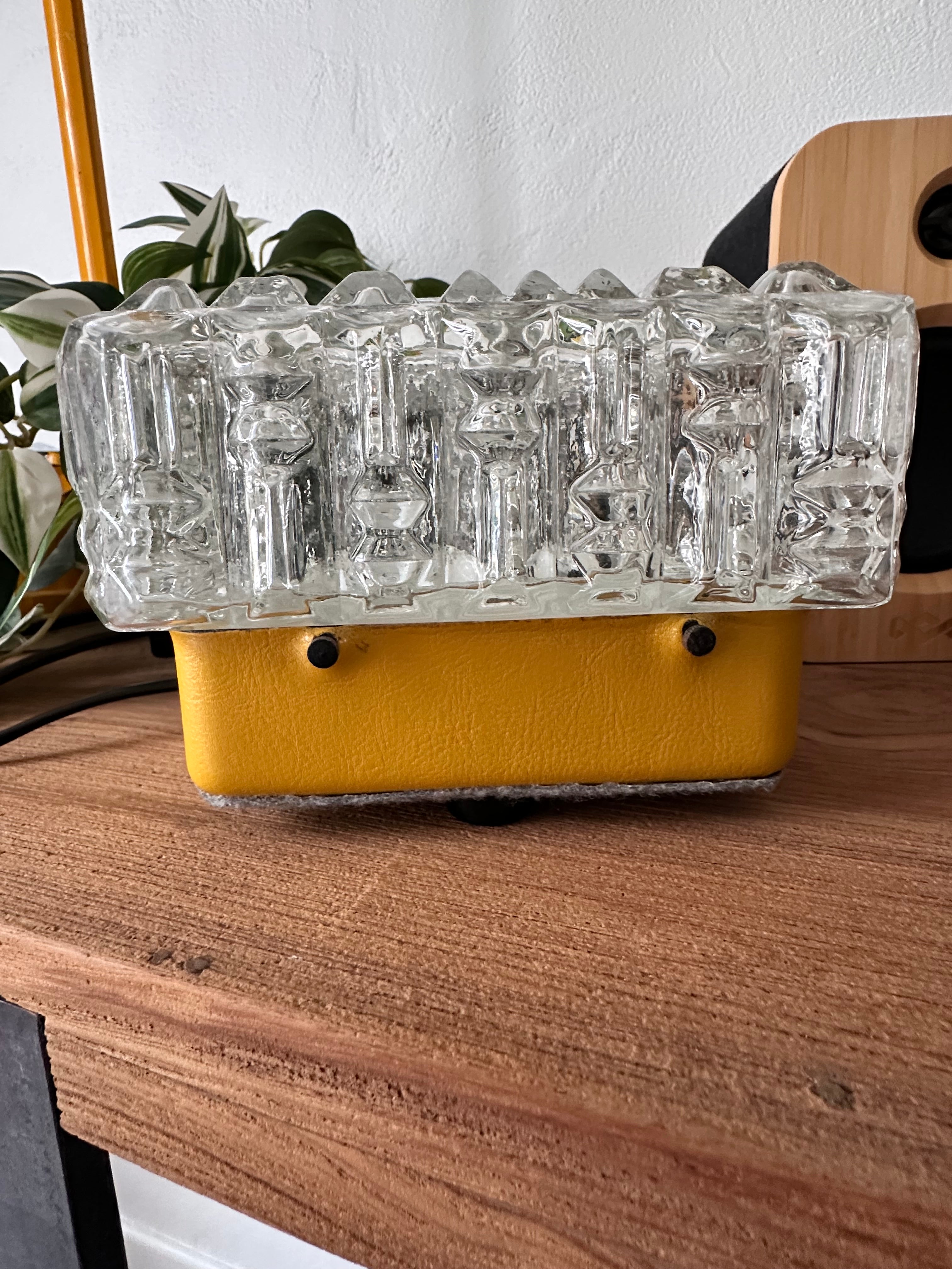 - Lampe à poser composée d'un magnifique globe en verre épais travaillé pour un effet motif diamant, sur un support en métal recouvert de cuir jaune moutarde qui a été restauré pour un plus bel effet, le dessous est aussi original puisqu'il a été recouvert d'un feutre gris et orné de 4 petits pieds tout cela la rendant unique