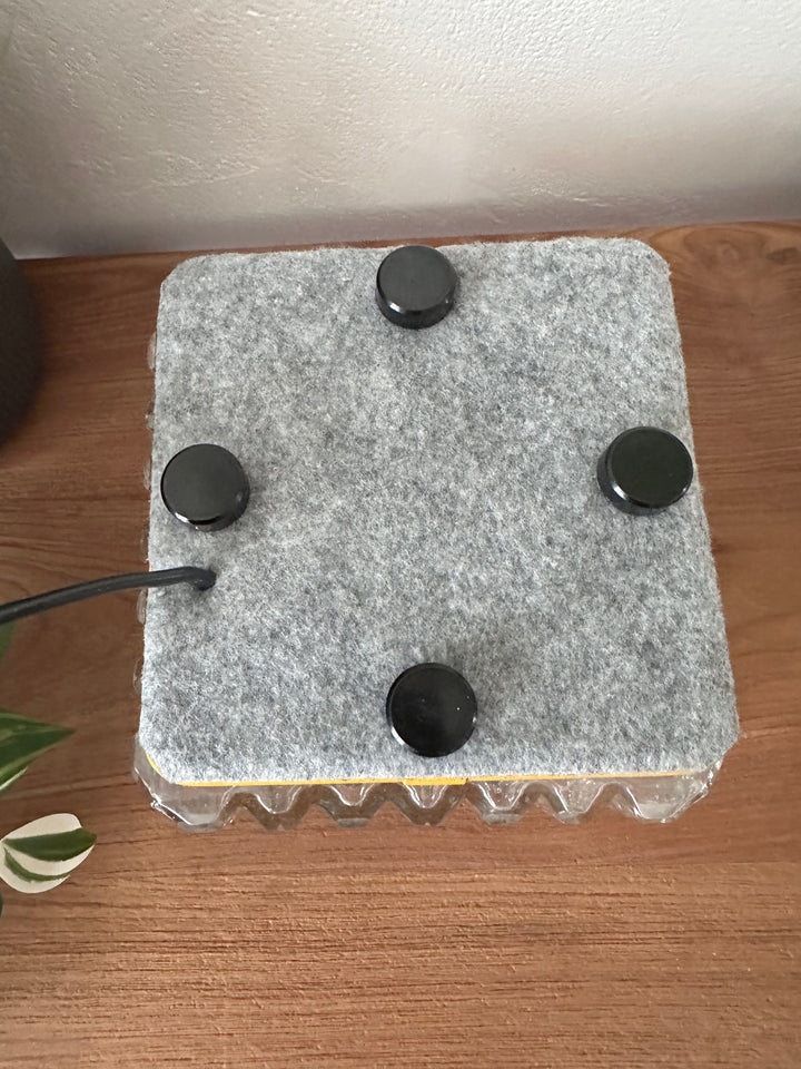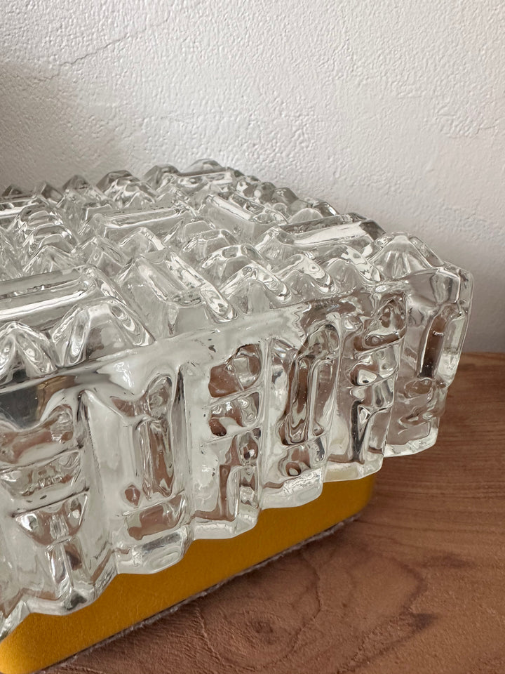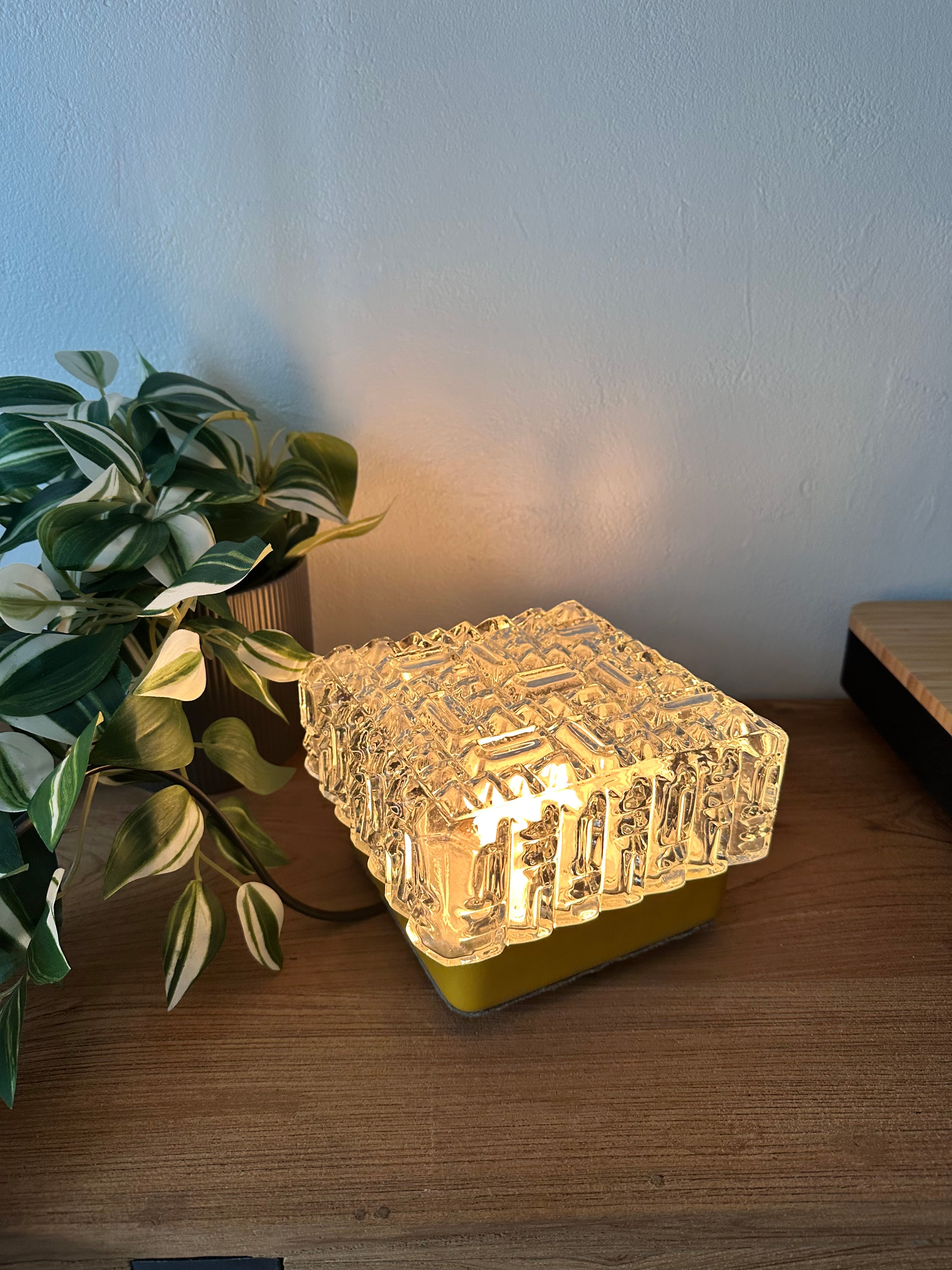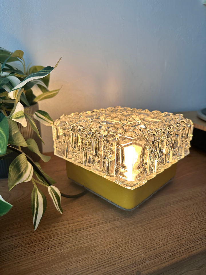 - Lampe à poser composée d'un magnifique globe en verre épais travaillé pour un effet motif diamant, sur un support en métal recouvert de cuir jaune moutarde qui a été restauré pour un plus bel effet, le dessous est aussi original puisqu'il a été recouvert d'un feutre gris et orné de 4 petits pieds tout cela la rendant unique