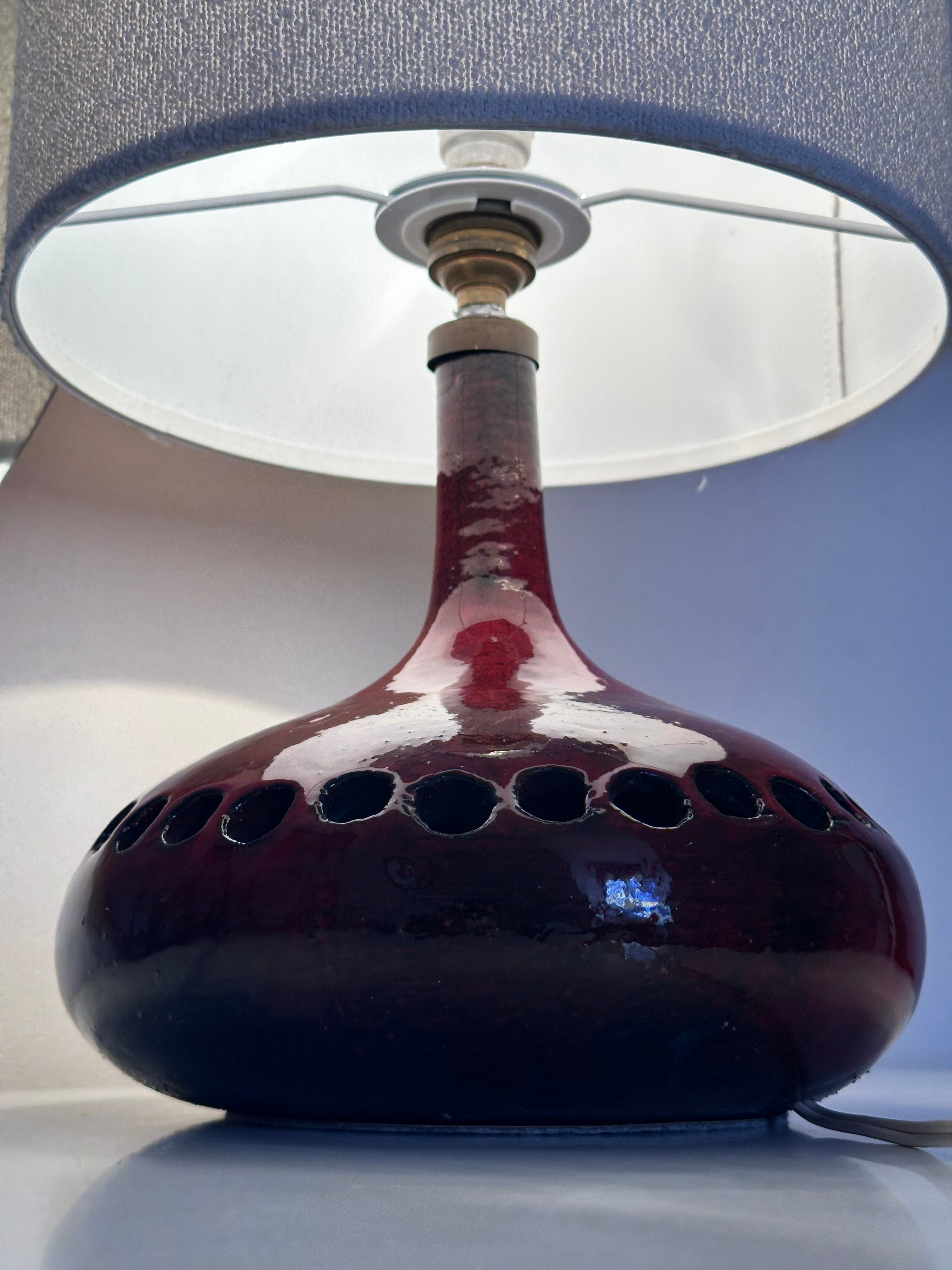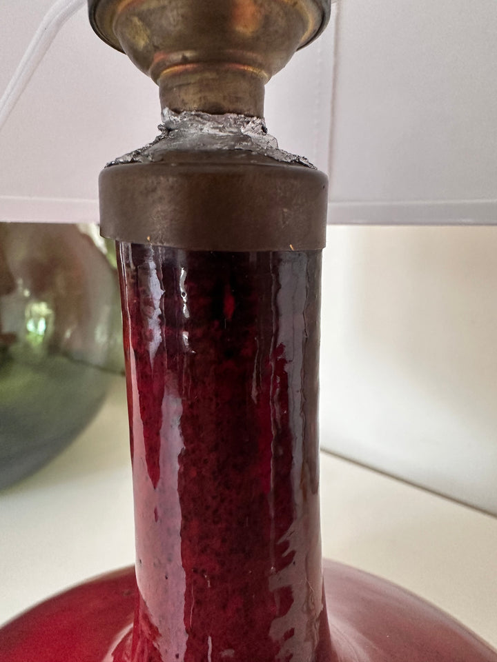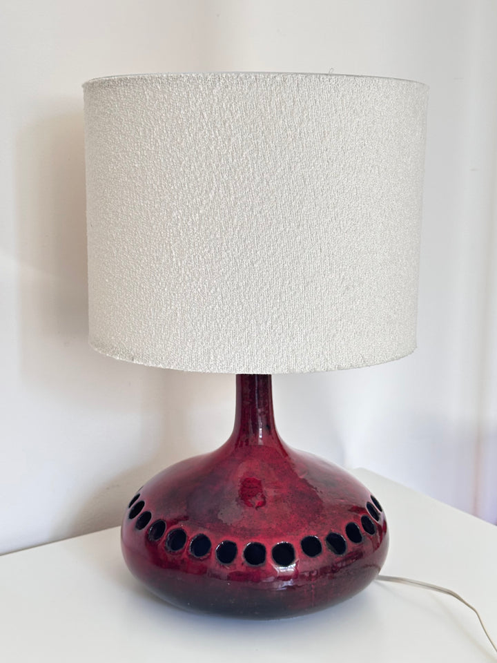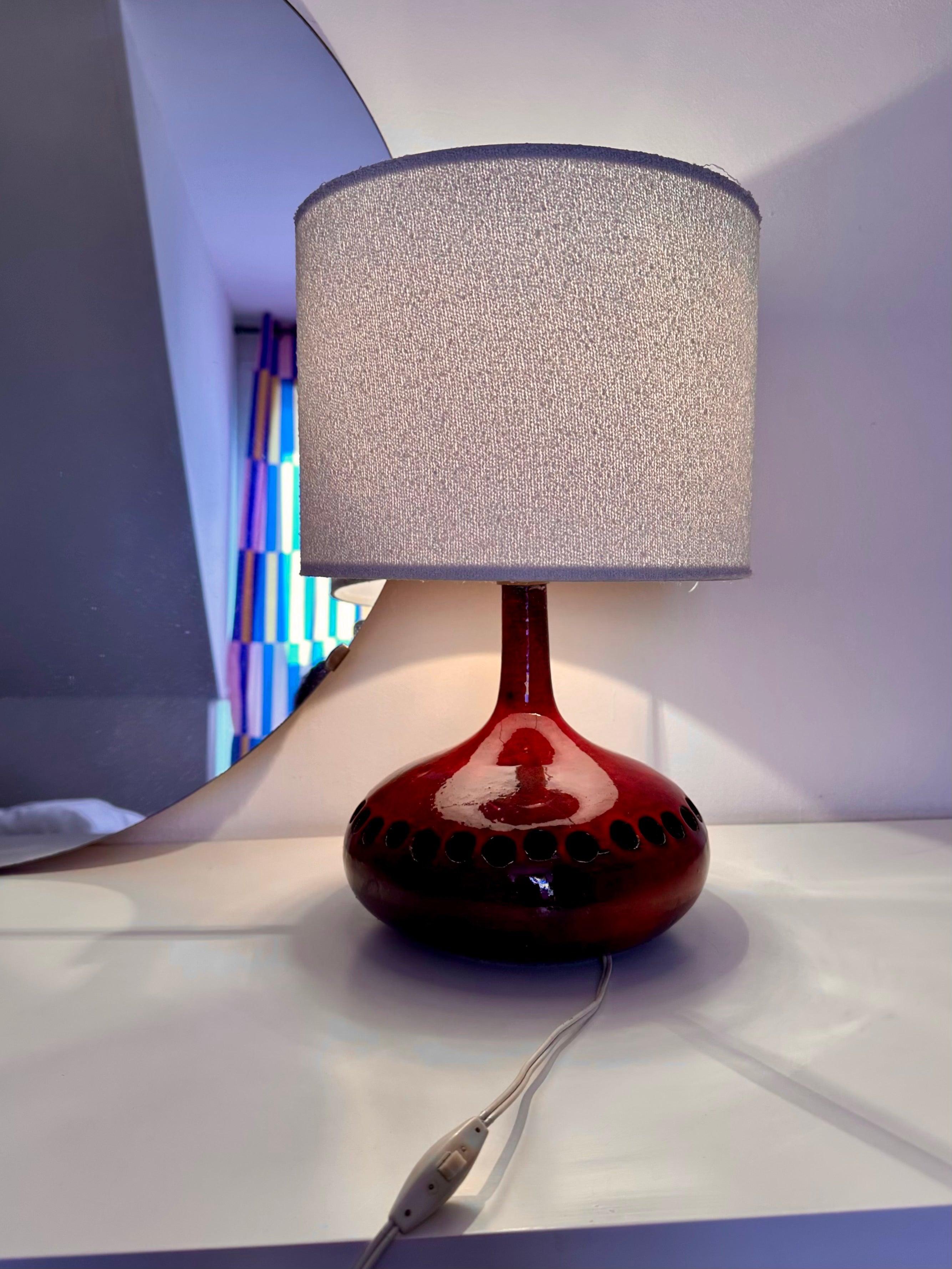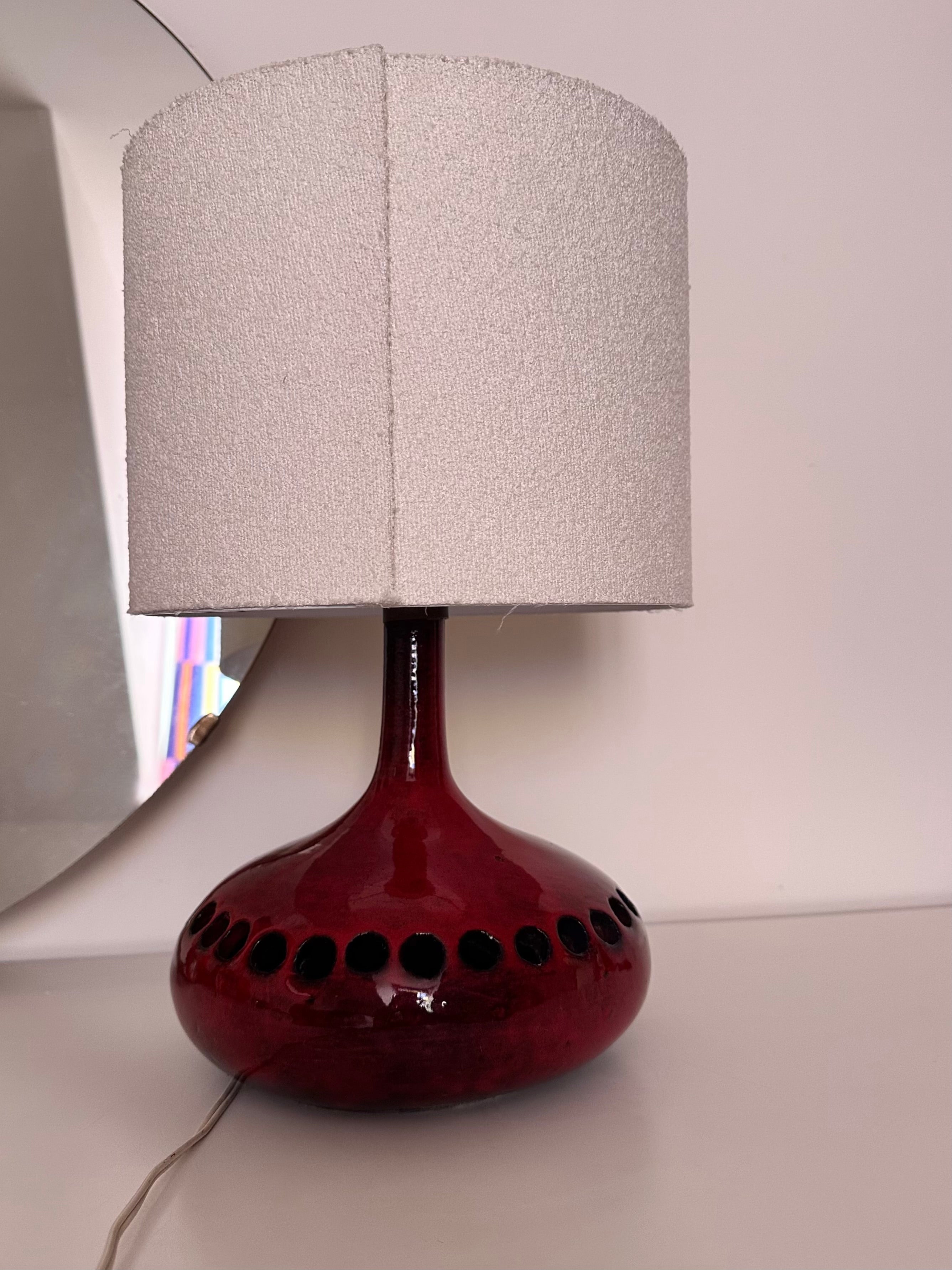 - Lampe des années 80 composée d'un pied en grés rouge bordeaux et d'un abat-jour d'aujourd'hui blanc, le mélange de l'ancien et du moderne afin de donner une seconde vie à ce joli pied chiné sur une brocante