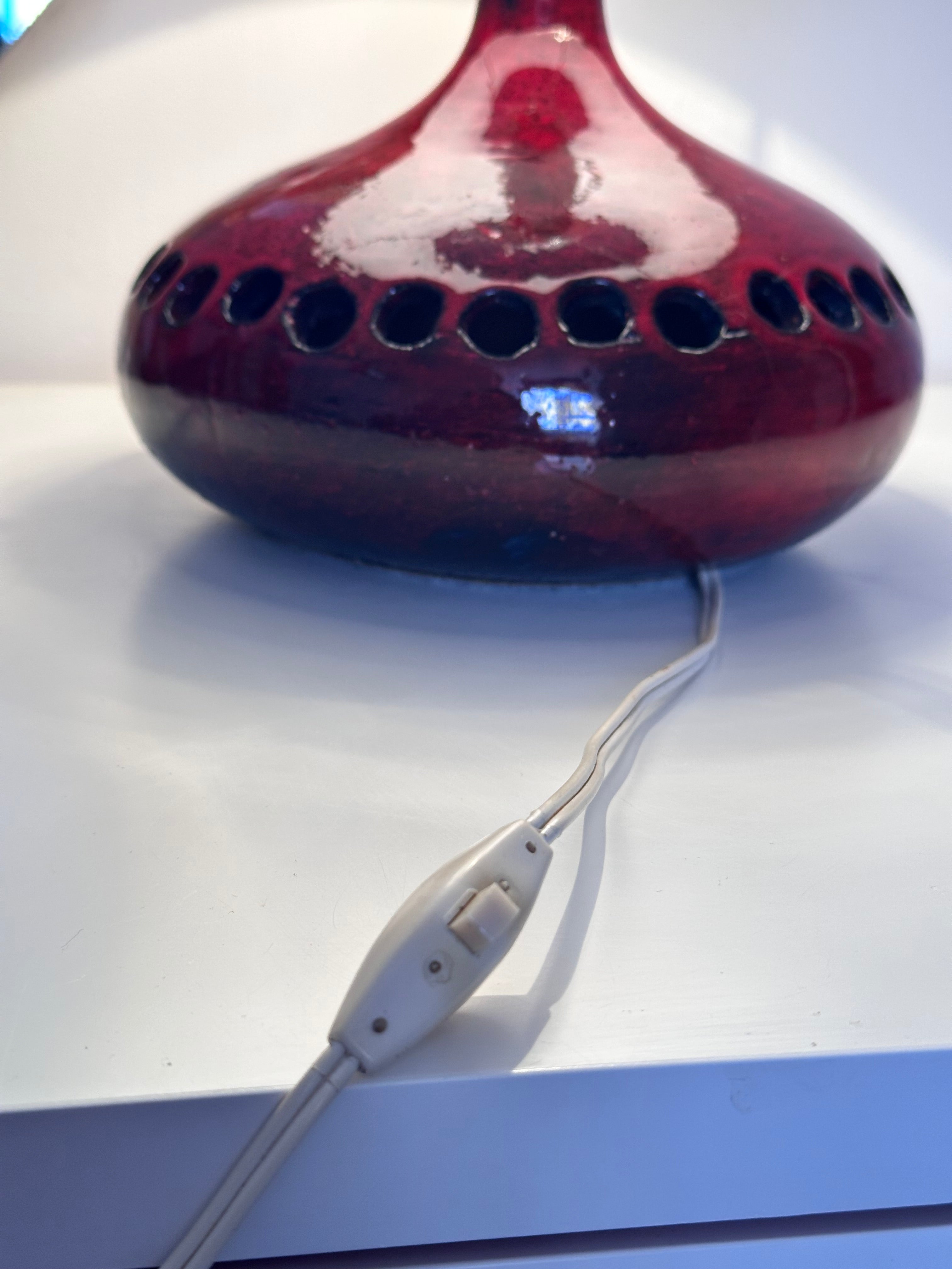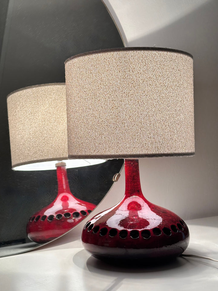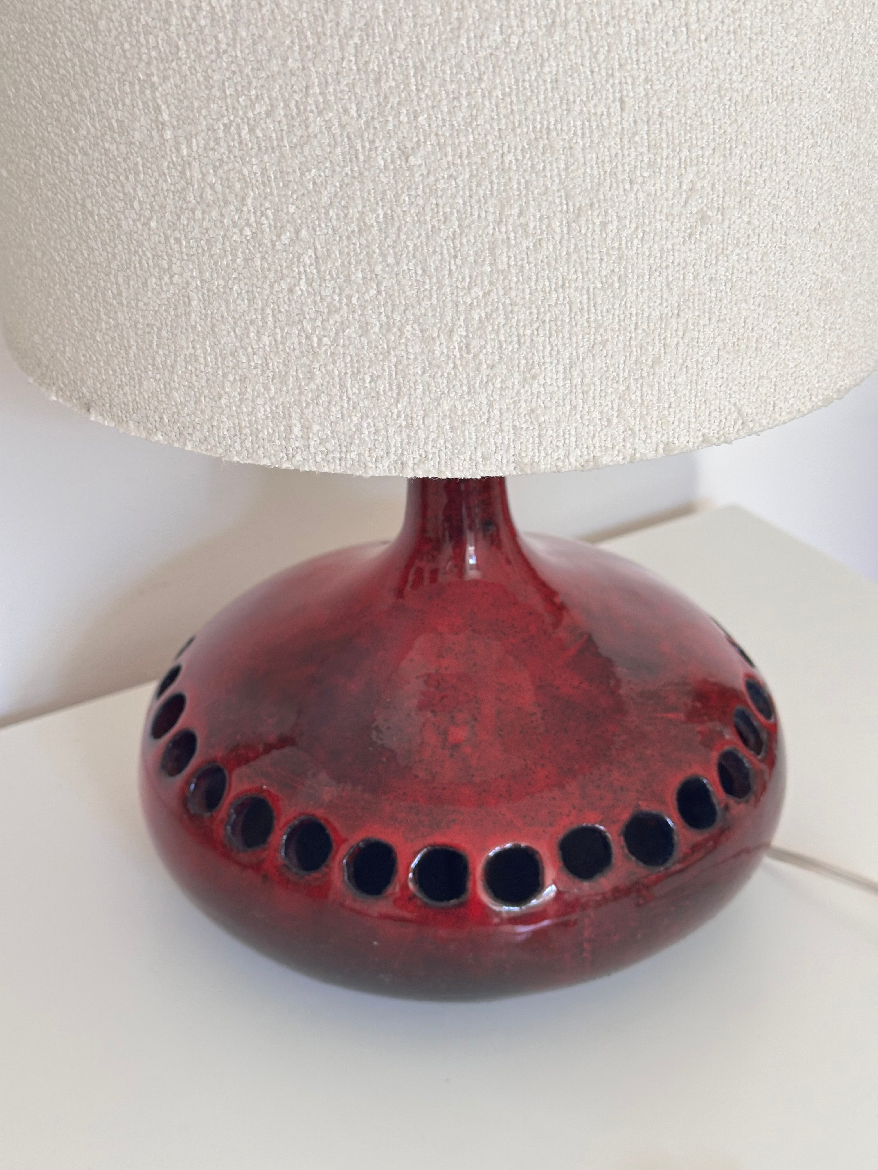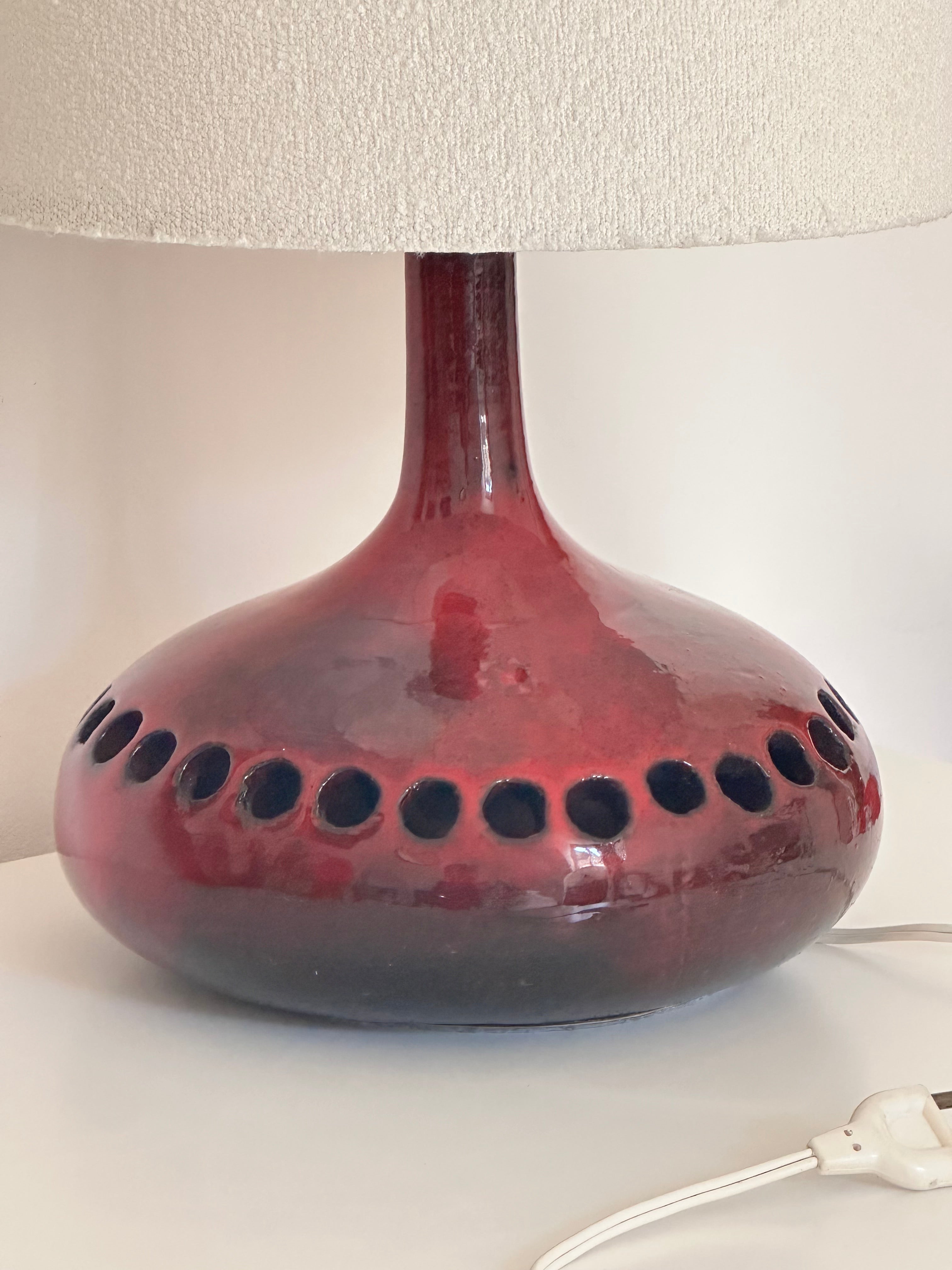 - Lampe des années 80 composée d'un pied en grés rouge bordeaux et d'un abat-jour d'aujourd'hui blanc, le mélange de l'ancien et du moderne afin de donner une seconde vie à ce joli pied chiné sur une brocante