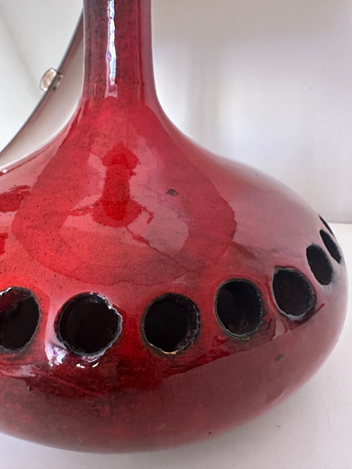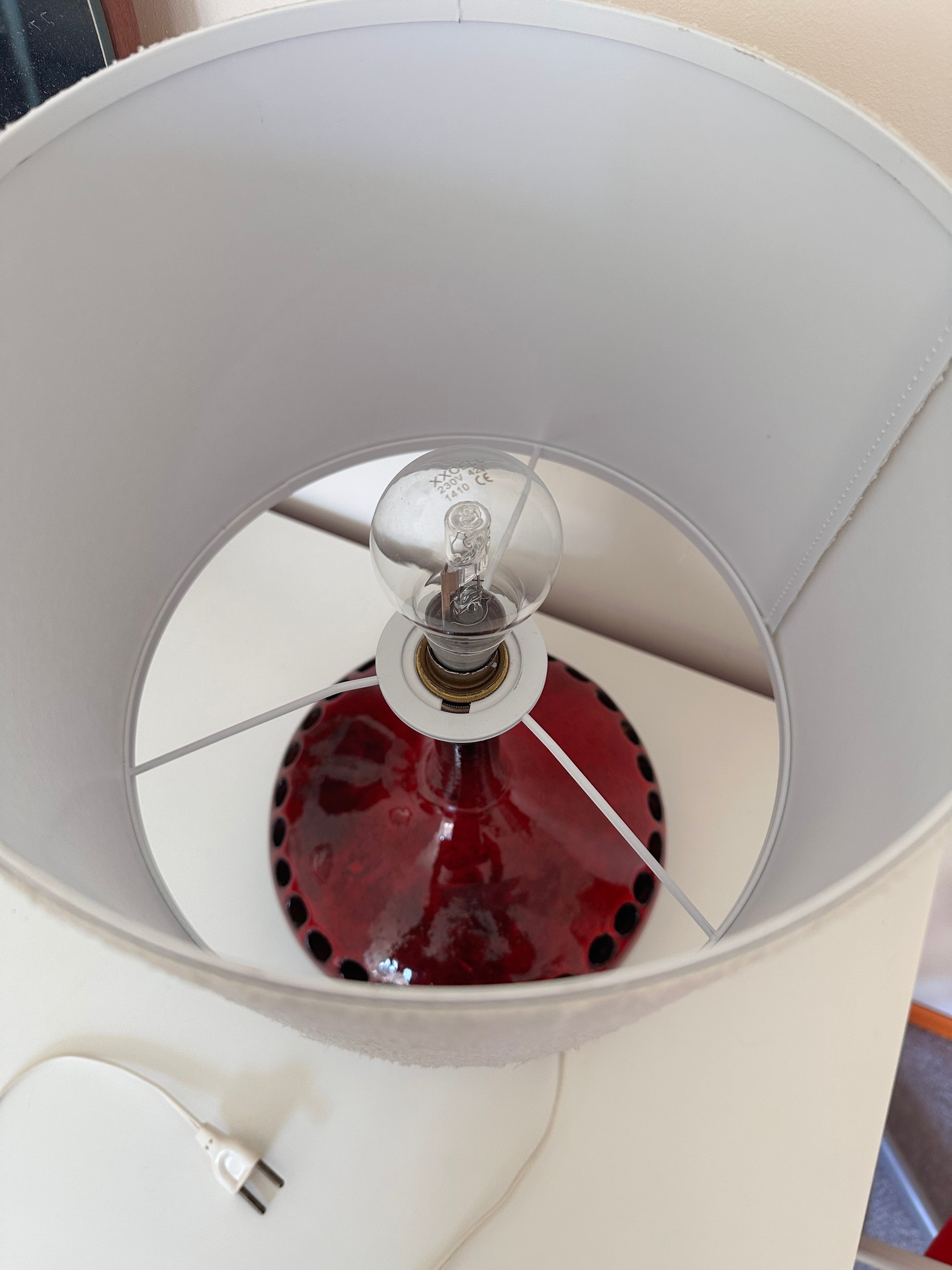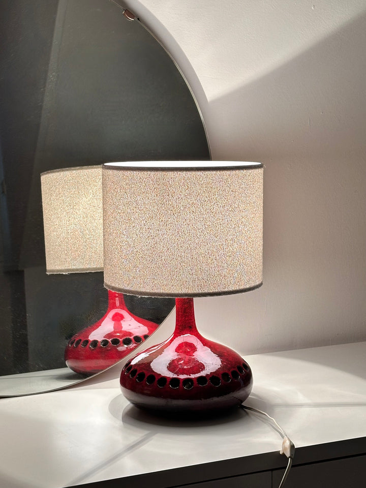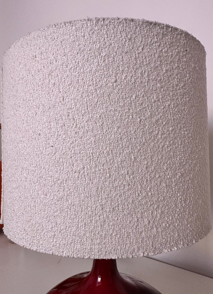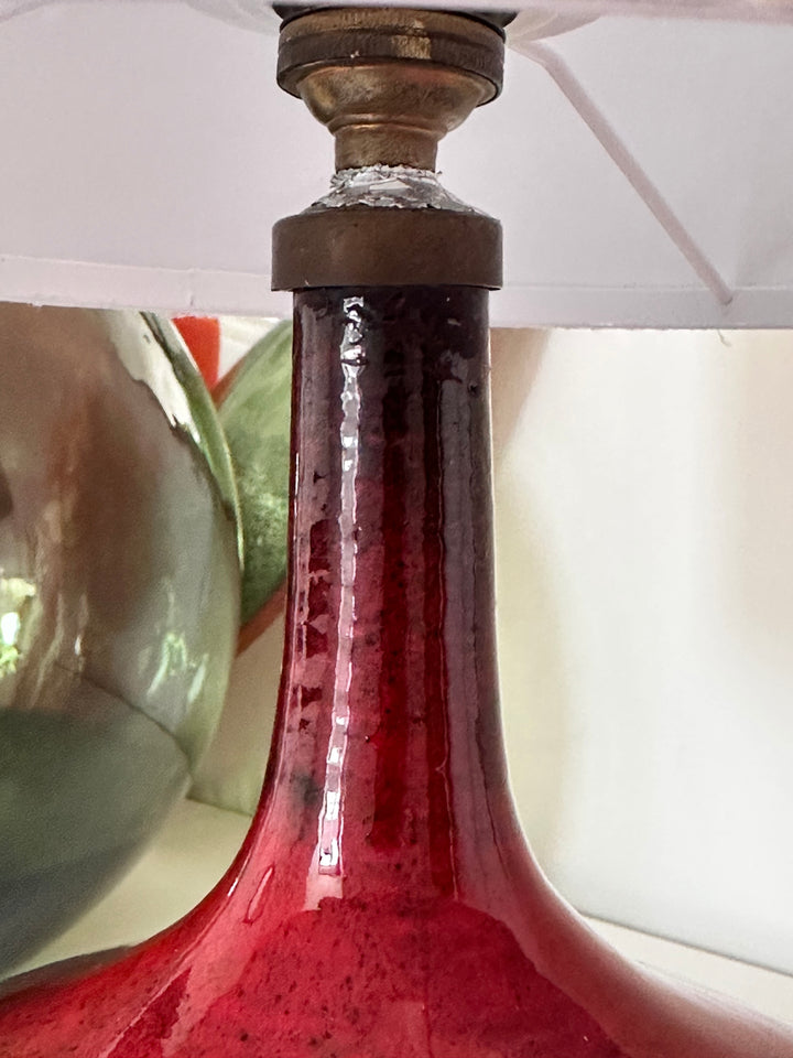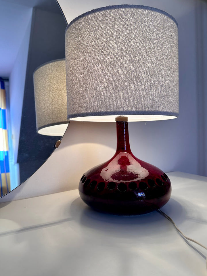 - Lampe des années 80 composée d'un pied en grés rouge bordeaux et d'un abat-jour d'aujourd'hui blanc, le mélange de l'ancien et du moderne afin de donner une seconde vie à ce joli pied chiné sur une brocante