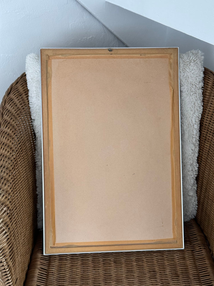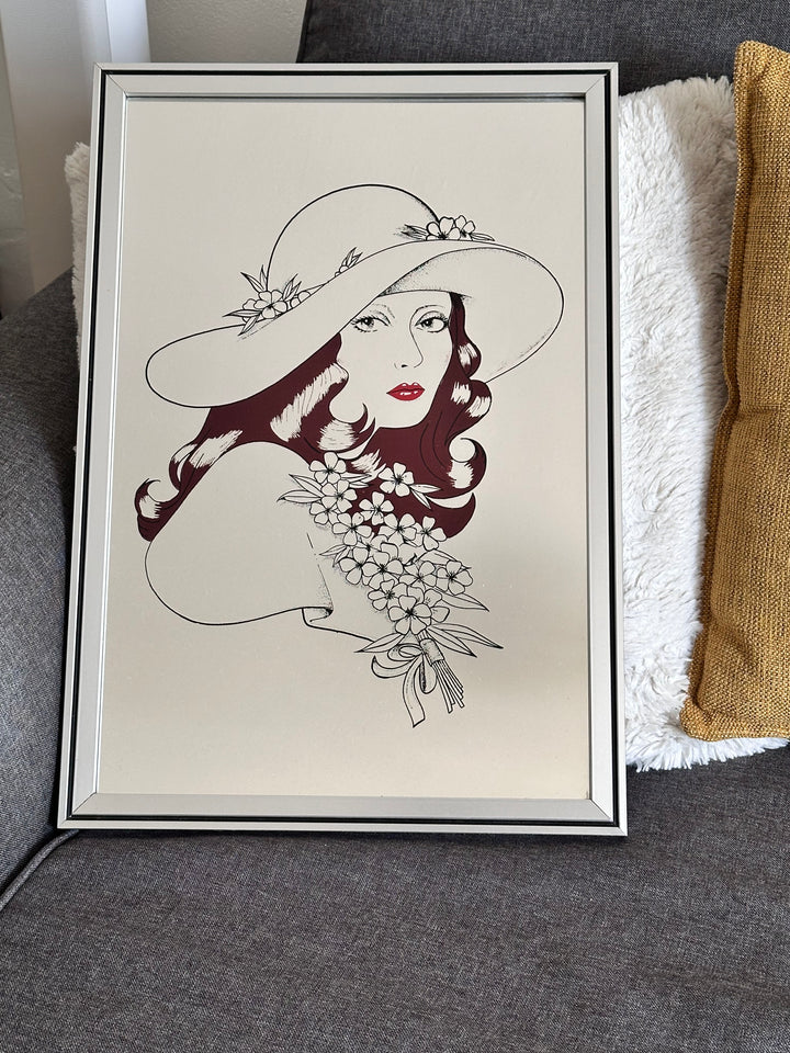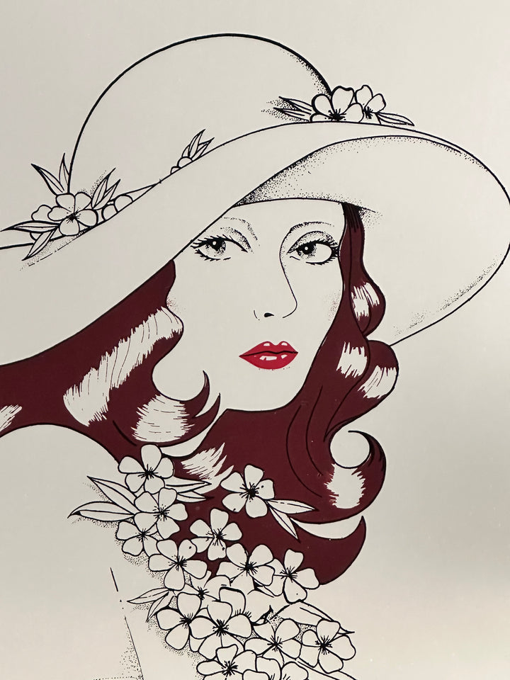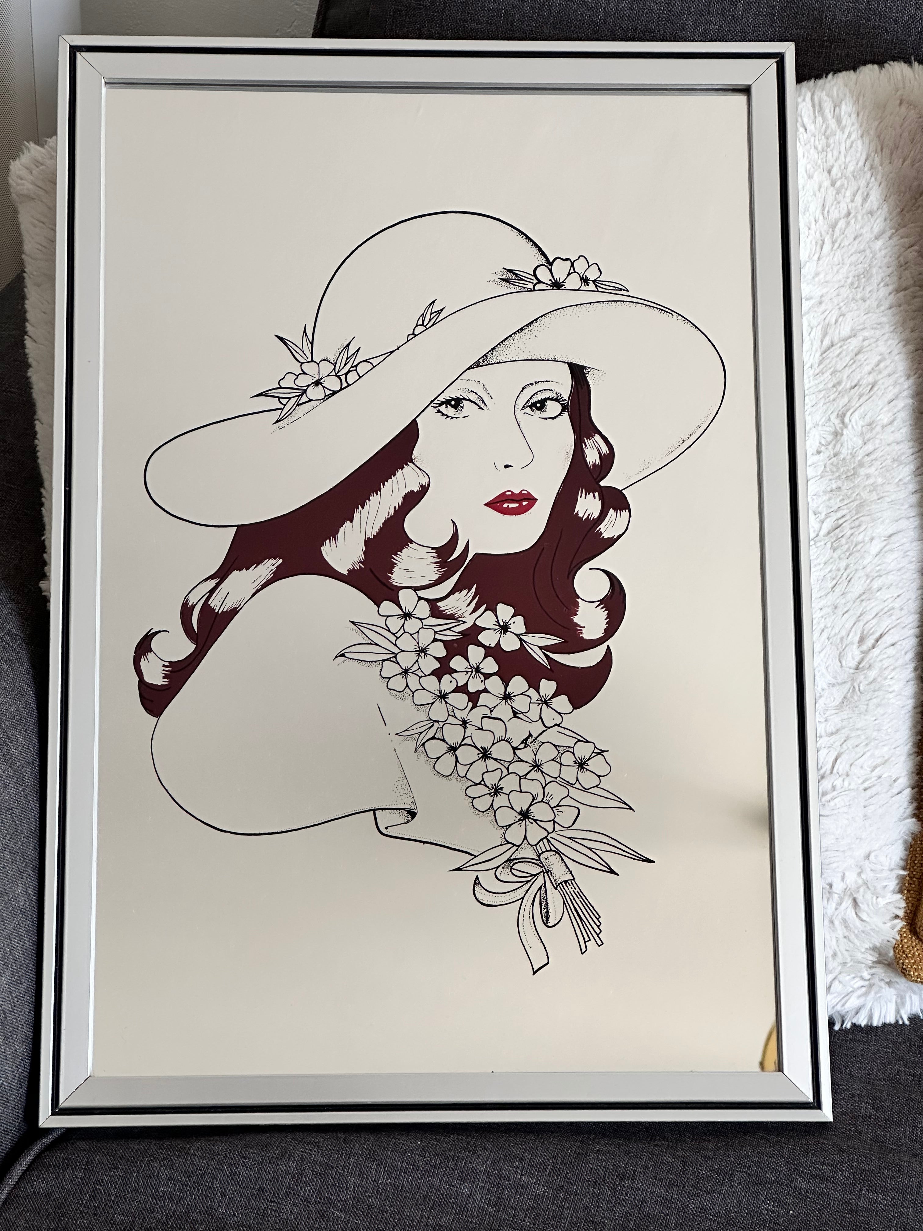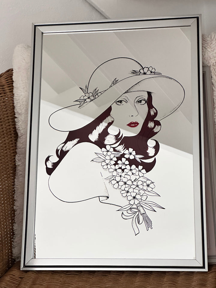 - Miroir typique des années 80, avec le dessin d'une femme de profil portant un chapeau, bordure du cadre en alu brossé