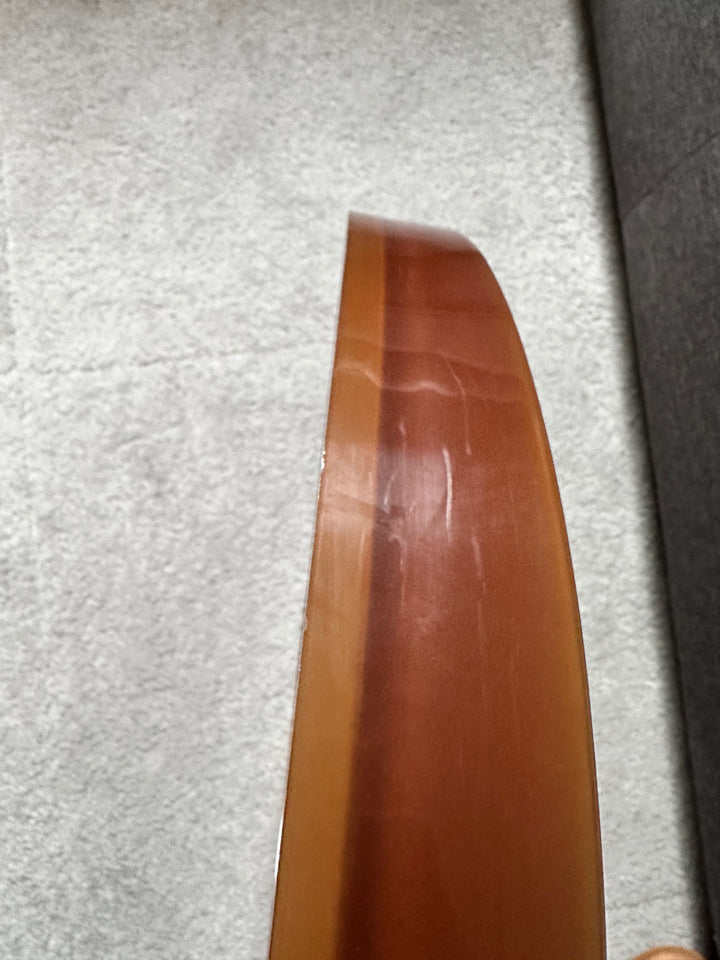 - En plastique de couleur ambre, une attache en fer se trouve au dos