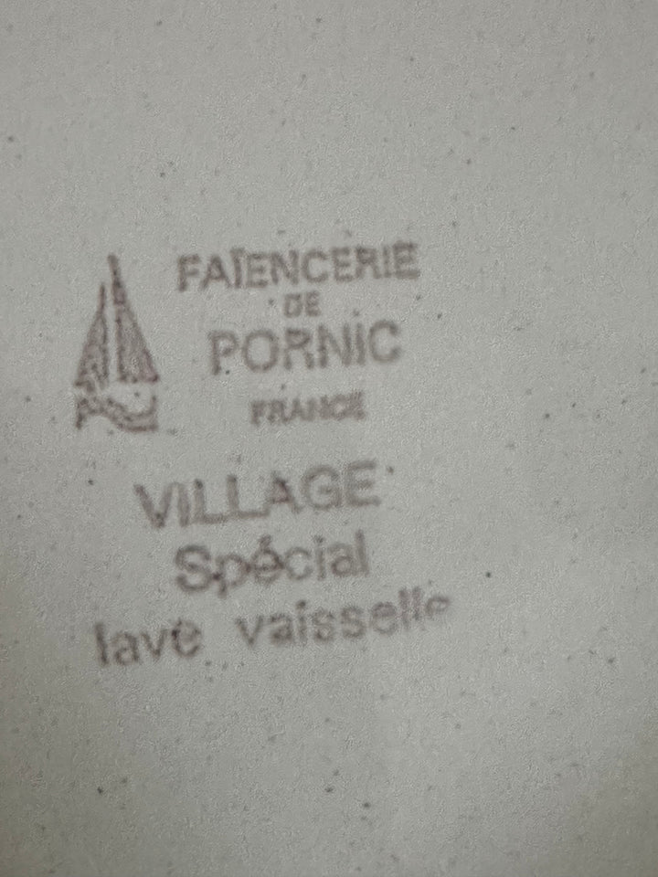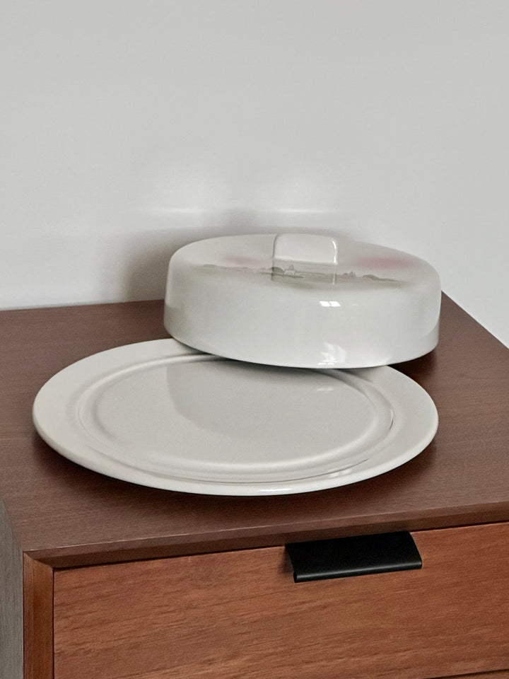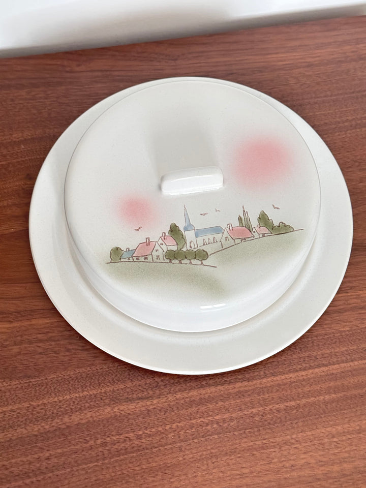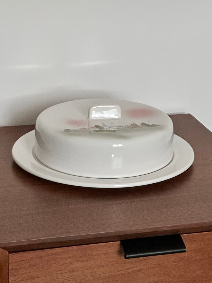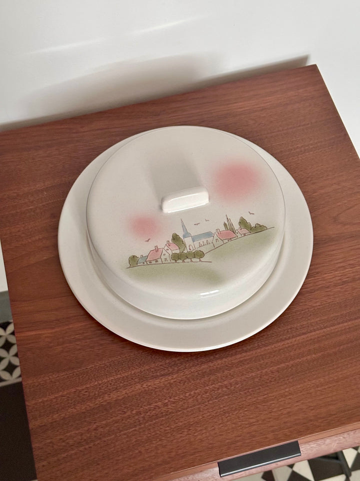 - Petit plat à fromage avec sa cloche au décor d'un village peint à la main