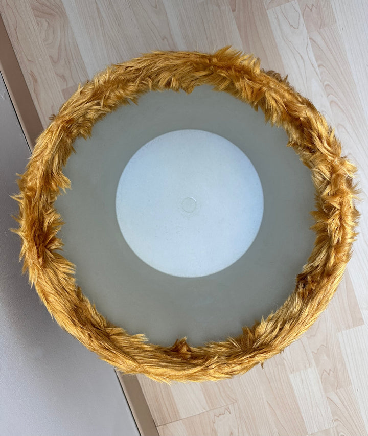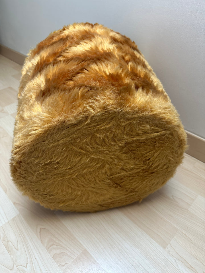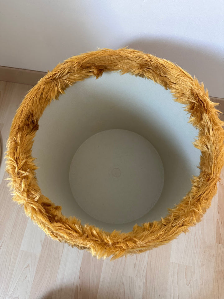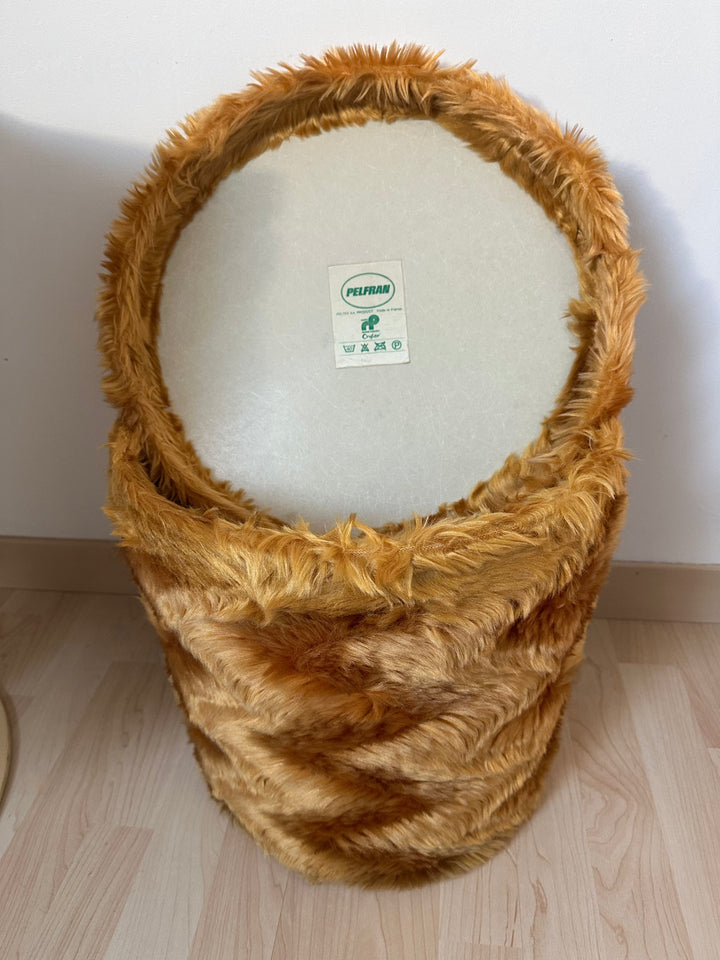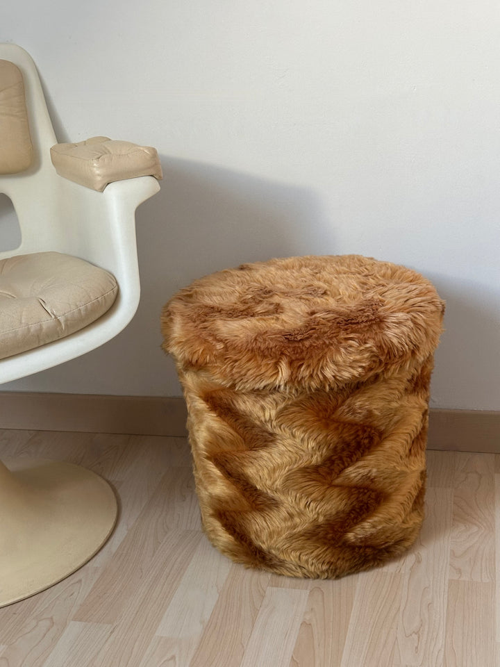- Pouf faisant coffre des années 70 de la marque Pelfran, en moumoute synthétique de couleur fauve, idéal pour mettre un peu de pep's dans sa déco