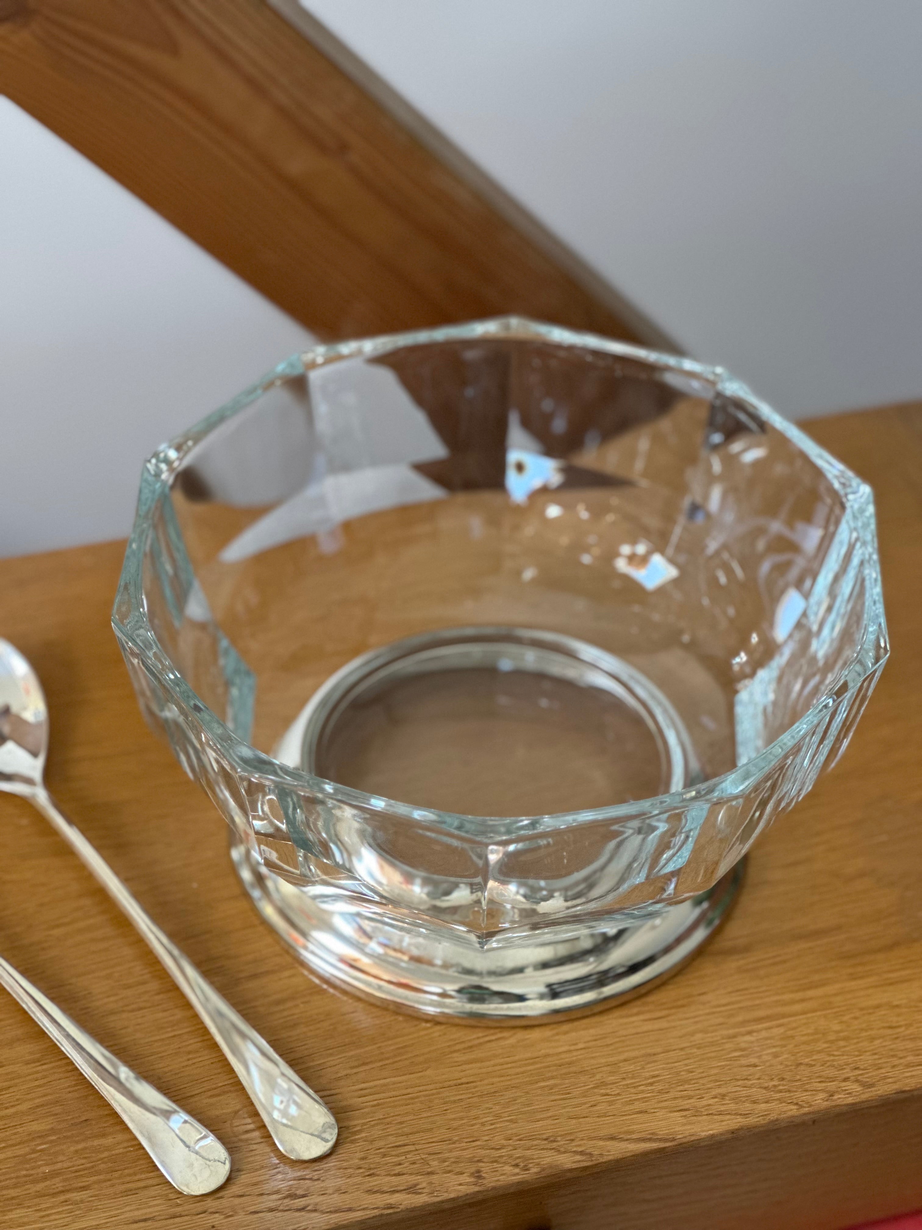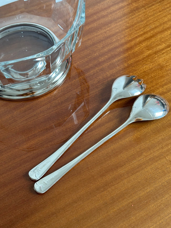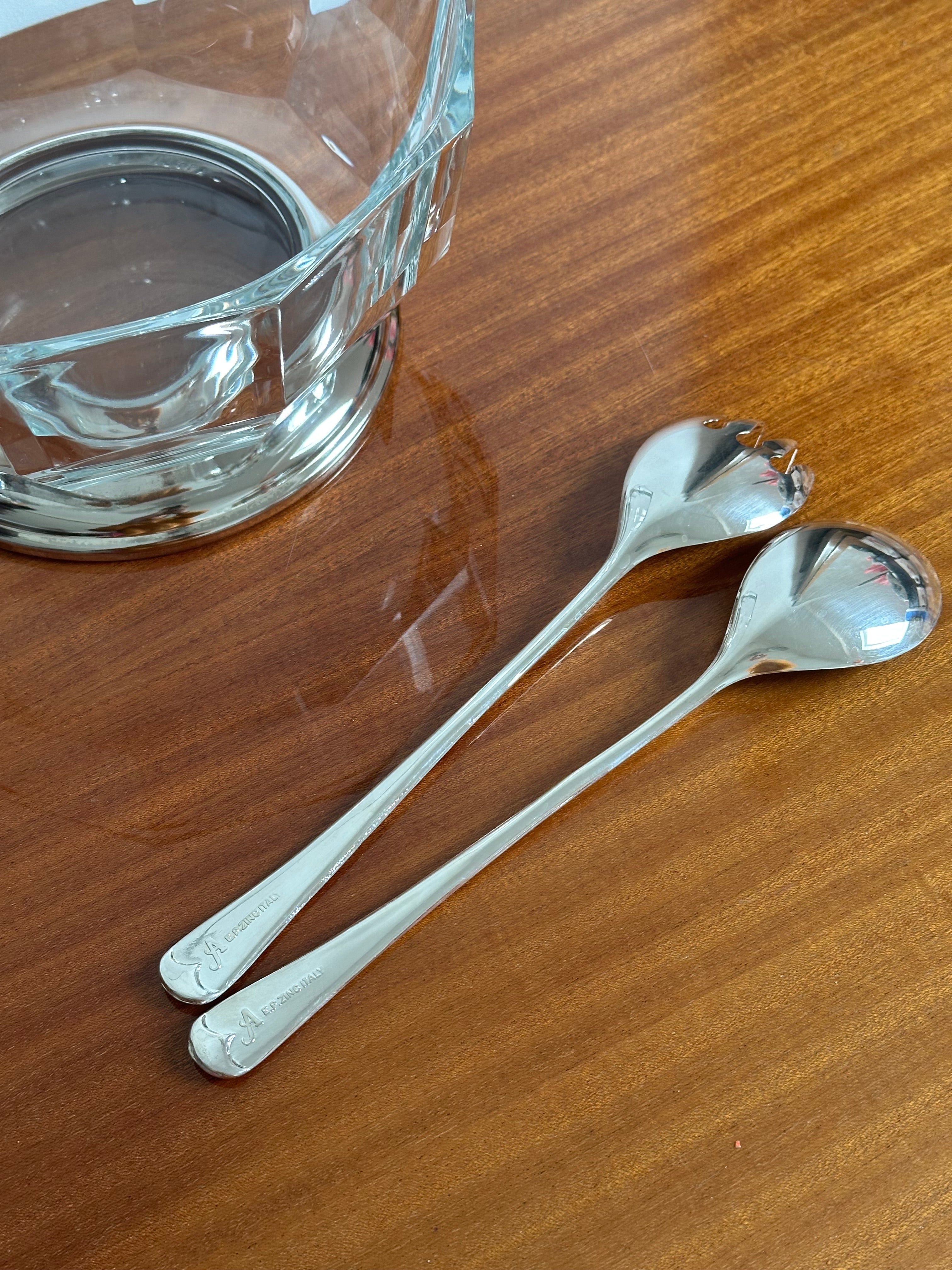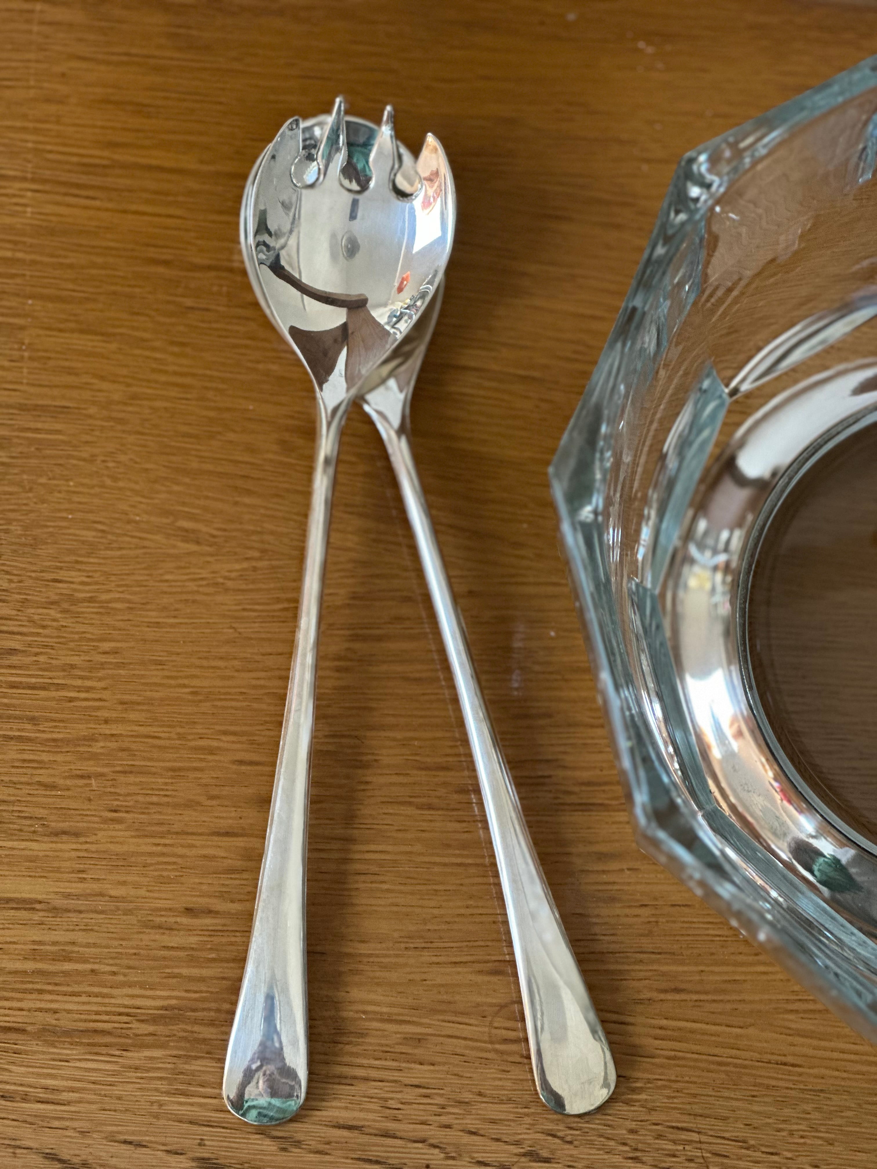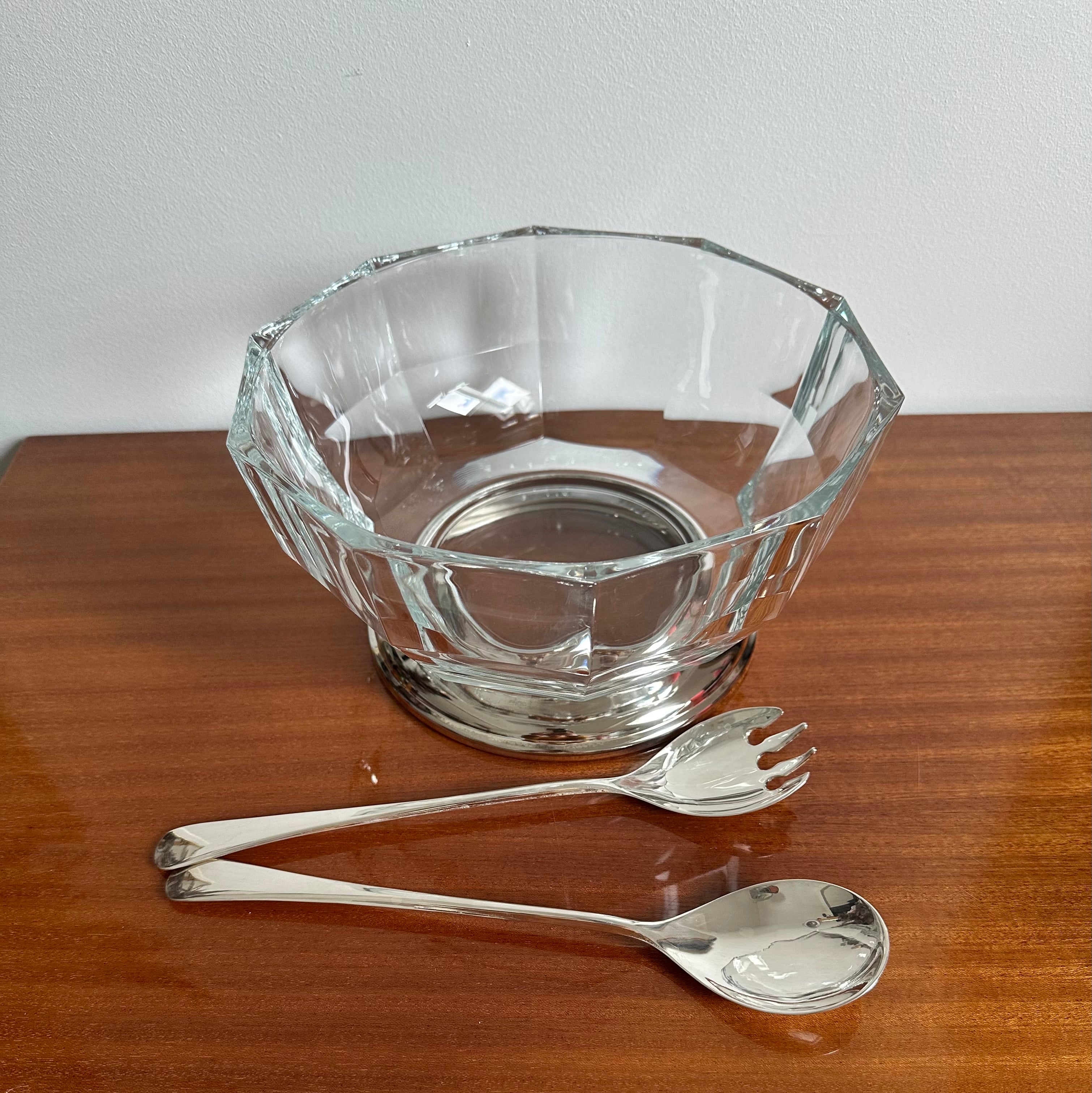 - Très beau saladier des années 80, en verre et métal argenté avec ses 2 couverts assortis, pour servir tout ce que vous souhaitez avec élégance