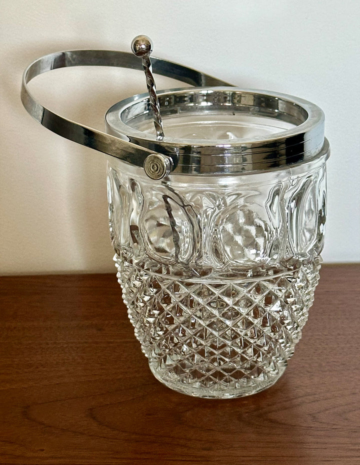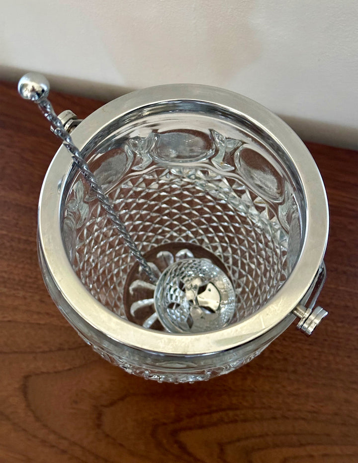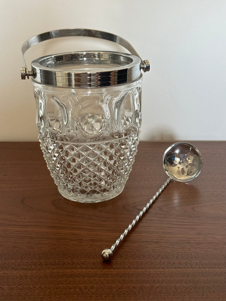 - Seau à glaçons des années 80, en verre ciselé et inox, avec sa cuillère en inox également, pour servir en toute élégance vos apéritifs