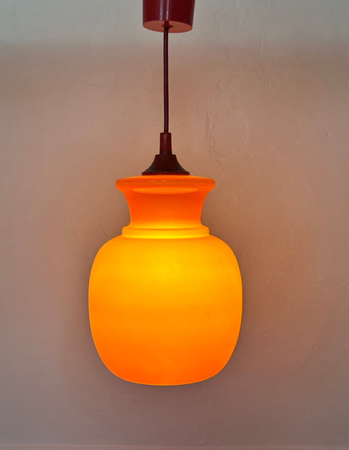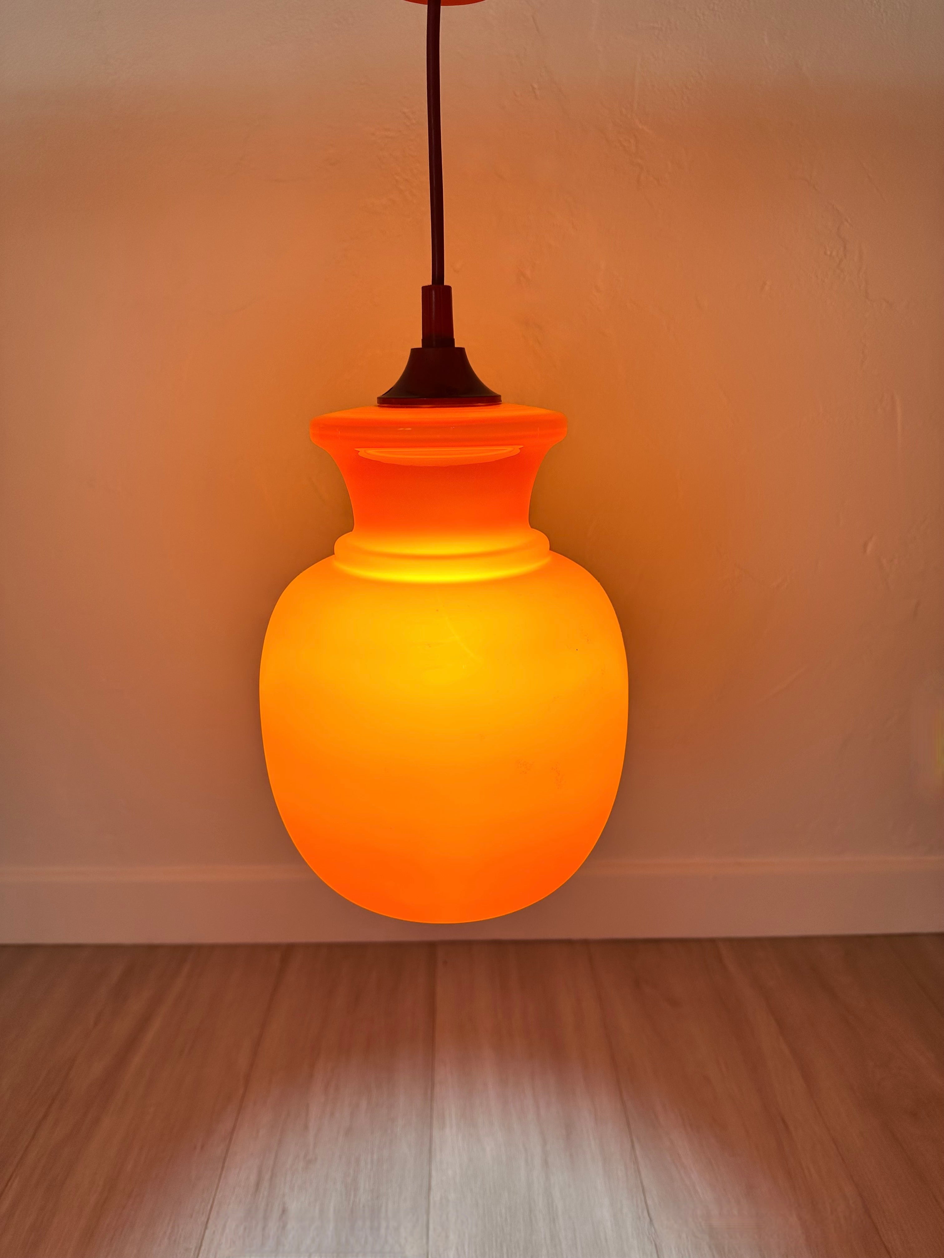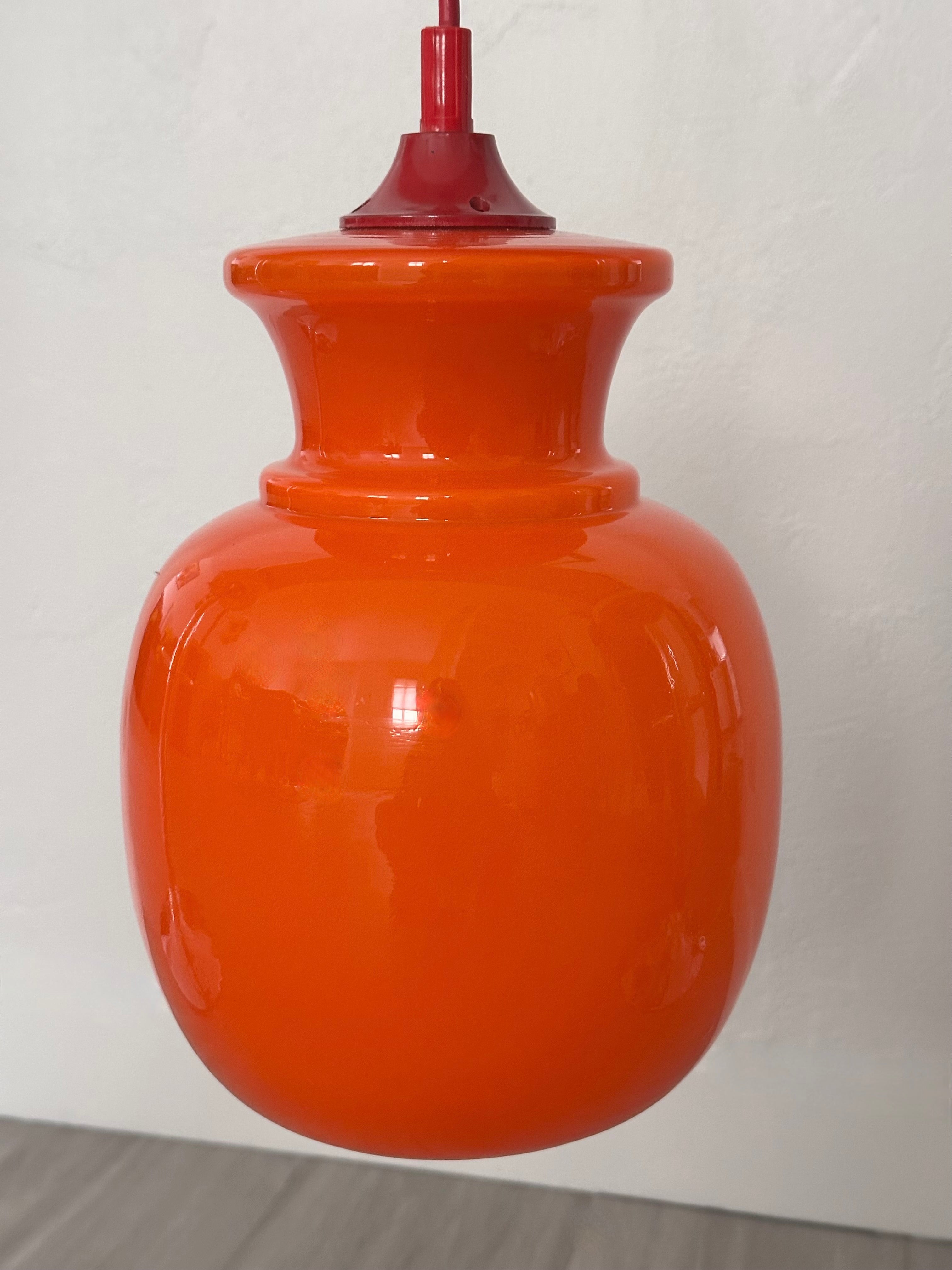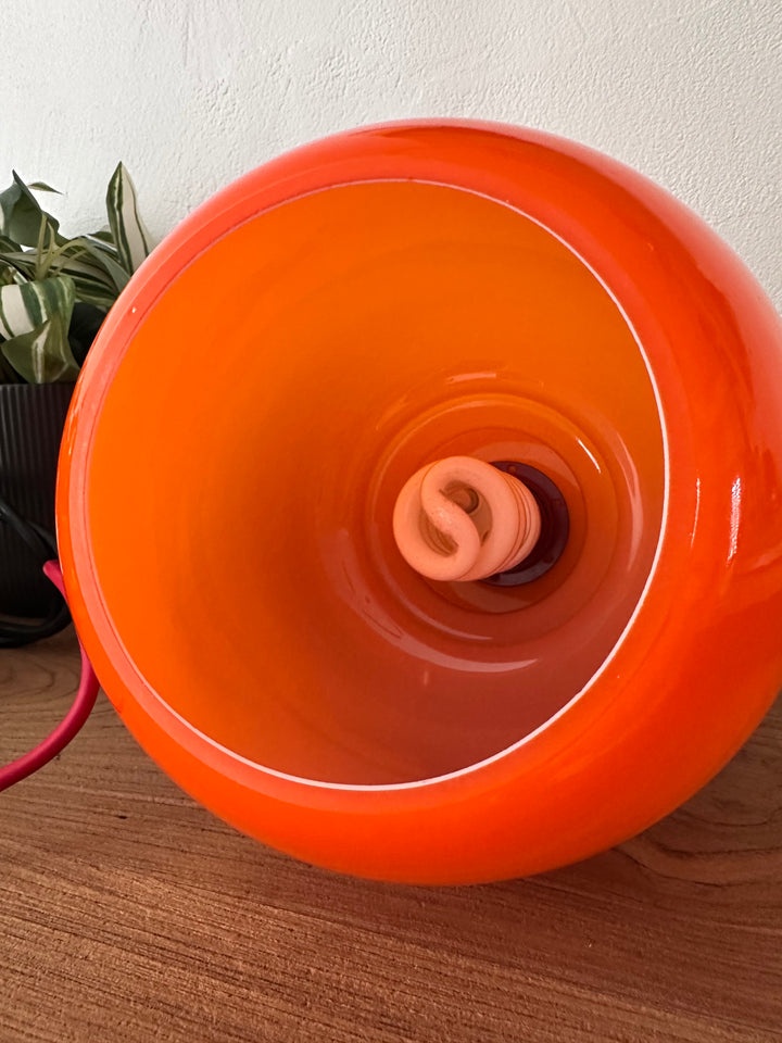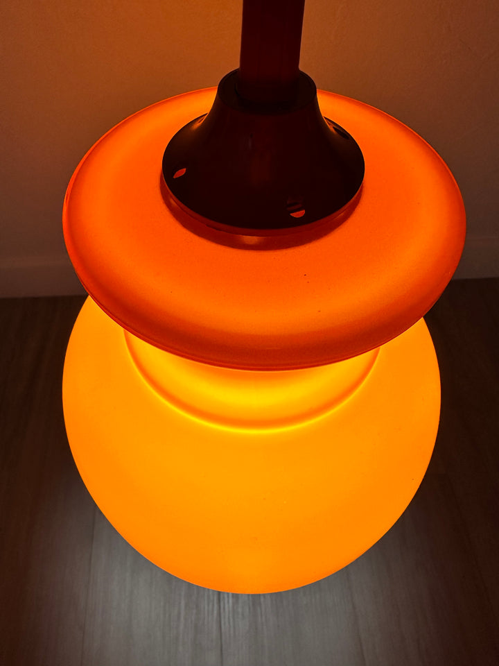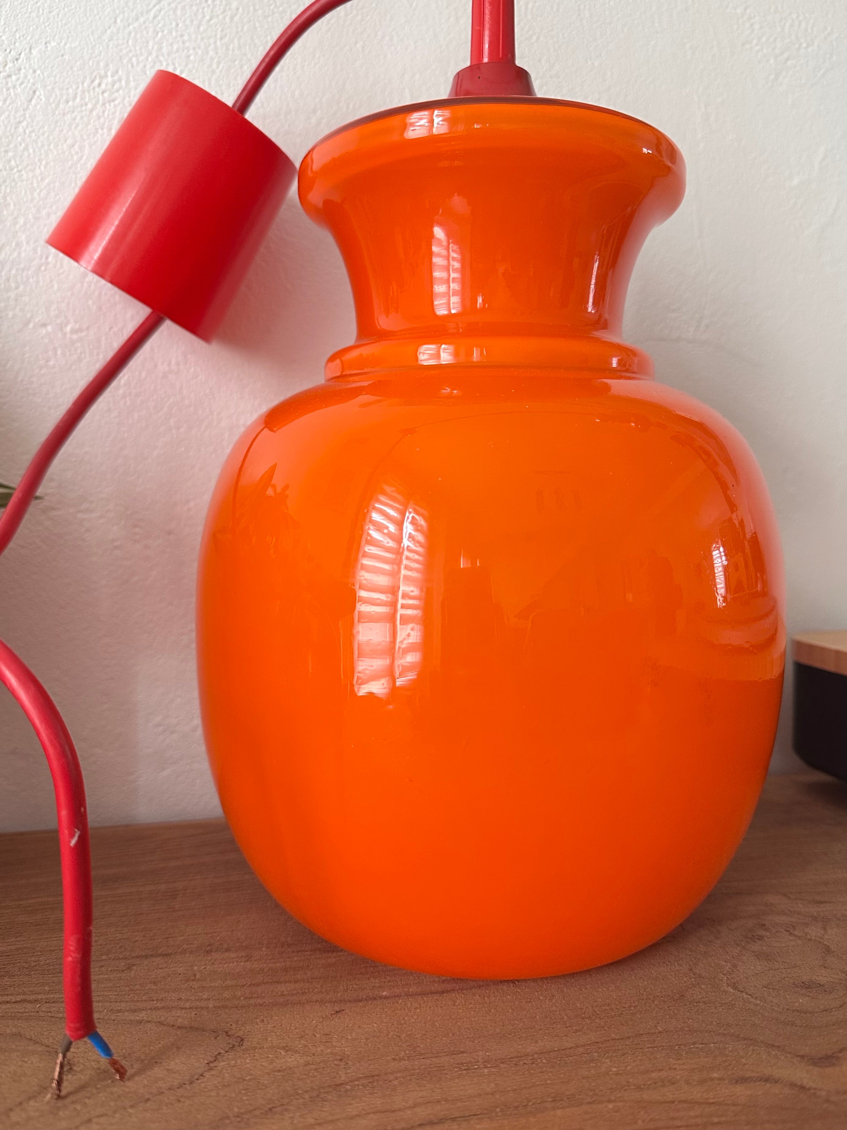 - Belle suspension en verre opalin orange des années 70, chinée lors d'une brocante, sa couleur se marie parfaitement avec le fil rouge, ce qui fait son originalité et le coup de coeur fut immédiat