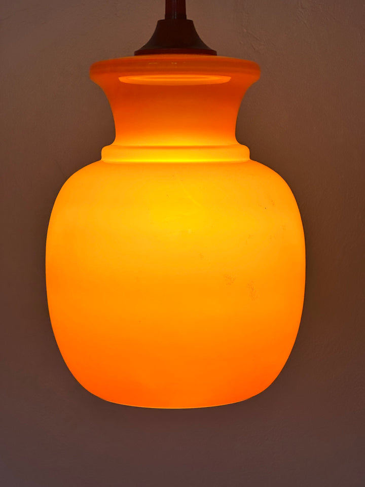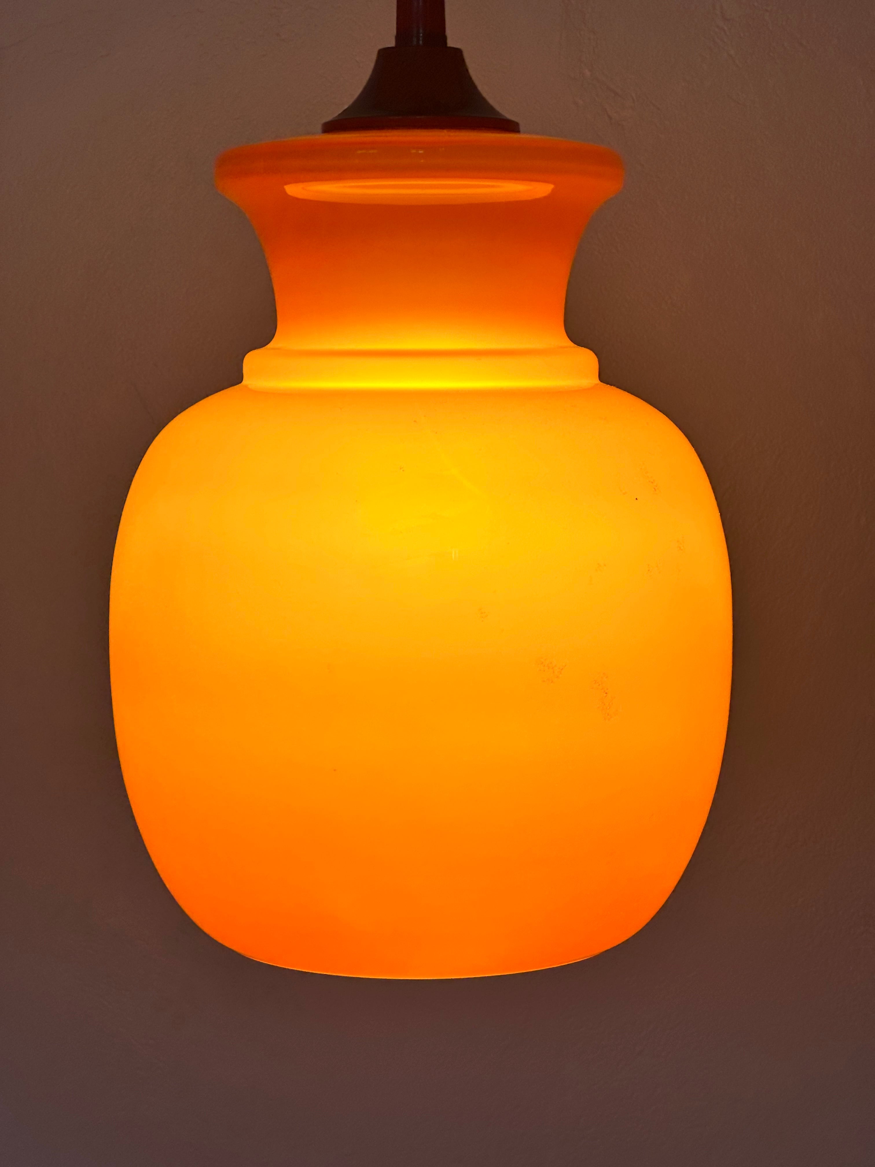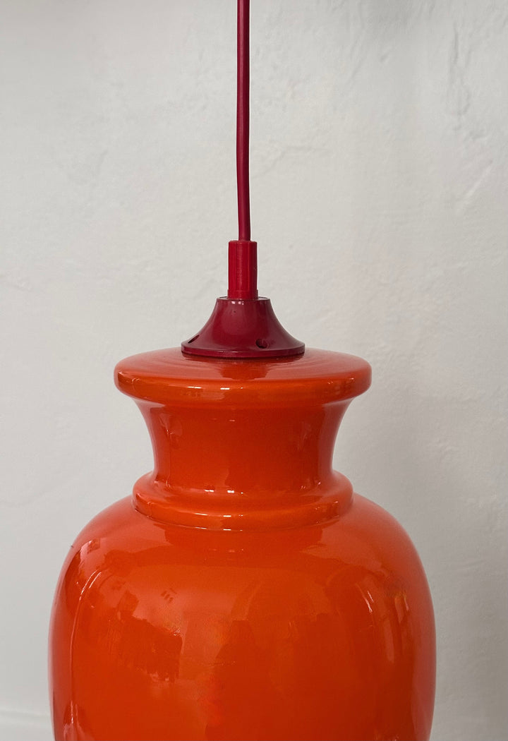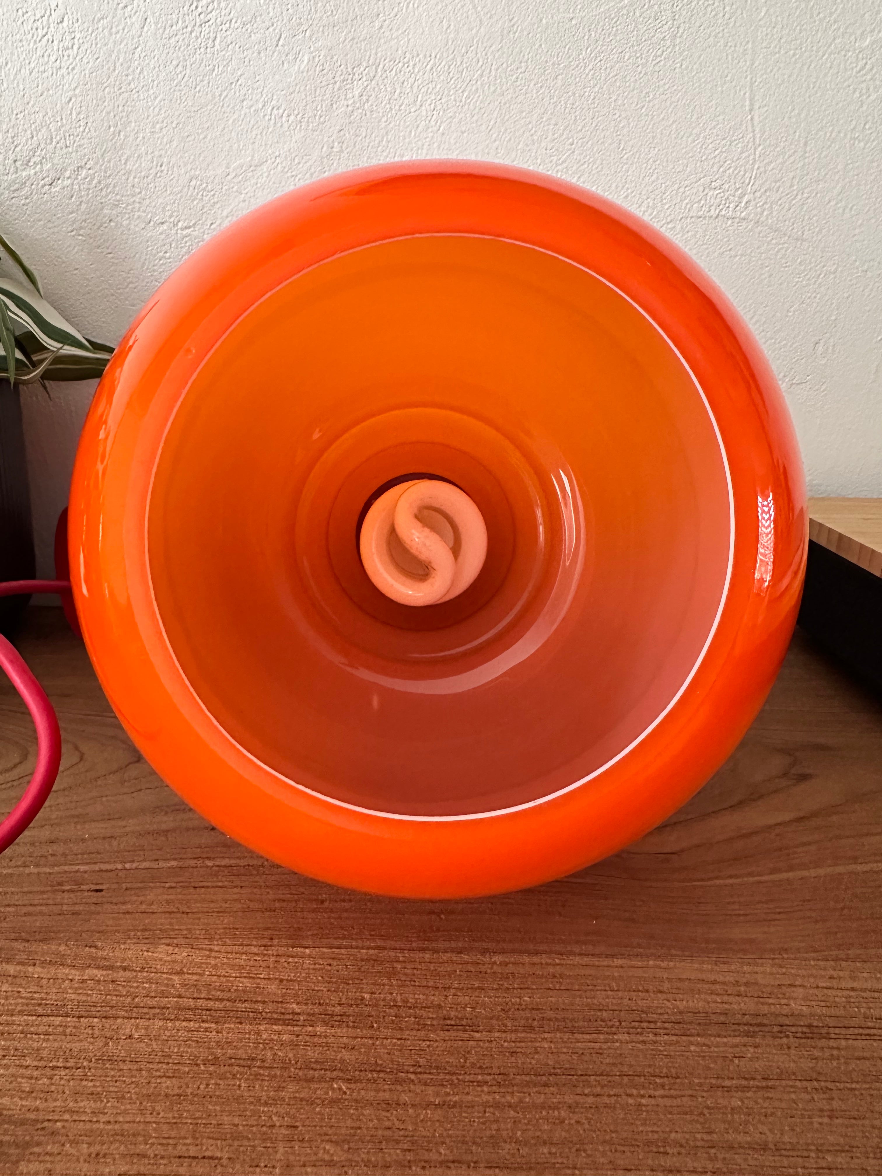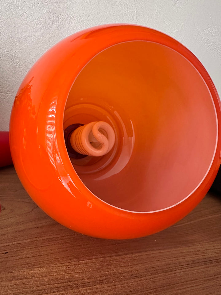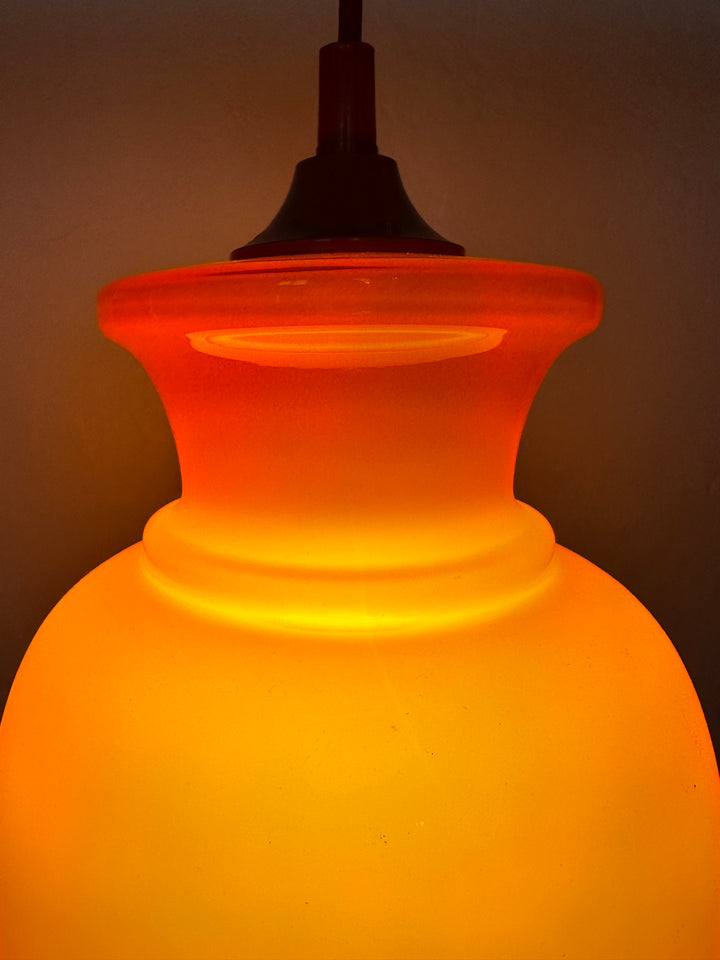 - Belle suspension en verre opalin orange des années 70, chinée lors d'une brocante, sa couleur se marie parfaitement avec le fil rouge, ce qui fait son originalité et le coup de coeur fut immédiat