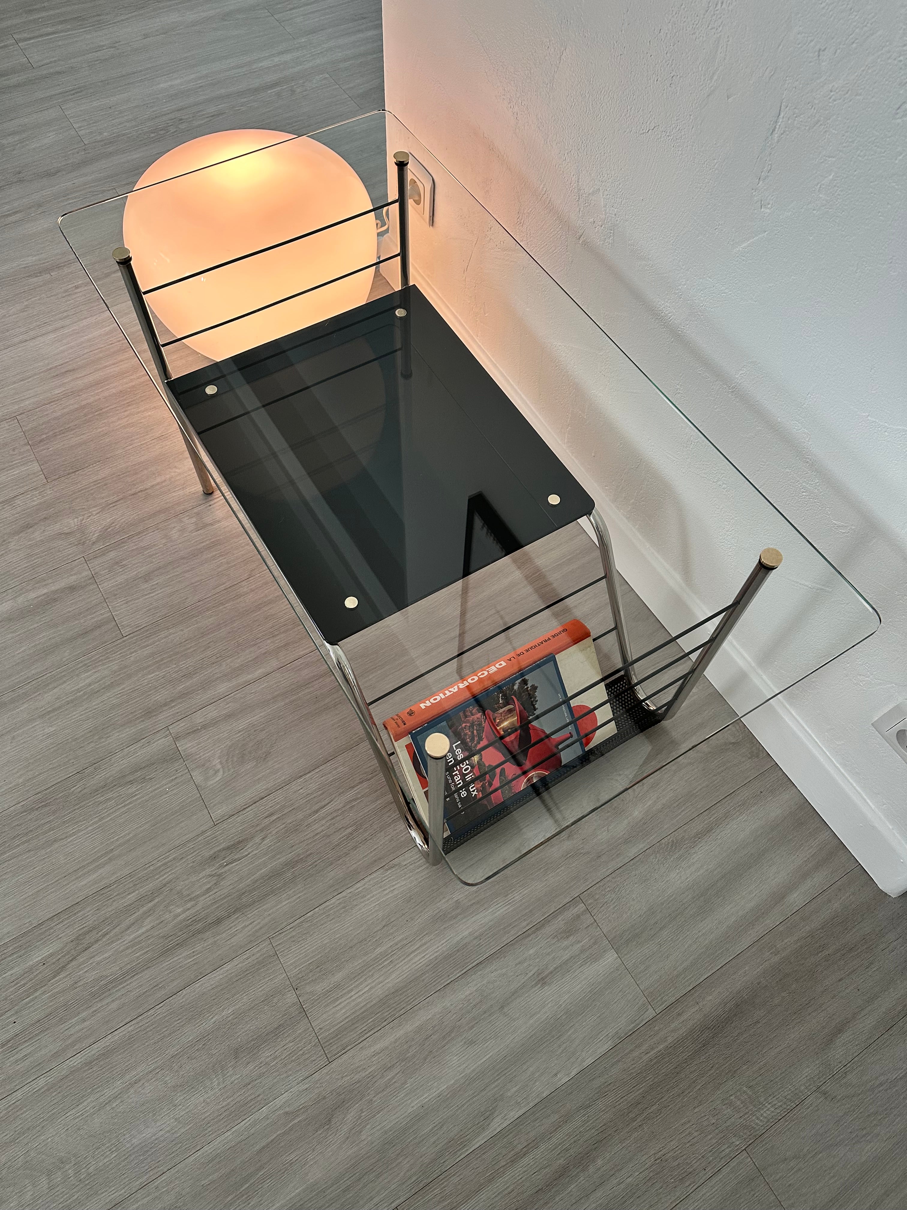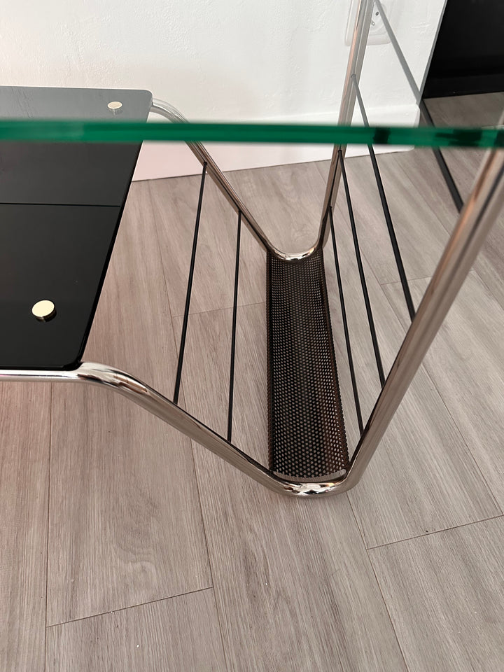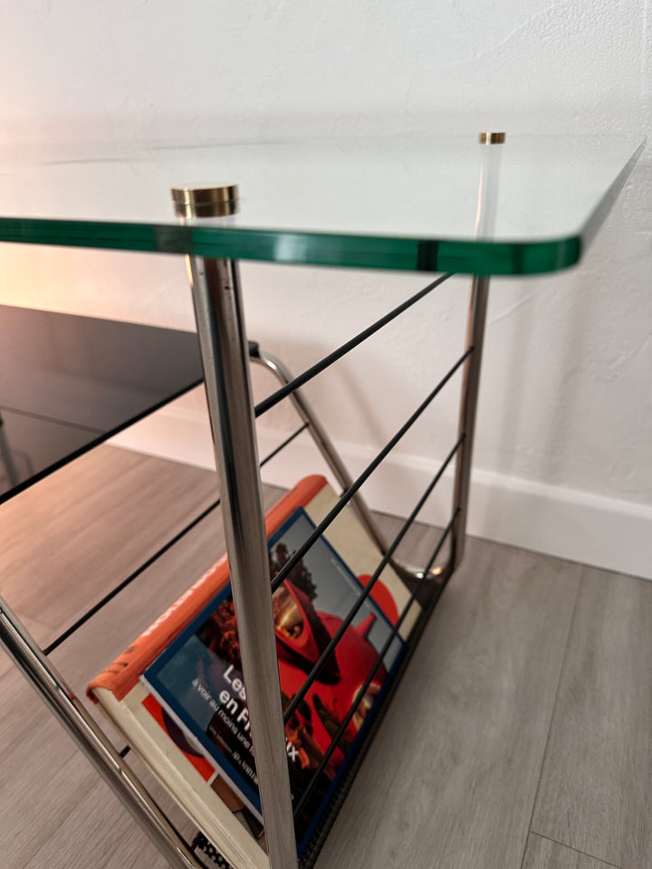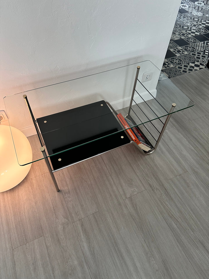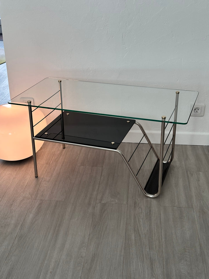 - Les 2 plateaux sont en verre épais, l'un est translucide l'autre est noir, les pieds en laiton mordoré, un des côté fait office de porte-revues ce qui rend cette table originale