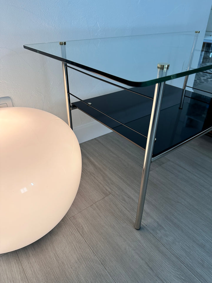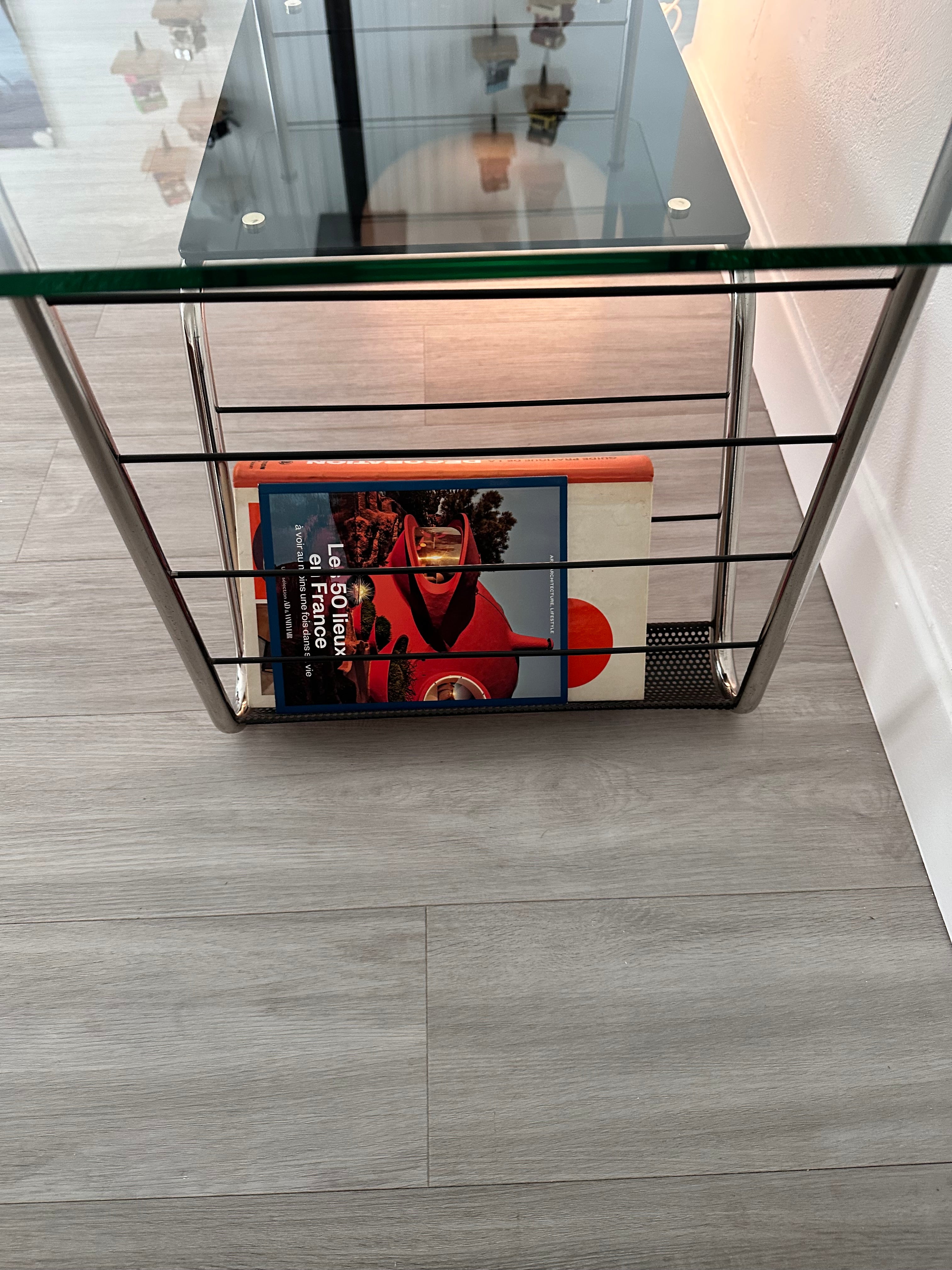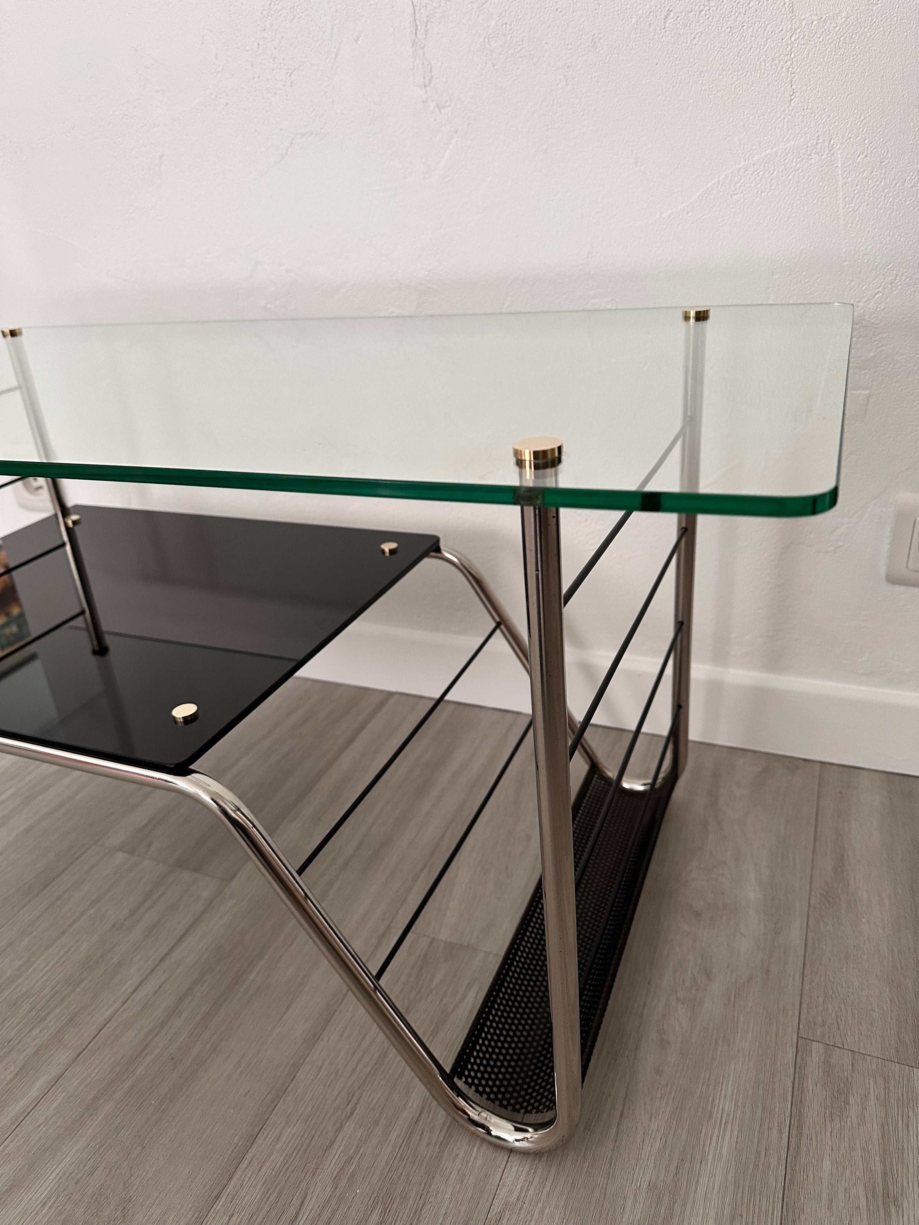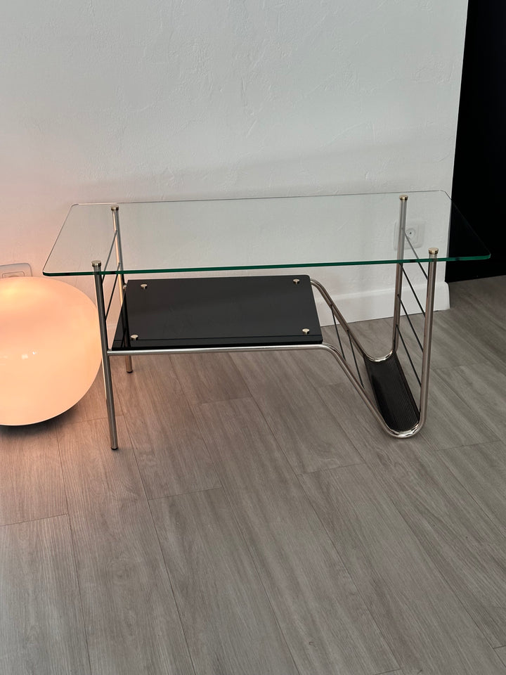 - Les 2 plateaux sont en verre épais, l'un est translucide l'autre est noir, les pieds en laiton mordoré, un des côté fait office de porte-revues ce qui rend cette table originale