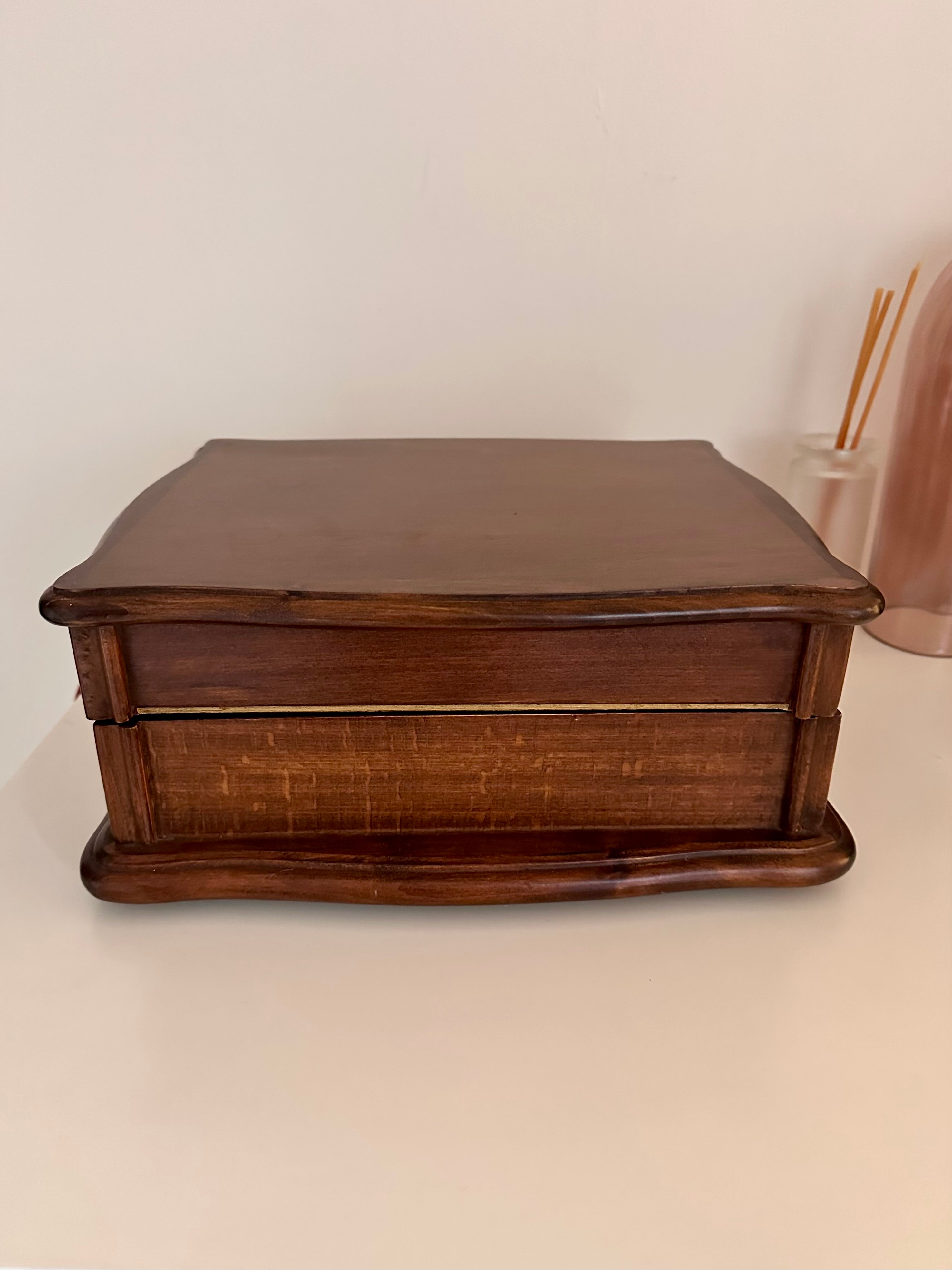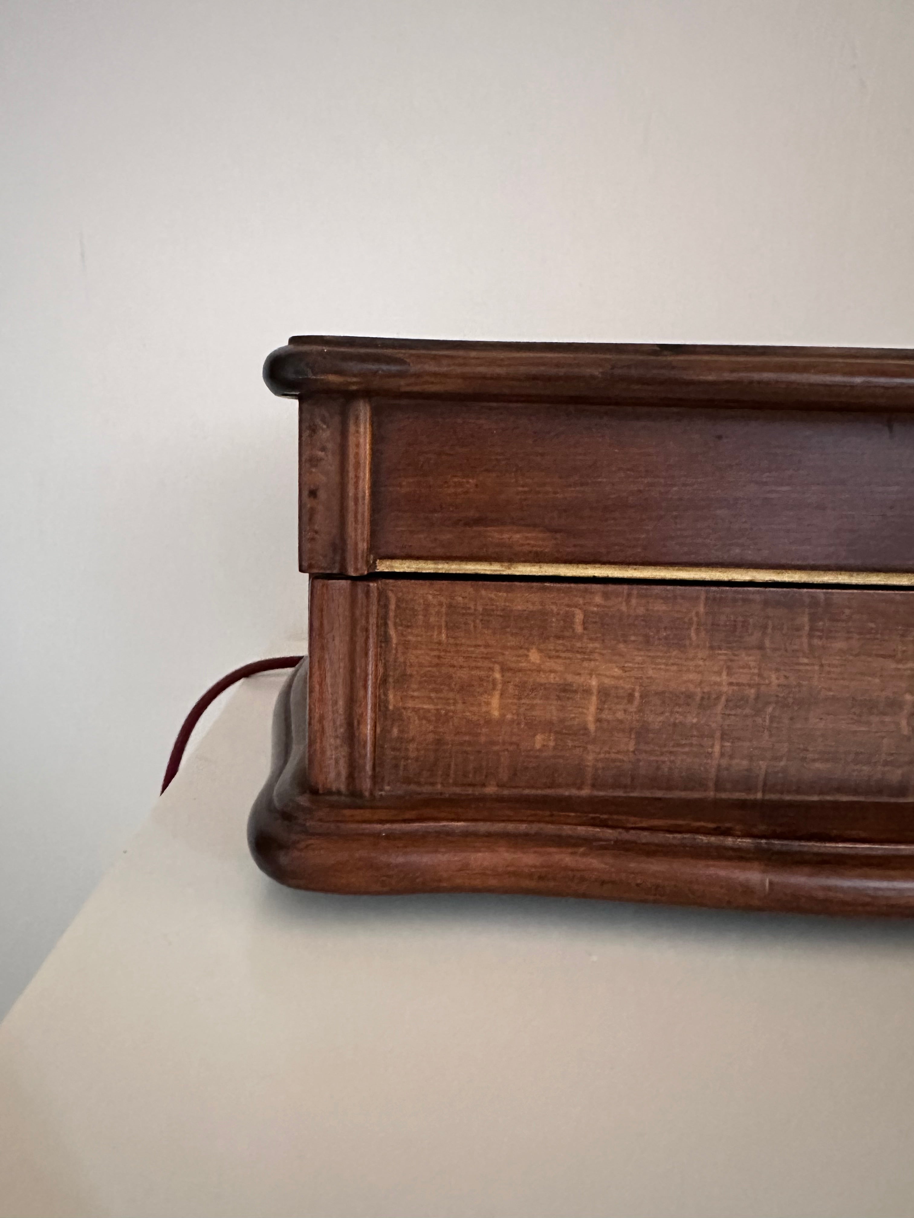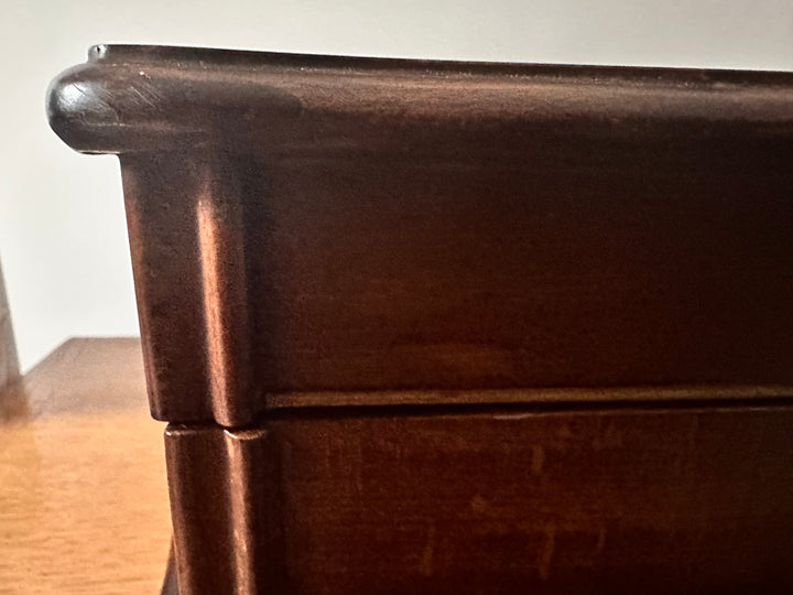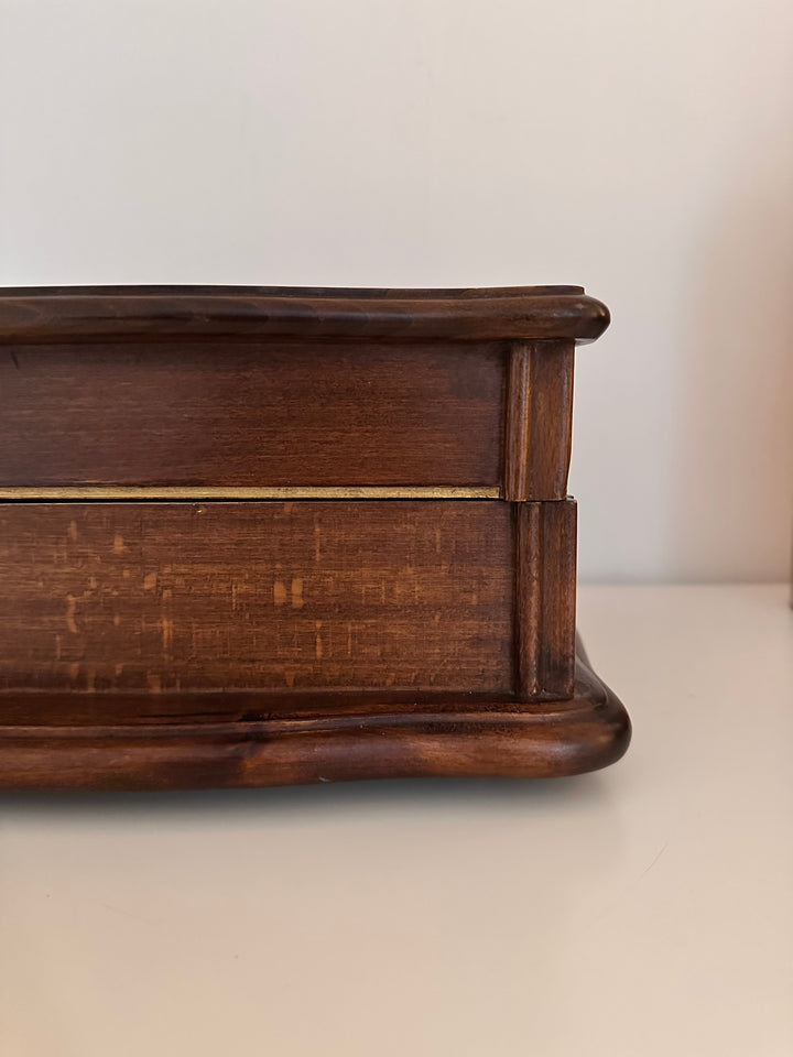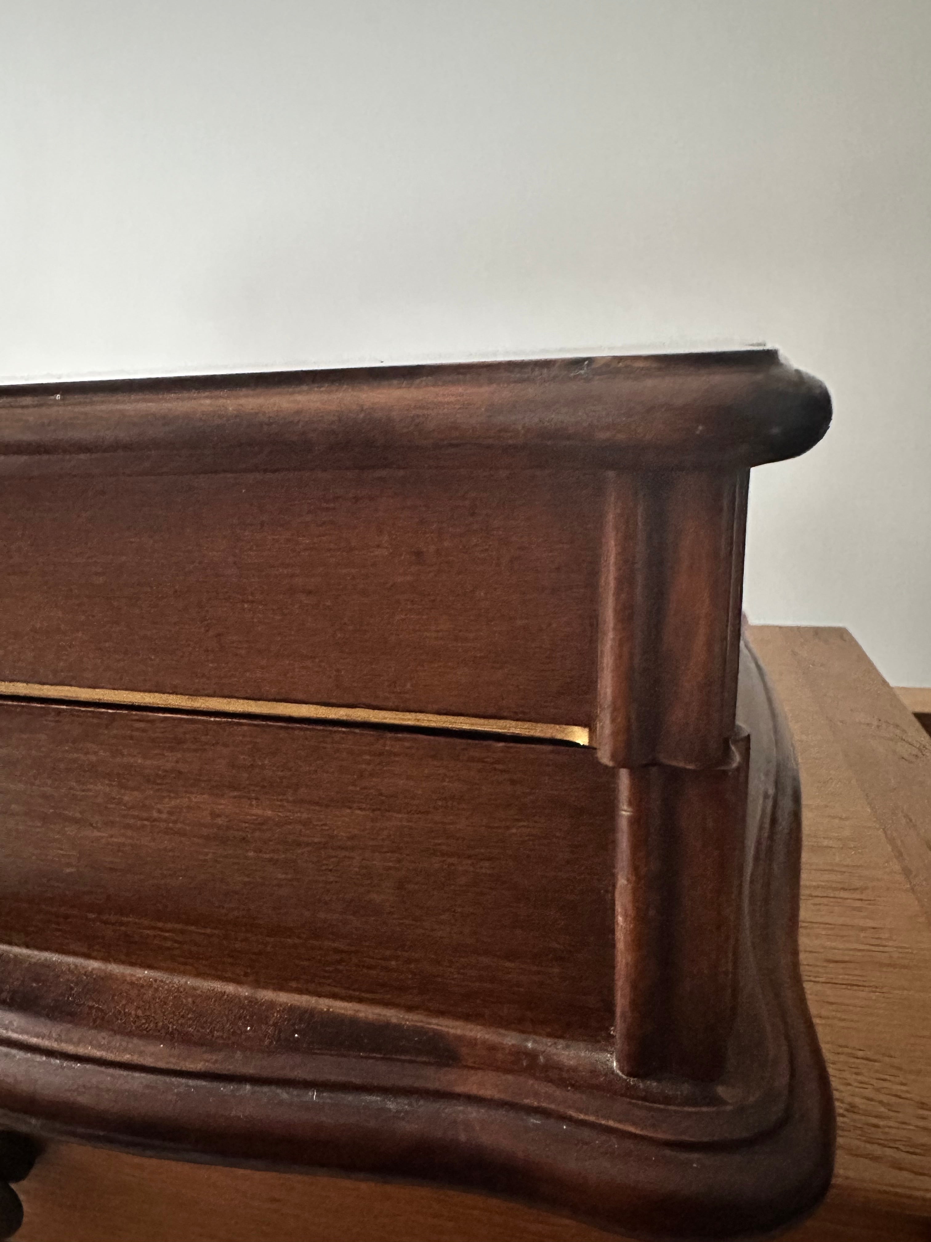 - En bon état général, avec ses marques du temps, le coffret montre un léger décalage à l'arrière lorsqu'il est fermé, visible sur les dernières photos, veillez à bien en tenir compte