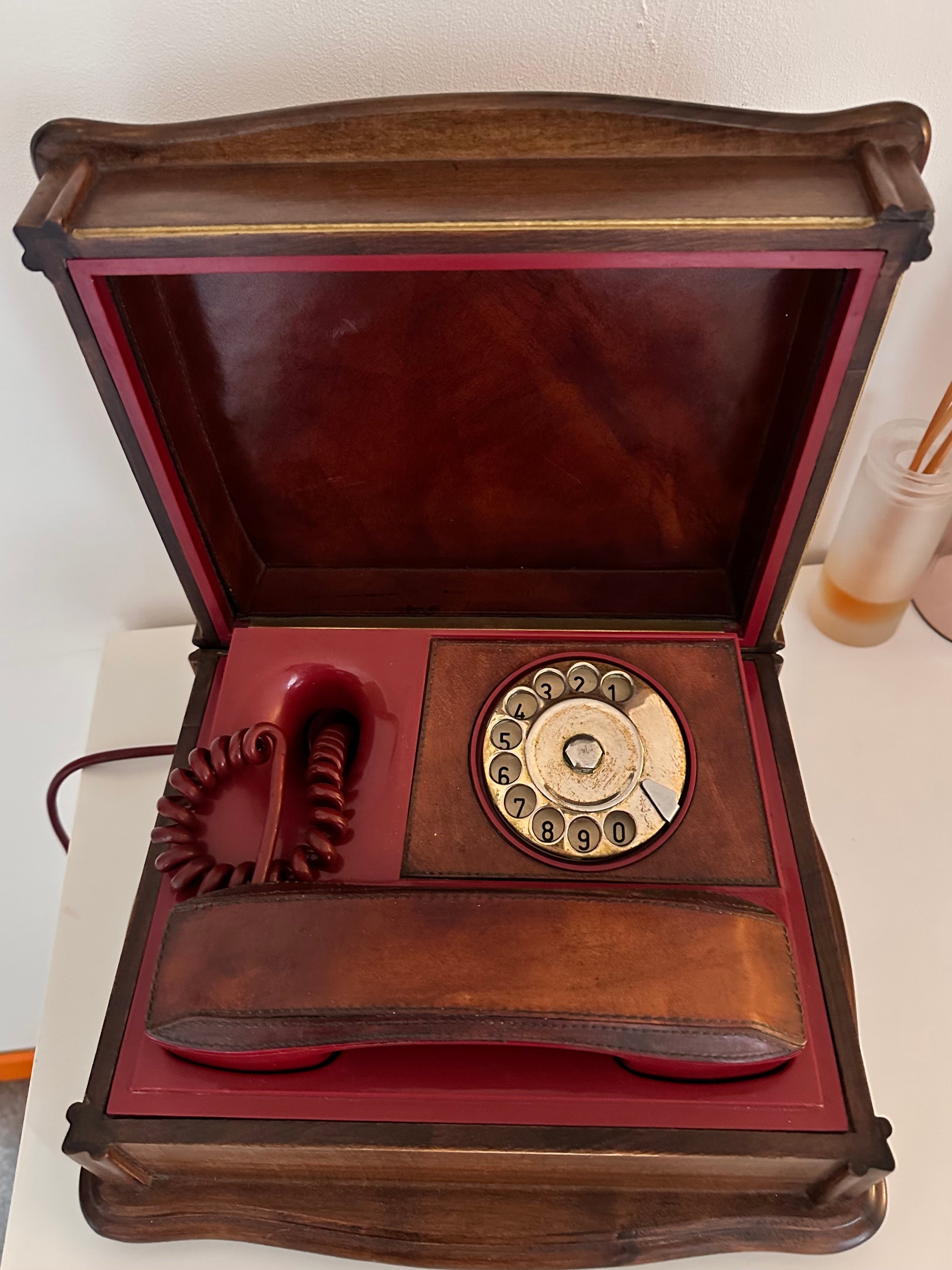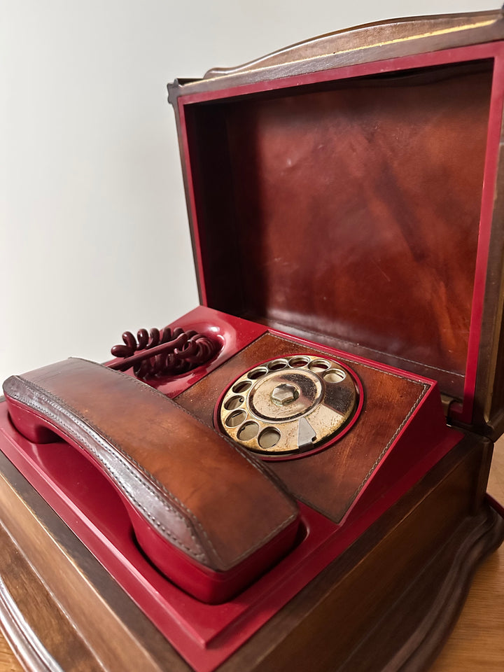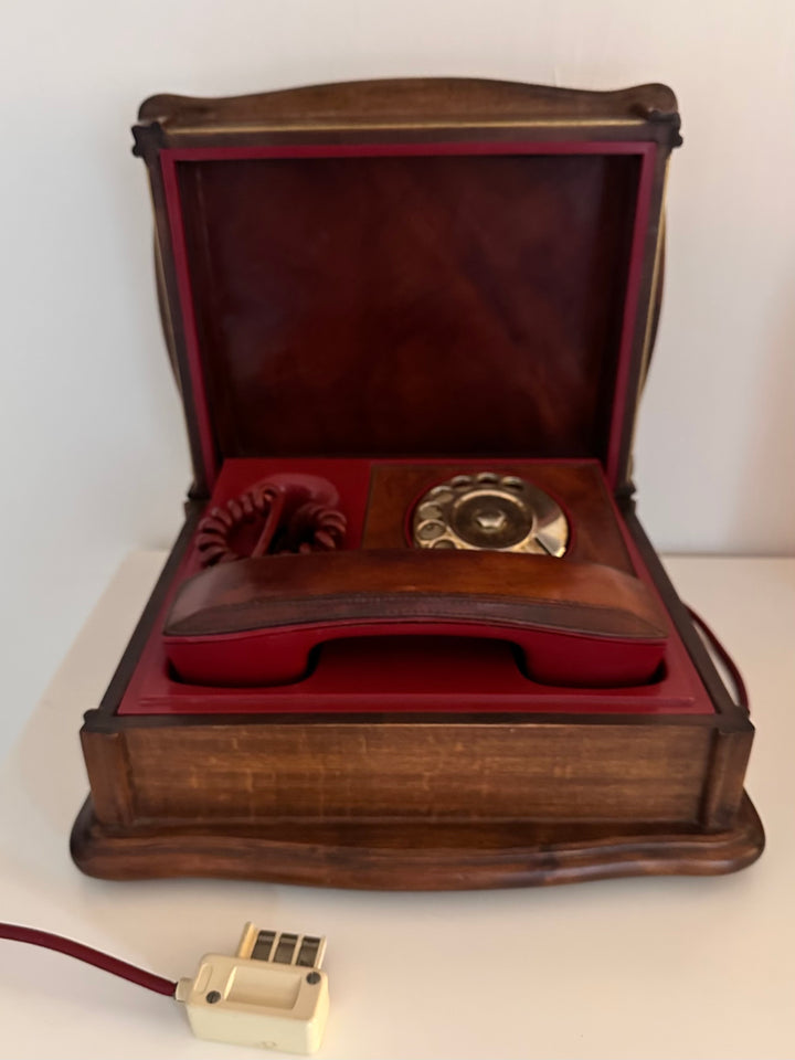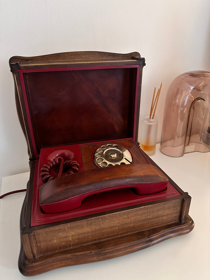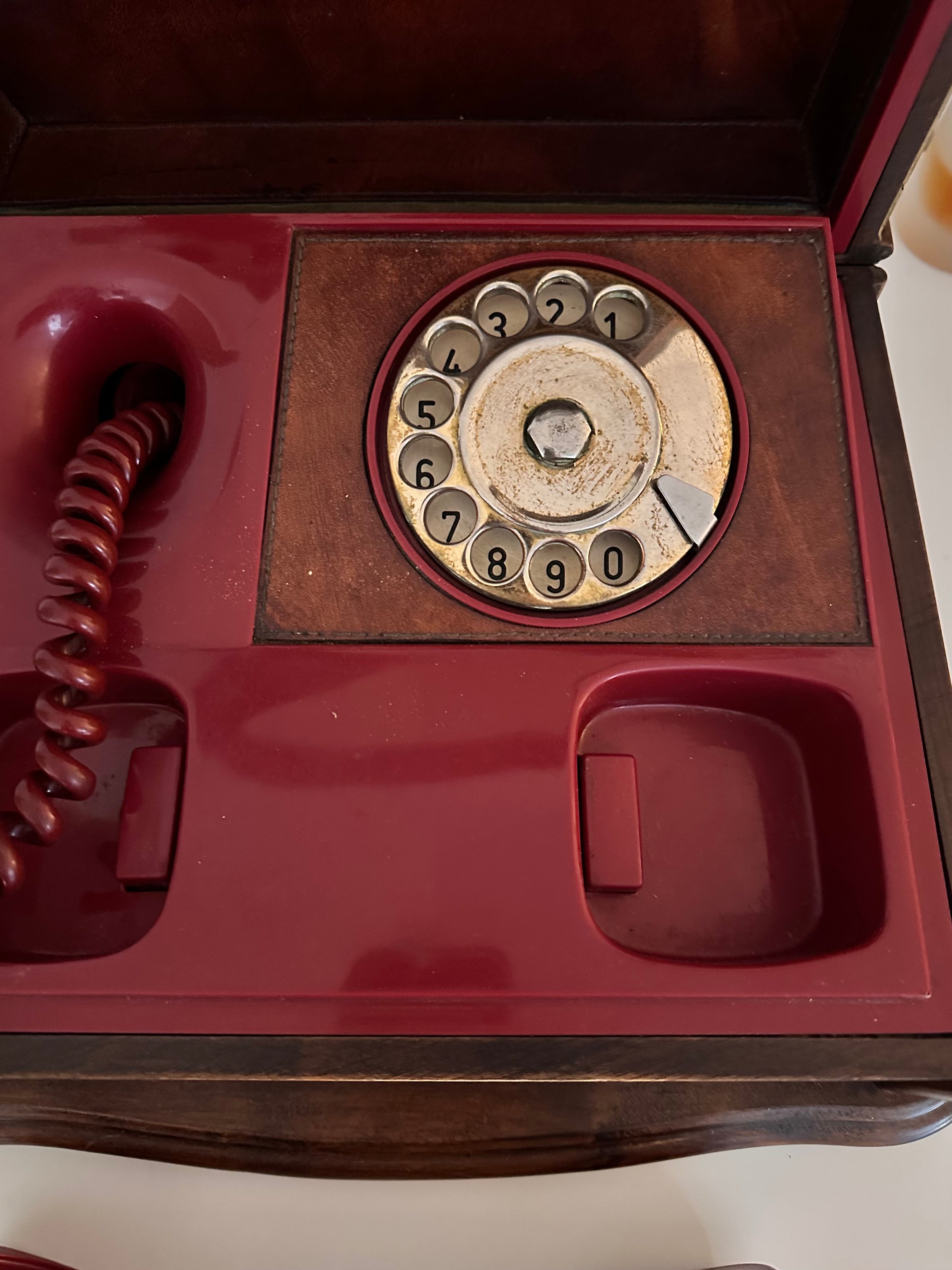 - Coup de coeur pour ce téléphone Italien des années 70, dans un coffret en bois marron foncé, l'intérieur en Bakélite bordeaux, le dessus du combiné ainsi que le contour du cadran de numérotation sont gainés de cuir marron