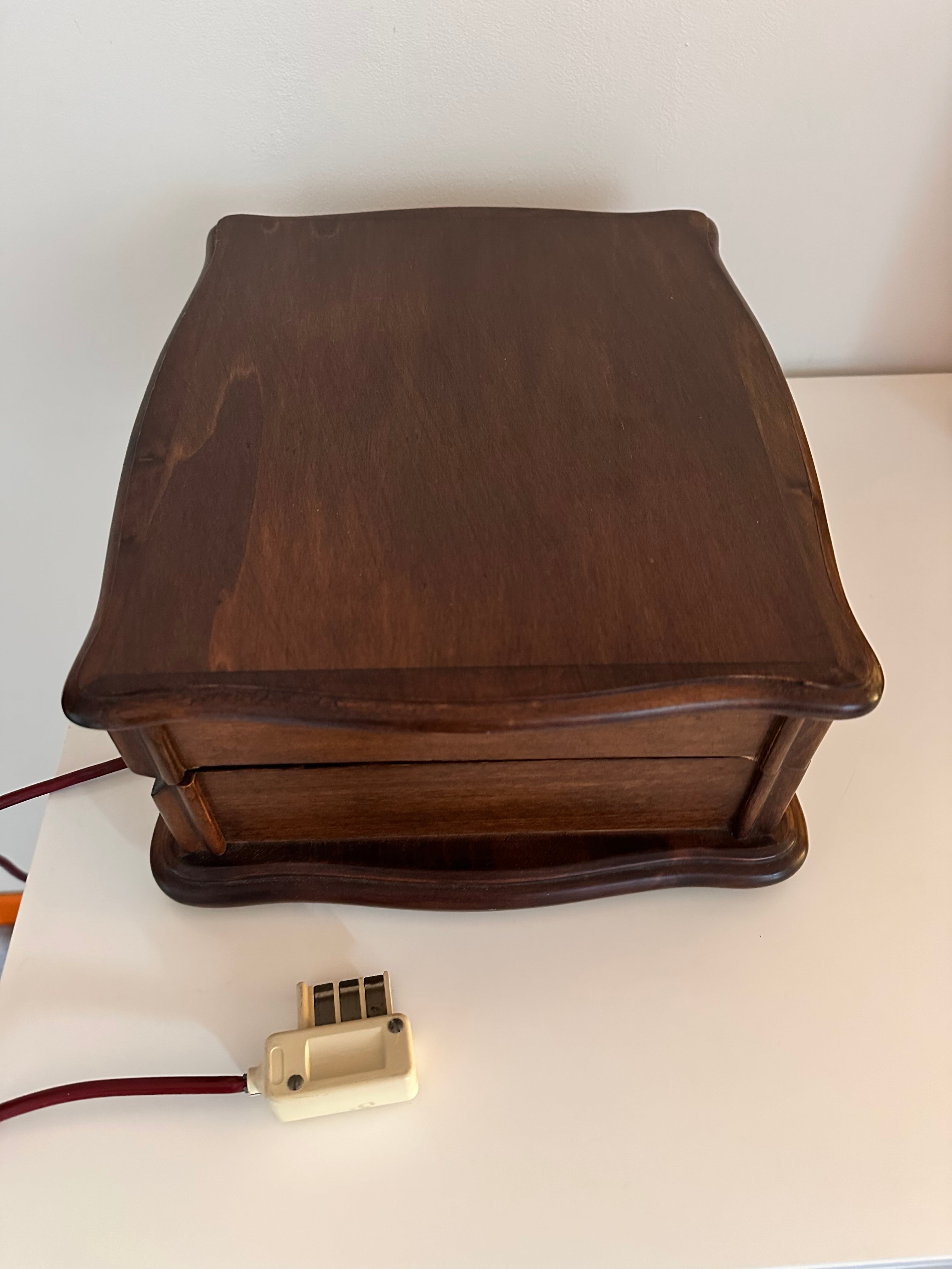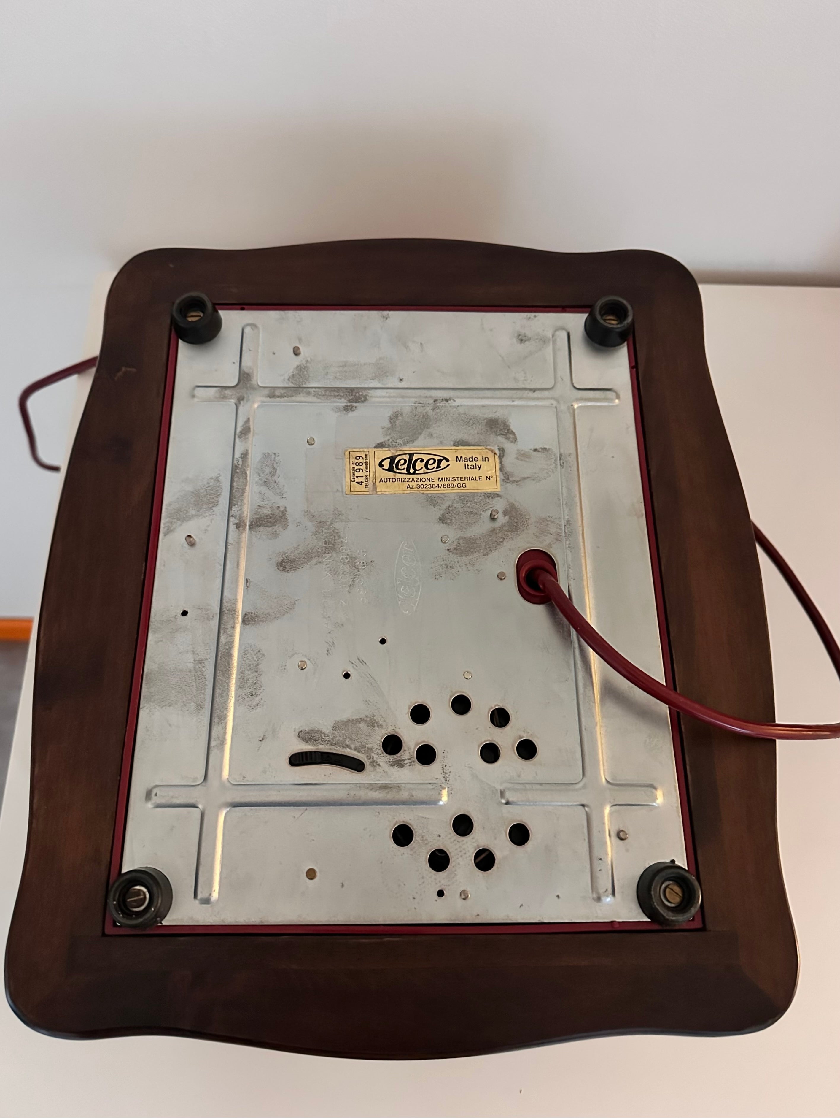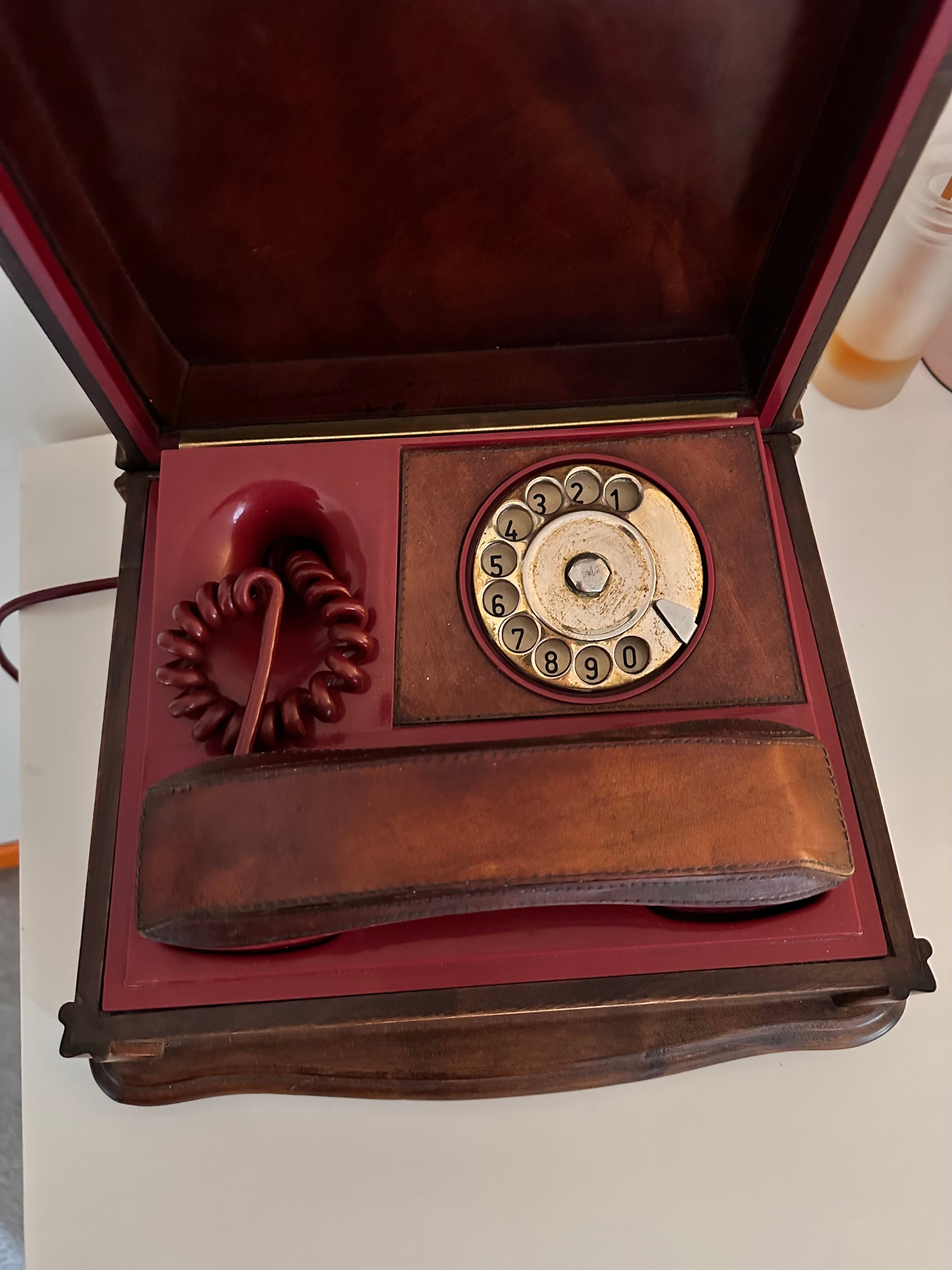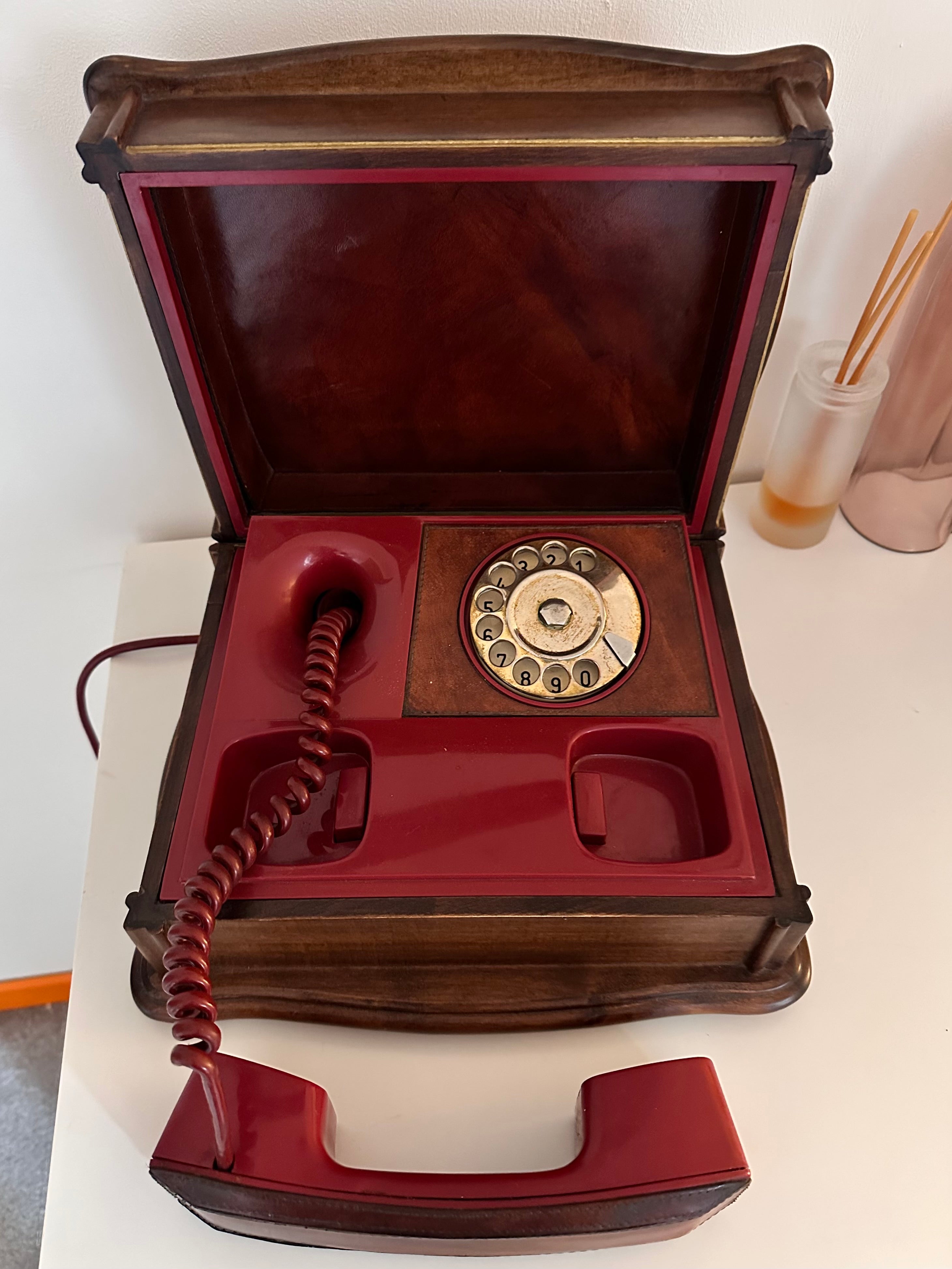 - Coup de coeur pour ce téléphone Italien des années 70, dans un coffret en bois marron foncé, l'intérieur en Bakélite bordeaux, le dessus du combiné ainsi que le contour du cadran de numérotation sont gainés de cuir marron