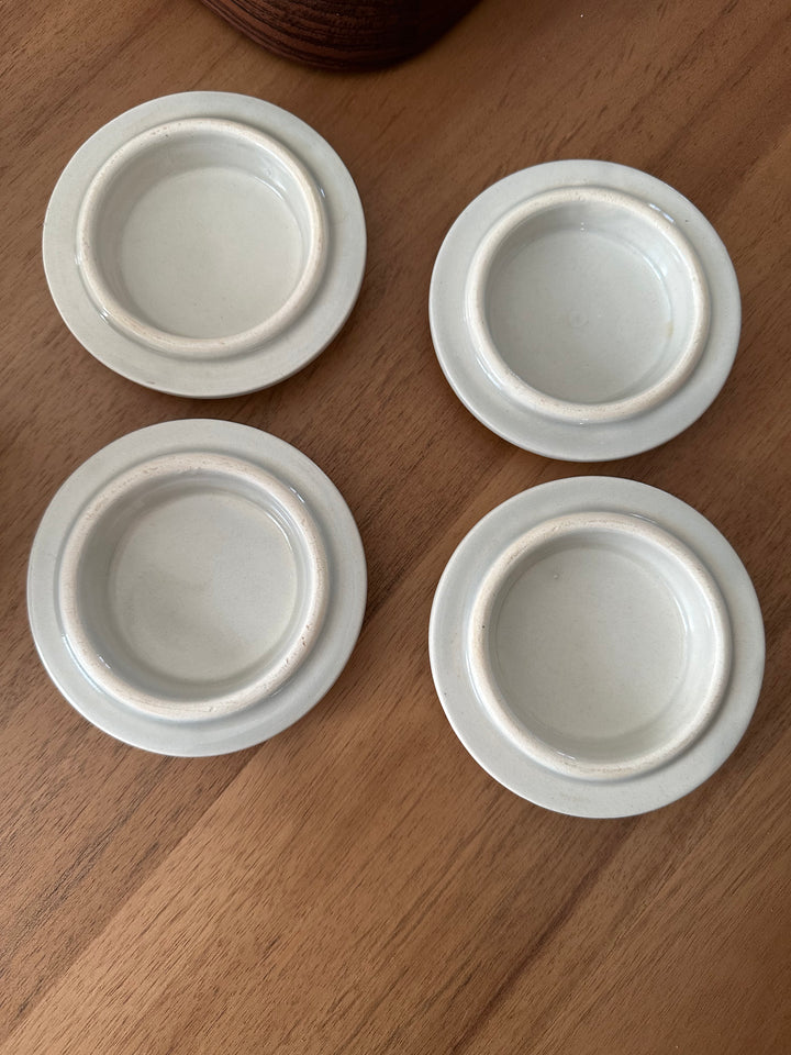 - Coloris : tons pastels de rose, vert, jaune, mauve, rouge, à noter un des couvercles n'est pas assorti à sa tasse contrairement aux 3 autres