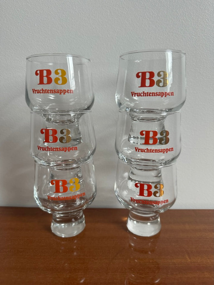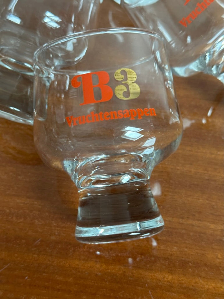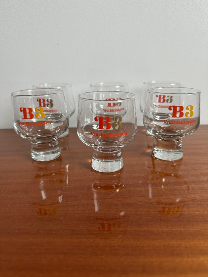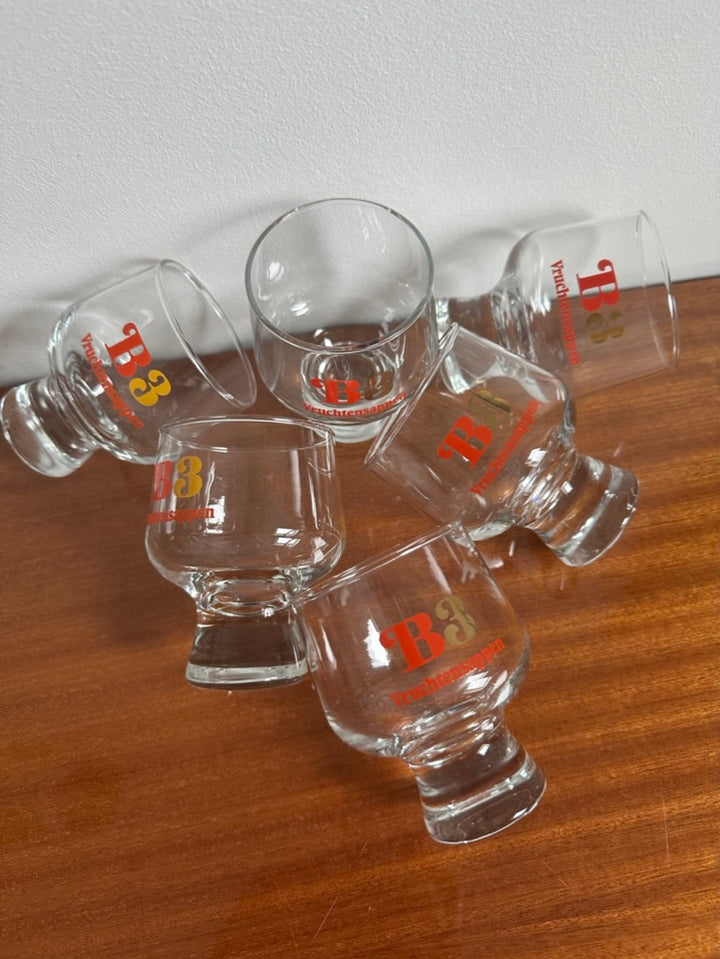 - Ensemble composé de 6 verres à jus des années 80, attribué à la marque hollandaise Vrumona, aux inscriptions B3 - 4 dorés et 3 jaunes
