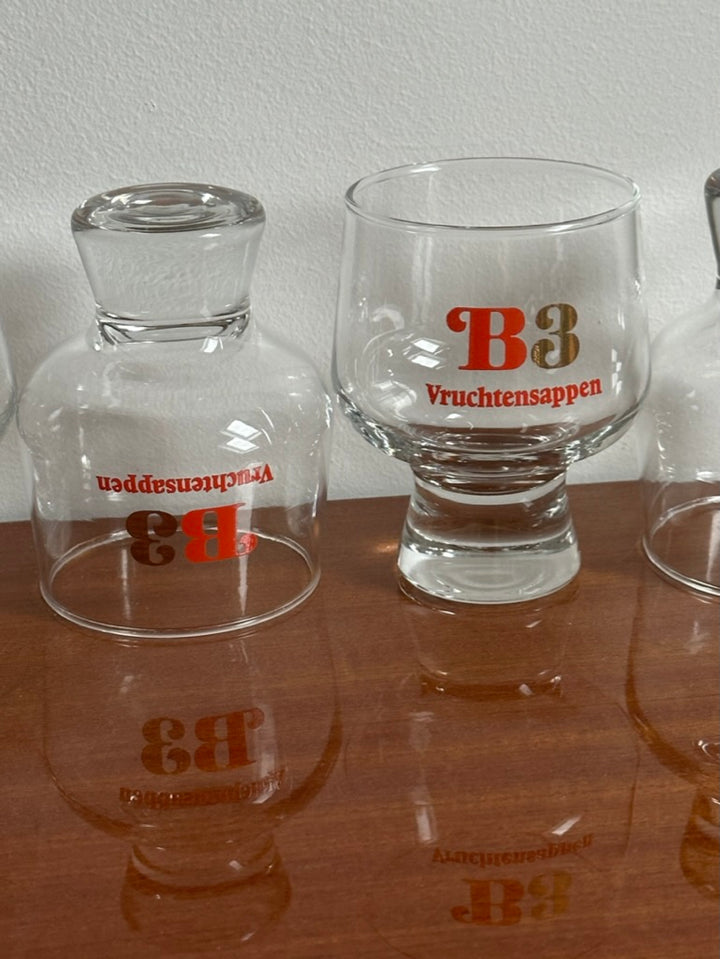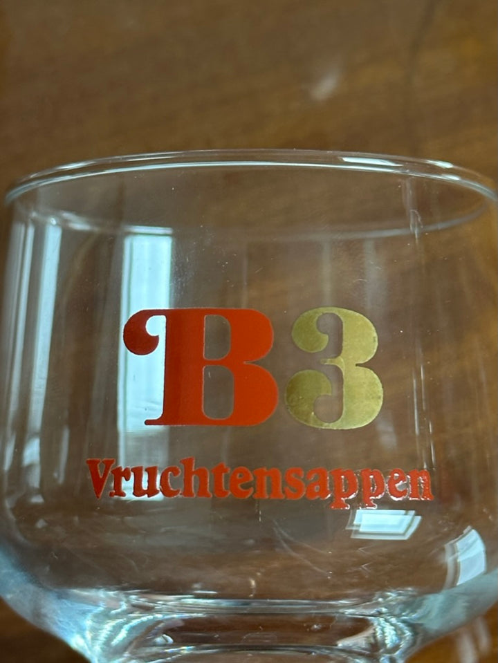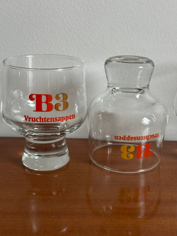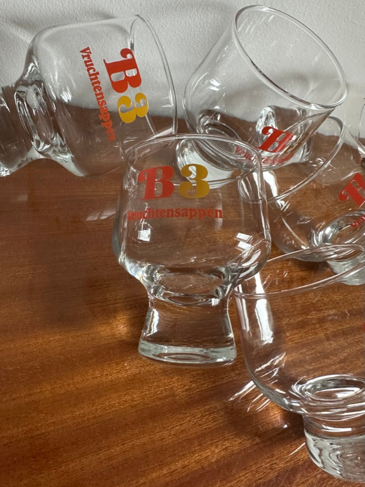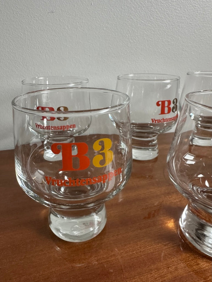 - Ensemble composé de 6 verres à jus des années 80, attribué à la marque hollandaise Vrumona, aux inscriptions B3 - 4 dorés et 3 jaunes